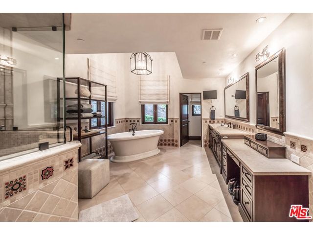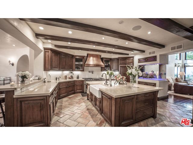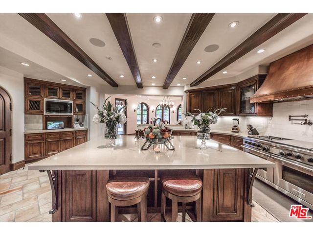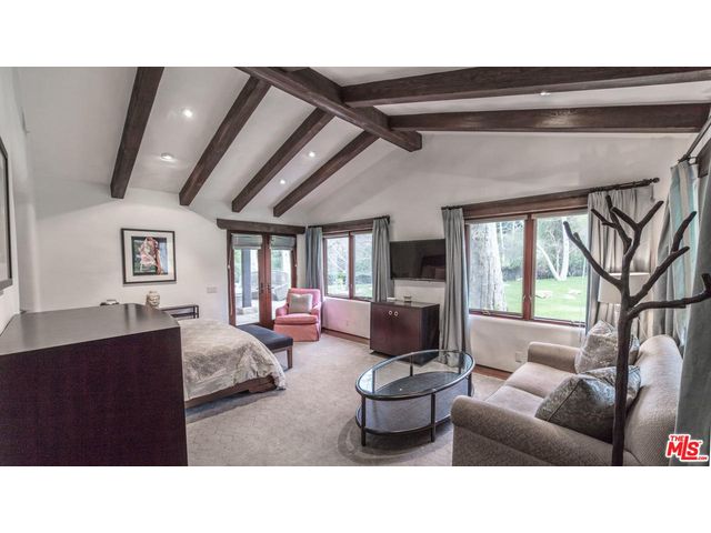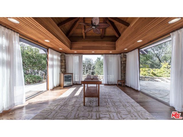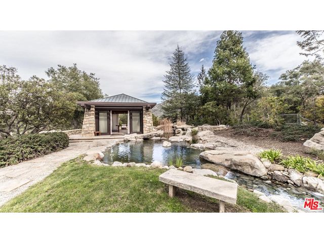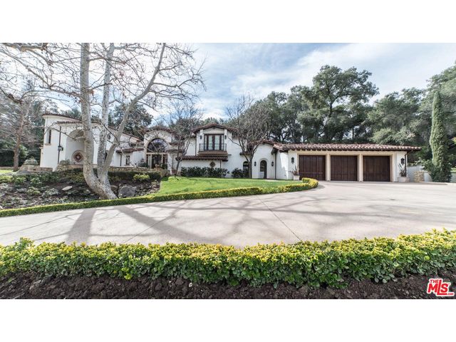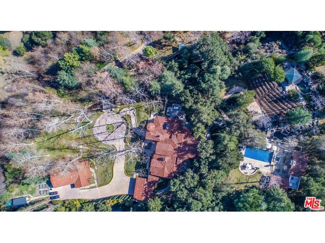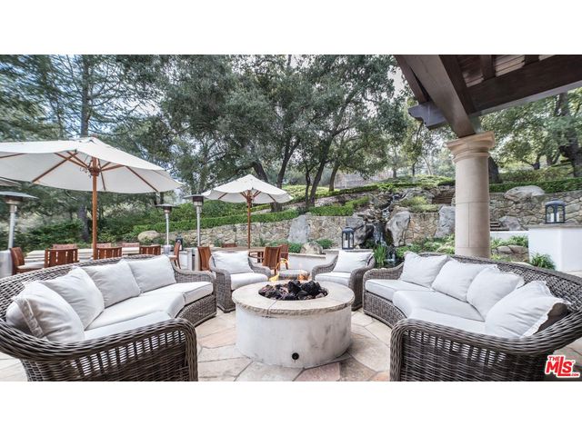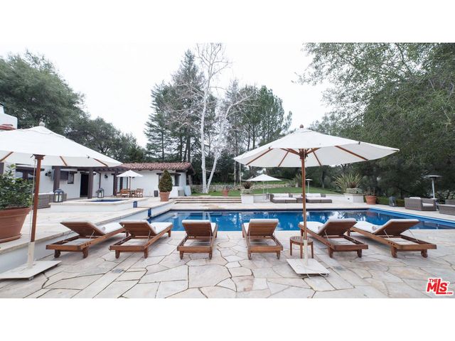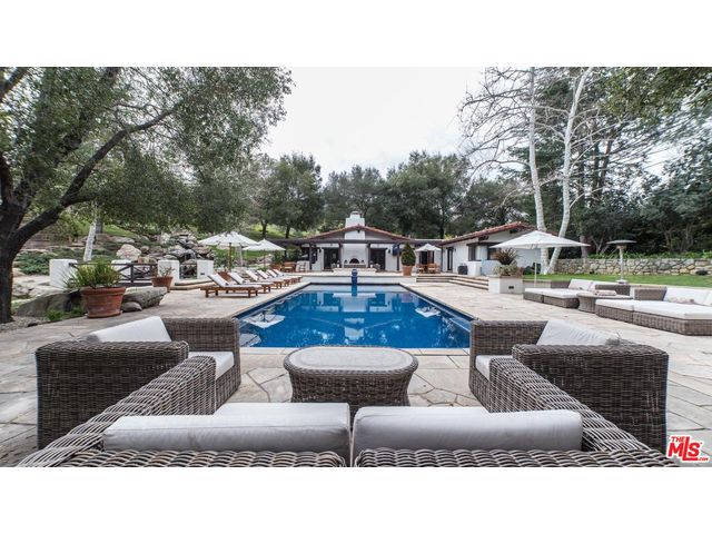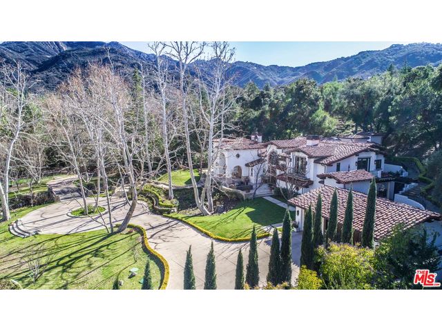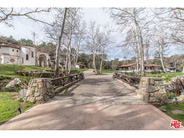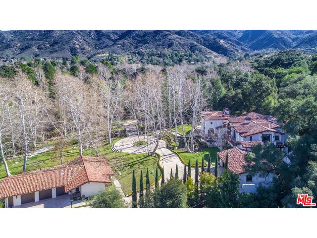 Incredible private, gated compound on nearly five acres, minutes from beautiful Malibu beaches. Completely renovated inspired by Santa Barbara architecture, enjoy complete privacy and park like grounds of this unique, awe inspiring estate. The main house is approximately 9,659 square feet and includes every amenity and will impress the most discriminating client. Carved limestone mantels and old world custom tile grace five fireplaces. Features include hand hewn walnut floors, alder wood beam ceilings and custom chandeliers. Extra amenities include a guard house, home theater, game room, wine cellar, two-story library, outdoor living room with kitchen, and barbecue. Two large guest houses and a separate meditation teahouse and full gym. A total of five bedrooms and eight bathrooms. A resort style mosaic pool and spa, limestone patios, Koi pond, waterfall, vineyard, and organic gardens. Breathtaking views and minutes from incredible shops and restaurants of Calabasas and Malibu.