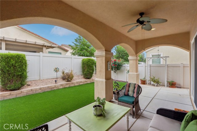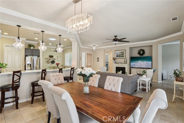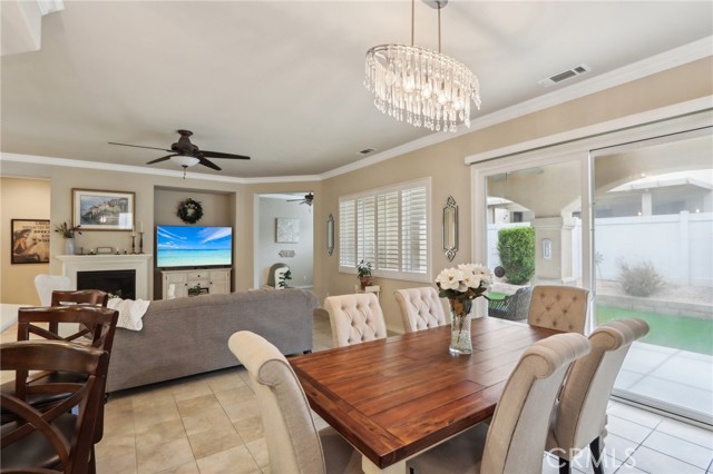Welcome to resort-style living in the highly sought-after Solera Diamond Valley by Del Webb, a premier 55+ active adult community. This beautifully upgraded 2-bedroom, 2-bath home with a den offers 1,851 sq. ft. of thoughtfully designed living space perfect for entertaining or relaxing in comfort. Step through the elegant glass inlay front door into a light-filled, open concept floor plan adorned with crown molding, plantation shutters, and stylish tile flooring. The inviting living room features a cozy fireplace, ideal for cooler evenings. The chef’s kitchen includes a charming breakfast nook, ample pantry space, upgraded fixtures, and a solar tube that fills the room with natural light. Ceiling fans are installed throughout for year-round comfort. Retreat to the spacious primary suite, complete with a large walk-in closet, soaking tub, step-in shower, and dual vanity. A versatile den provides the perfect space for a home office, hobby room, or guest space. Enjoy indoor-outdoor living with a California-style covered patio, surrounded by professionally landscaped grounds featuring low-maintenance artificial turf in the back—ideal for relaxing or entertaining without the hassle. The community amenities are second to none, offering something for everyone. Stay active in the state-of-the-art fitness center with a walking track, or enjoy socializing in the library, billiard room, or theater room. Two outdoor pools, an indoor pool, bocce ball, tennis, and pickleball courts provide endless opportunities for recreation. With a busy calendar of daily, monthly, and annual events, this vibrant community is the perfect place to enjoy your next chapter. Don’t miss out on this incredible home and lifestyle!!