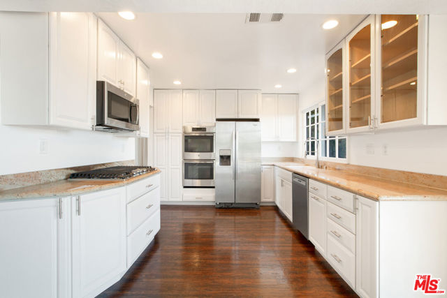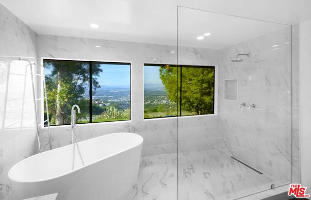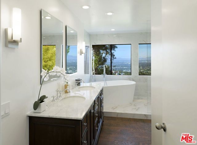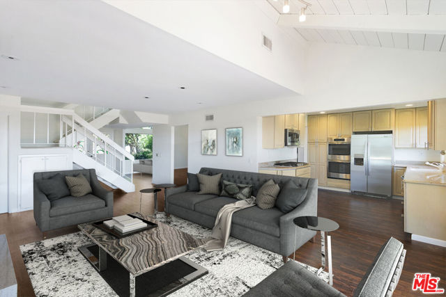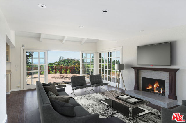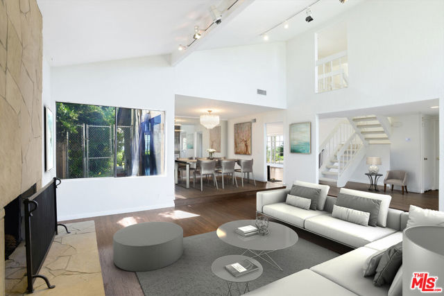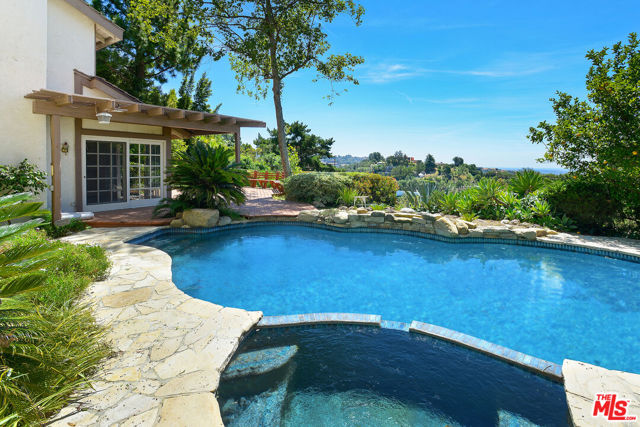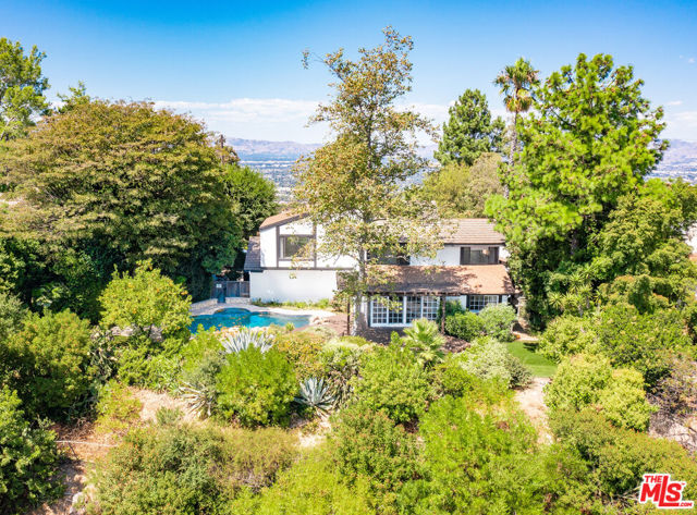 Sitting on top of the world in BHPO is this gated. private 4 bed, 3 bath home (primary +2 up, 1 down). Expansive BH to DTLA views to the south and SF Valley views to the north from every room. Spacious primary suite with vaulted ceiling, clerestory windows, great primary bathroom with double vanities, walk-in closet and freestanding marble bath/shower looking out to panoramic views. All SS kitchen appliances, hardwood floors downstairs and w2w carpeting upstairs. Full size laundry, attached garage. 2 FPs, huge deck and sparkling pool/spa area epitomizing the SoCal Lifestyle!