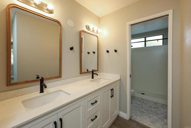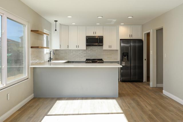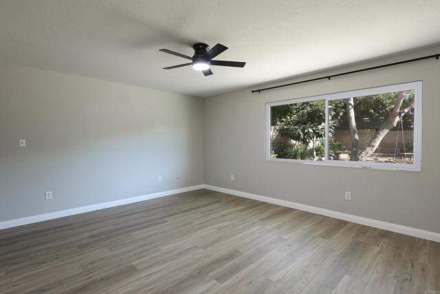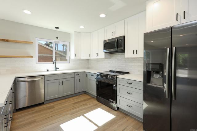 Recently updated single story home in the heart of Carlsbad! Situated on an oversized lot spanning almost 1/4 acre. New turf in the front yard. Modern garage door and newer exterior paint. A covered porch leads to your double front door entry. New vinyl floors throughout. No carpet! Charming brick fireplace in the living room and a large open living space - endless possibilities for furniture, lounging, play area and more. On the west side of the home, you have the kitchen which has been completely renovated with brand new soft close cabinetry, quartz countertops, a gorgeous tile backsplash, new dishwasher, new stove, and new light fixtures. The kitchen opens up to a sunny dining space with natural light beaming through the windows during the day. Dedicated laundry room with washer and dryer included. Epoxy floors in the garage with newer water heater. Attic storage with a stair pull down for easy accessibility. On the left side of the home, you have linen storage and cabinetry in your hallway, 2 sizable guest bedrooms and guest bathroom, and a large master suite. All bedrooms and the living room have newly installed ceiling fans. Updated bathroom fixtures. The property also has SOLAR! Huge savings on your power bill. Whole house fan for energy efficiency. Large flat backyard space - ideal for gardening, kids, and pets. Located just 15 minutes from the beaches and desirable attractions - Legoland, Flower Fields, The Village of Carlsbad. Top rated schools. Call today!