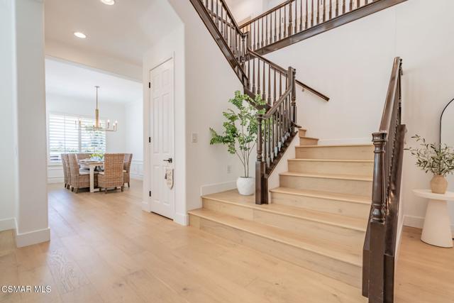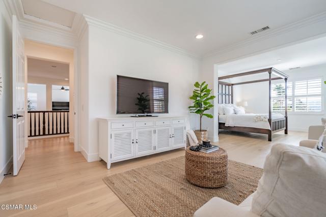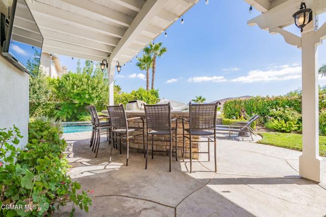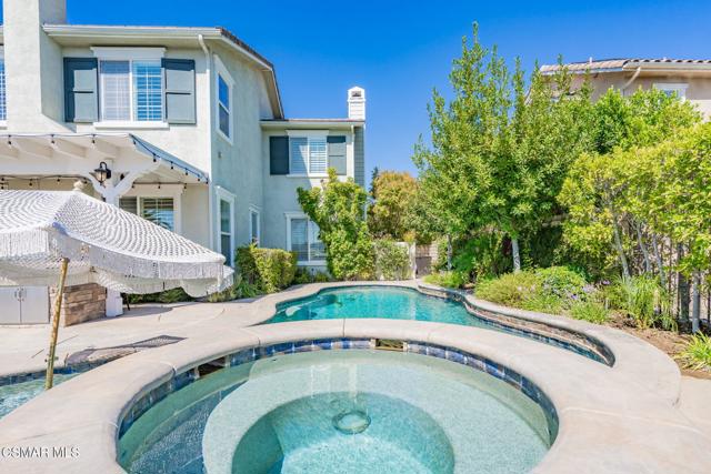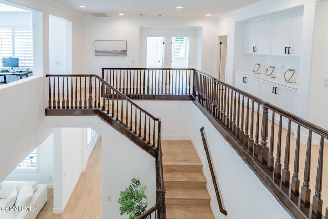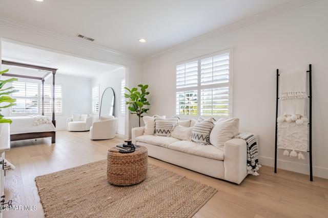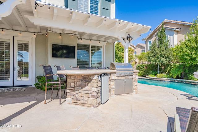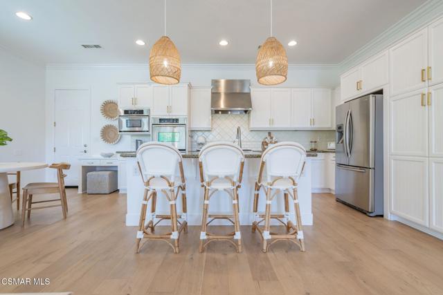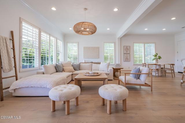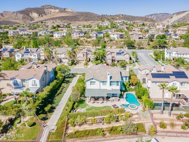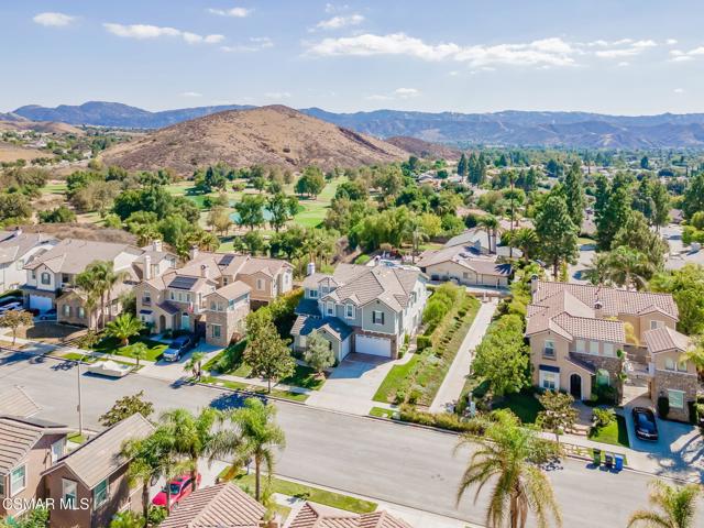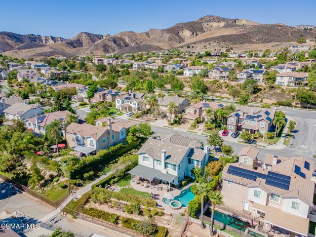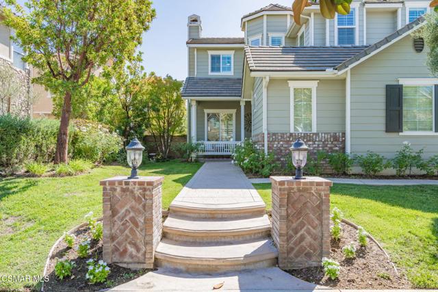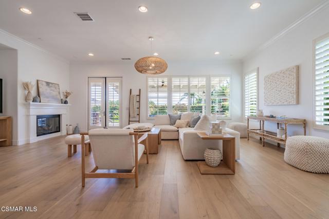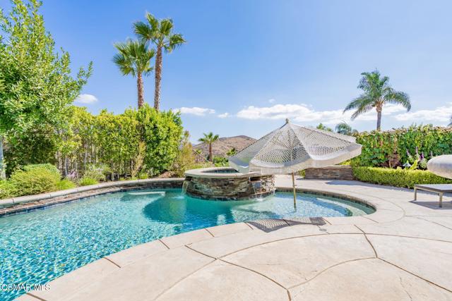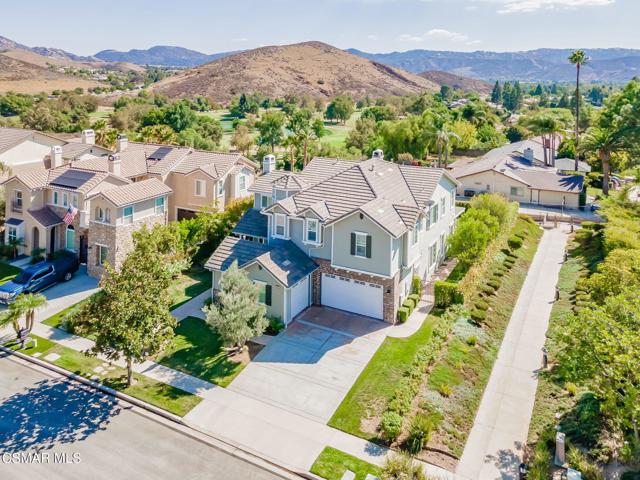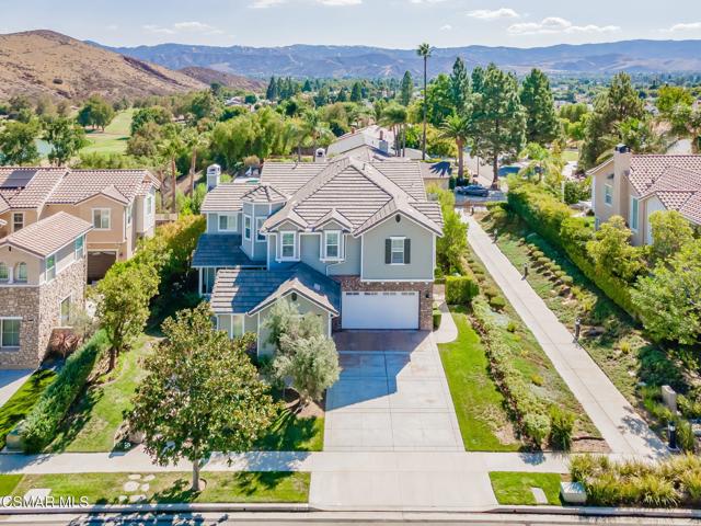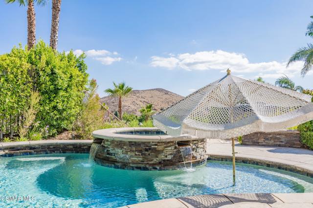 Located in the prestigious Wild Horse Canyon neighborhood, this exceptional property is the perfect blend of luxury, style and comfort, featuring a bright and beautiful open floor plan with white oak flooring throughout, a spacious great room with fireplace and chefs kitchen with bead board cabinets, stainless steel appliances and a large center island for gathering with family and friends. Elegant details abound, from soaring ceilings and crown molding to plantation shutters. This home offers a main floor bedroom or office, a full bath, formal living room with fireplace, and a large dining room. The luxurious primary suite offers a true retreat, complete with separate bedroom and sitting area and a spacious en-suite bathroom and 2 walk-in closets. Upstairs features a spacious loft, additional office nook, 3 upstairs bedrooms and a full hall bath. The expansive backyard is an entertainer's paradise, boasting breathtaking mountain views, as well as views of Simi Hills Golf Course. This outdoor oasis features a resort-style pool and spa with waterfalls and a beach entry, a covered patio with charming string lighting for al fresco dining, built in bar area with BBQ and refrigerator, a cozy fire pit area, over 20 fruit trees along back slope, lush and mature landscaping that provided privacy and tranquility. 2 car attached garage, as well as detached one car garage, both with ample built in cabinetry. This home has it all...comfort, style and luxury!