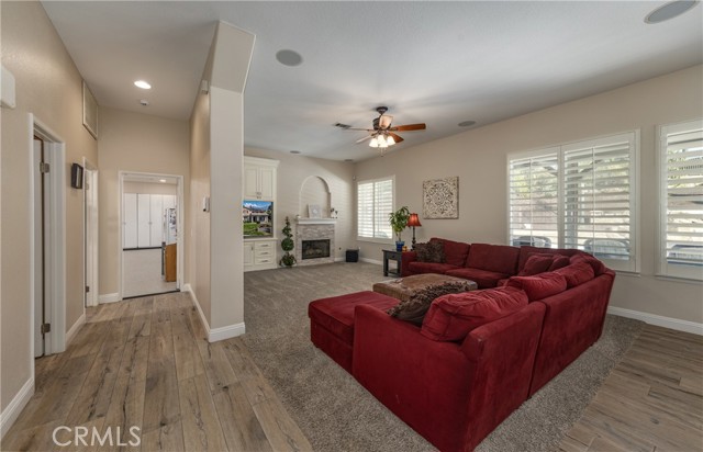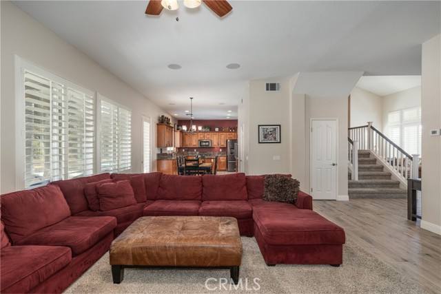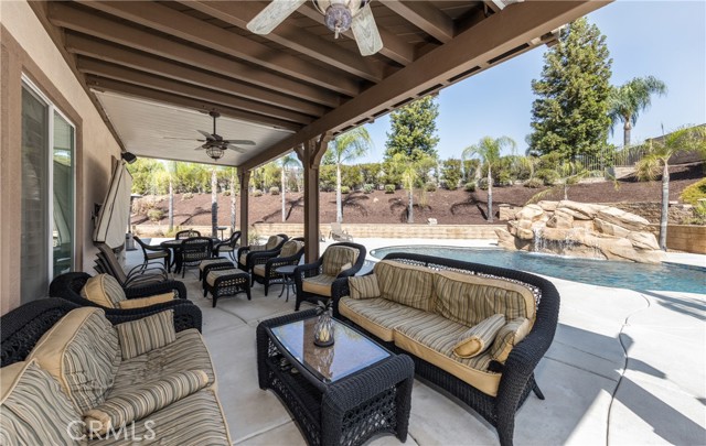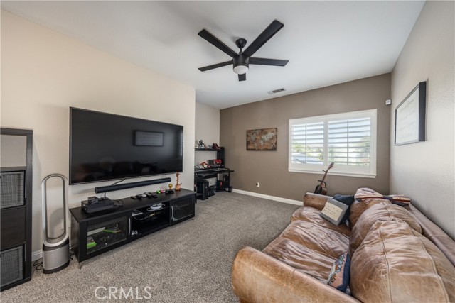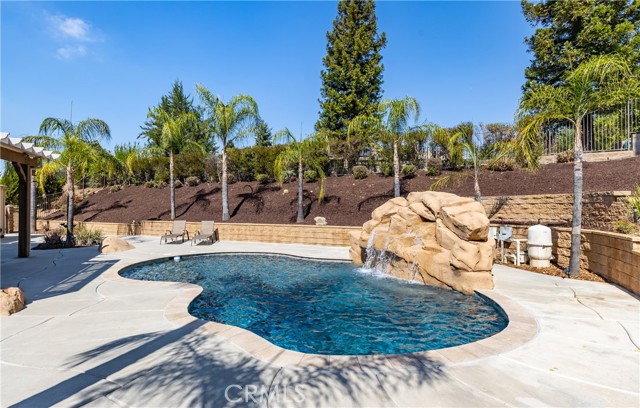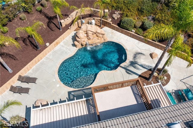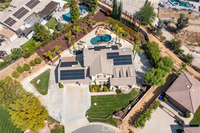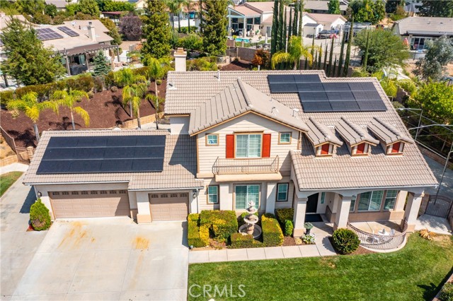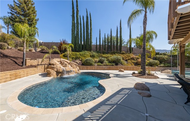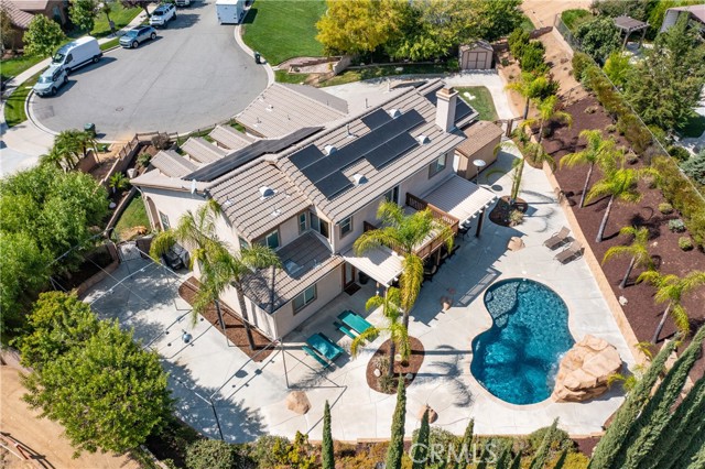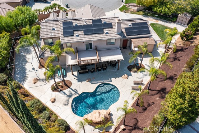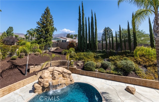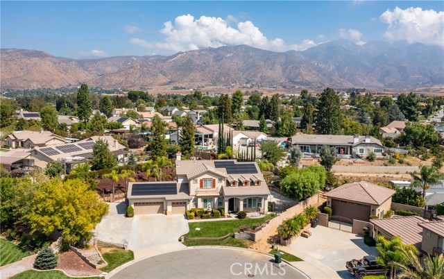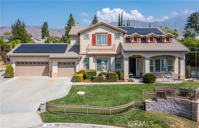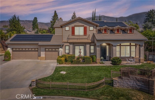 Turnkey Schafer Ranch Home Nestled in Yucaipa’s North Bench with Mountain Views and NO HOA! This beautiful residence sits at the end of a peaceful cul-de-sac on a spacious half-acre lot. Offering over 3,000 sq. ft. of well-designed living space, this 3-bedroom , 3-bath home showcases exceptional attention to detail and pride of ownership throughout. Inside, you’ll find a formal living room and separate formal dining room featuring a custom built-in hutch, a private office/den (potentially a fourth bedroom), and a spacious family room with a cozy fireplace and additional custom built-in cabinetry. The gourmet kitchen is a chef’s delight with granite countertops, abundant cabinetry, double convection ovens, new stainless steel appliances, and an informal dining area that flows seamlessly to the family room and beautiful covered patio—perfect for entertaining or everyday living. Upstairs, an open loft provides the ideal space for a playroom, media area, or home office. The spacious primary suite offers a tranquil retreat with a private balcony to enjoy morning coffee and sweeping mountain views. The luxurious ensuite bath features a soaking tub, walk-in shower, dual sinks, and a large walk-in closet, combining comfort and elegance. Additional upgrades include new plantation shutters throughout, a pool replastered in 2022, and a new 42-panel owned solar system installed in 2023 for energy efficiency and savings. Enjoy your favorite music anywhere with the built-in surround sound system, both indoors and out. New tile flooring and carpet throughout adds modern appeal and easy maintenance. Step outside to your private backyard oasis featuring a sparkling pool with tranquil waterfall, lush landscaping, batting cage (missing the netting) and breathtaking mountain views. The oversized 3-car garage provides ample storage, shelving, workspace, and attic access, while the charming she shed offers a quiet getaway or creative studio space. There’s also ample RV parking, perfect for your recreational vehicles, boat, or trailer. This exceptional property perfectly blends comfort, functionality, and luxury—truly a place to call home!