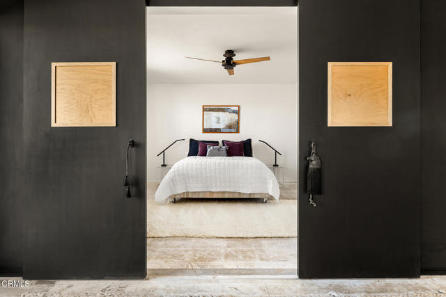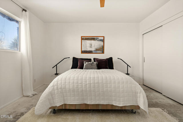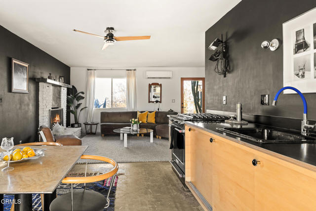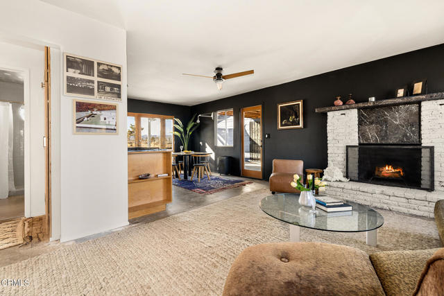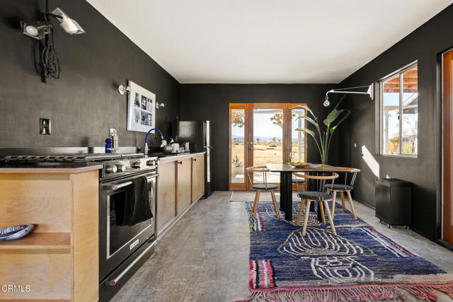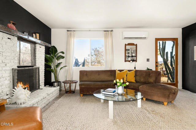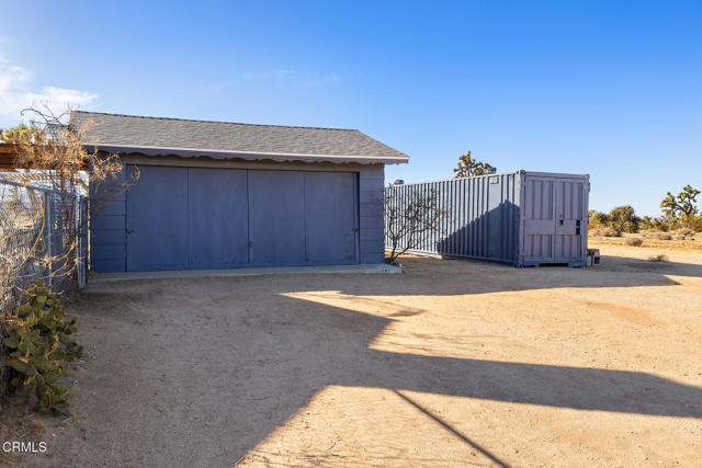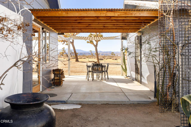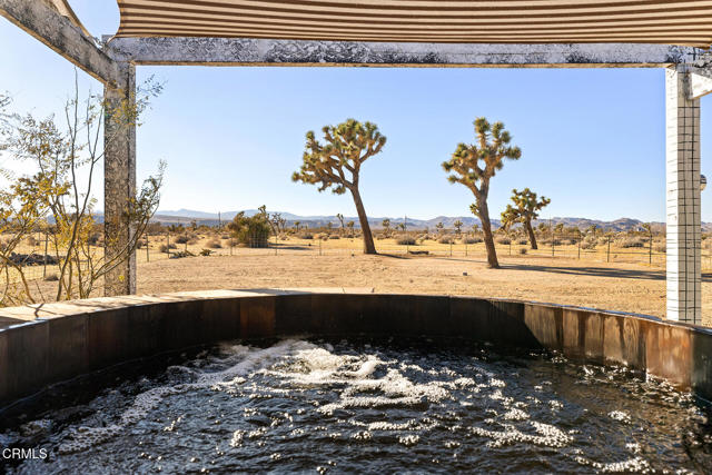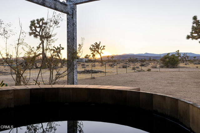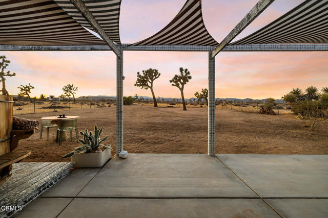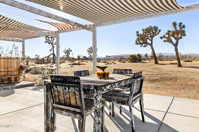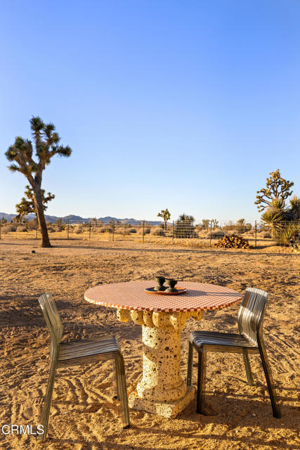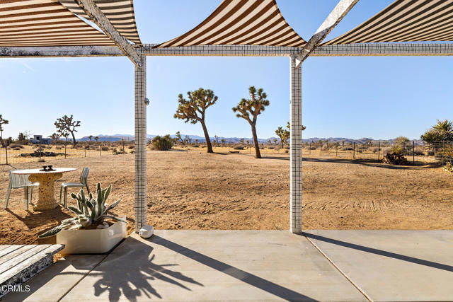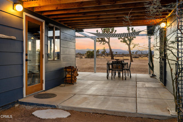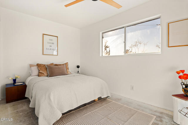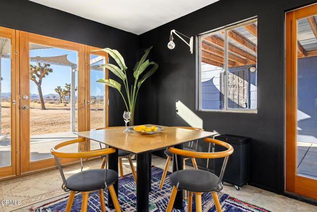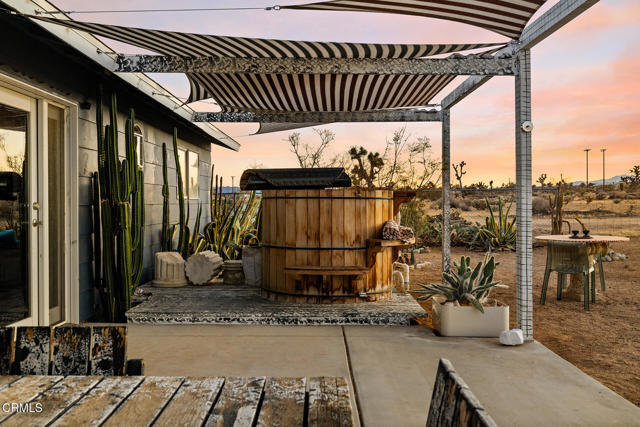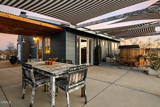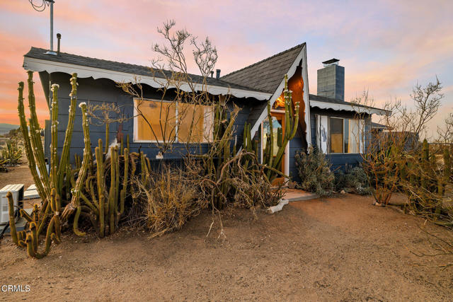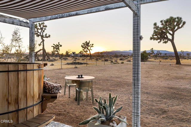 Welcome to 1624 Balsa Ave--a one-of-a-kind creative retreat, owned and updated by an artist and interior decorator. This stylish two-bedroom, one-bath home perfectly balances comfort and character. The open living space is bathed in natural light and features a charming wood-burning fireplace, custom maple cabinetry, and a stunning glass door with screened sidelights that lead to a serene back patio. Rustic concrete floors and custom woodwork throughout the home add warmth and a distinct desert vibe. The remodeled bathroom is a showstopper, with hand-applied silver-leafed walls, a spacious walk-in shower, and a rare vintage Kohler sink paired with a Waterworks faucet. Solar panels help keep utility costs low, while a newer mini-split system and vintage maple ceiling fans in every room ensure year-round comfort. Additional upgrades include a new 200-amp electrical panel and a recently replaced roof. Set on 2.5 acres of natural beauty, the property offers a sanctuary-like environment where you can observe indigenous wildlife, including quail, rabbits, and birds, amidst mature landscaping, white sage plants, and vibrant birds-of-paradise trees. The property also boasts a cedar hot tub for soaking up the breathtaking sunsets, a two-car detached garage, and a 40-ft shipping container for storage or creative projects. Partially furnished and ready to inspire, this thoughtfully designed desert gem is waiting to welcome you home.