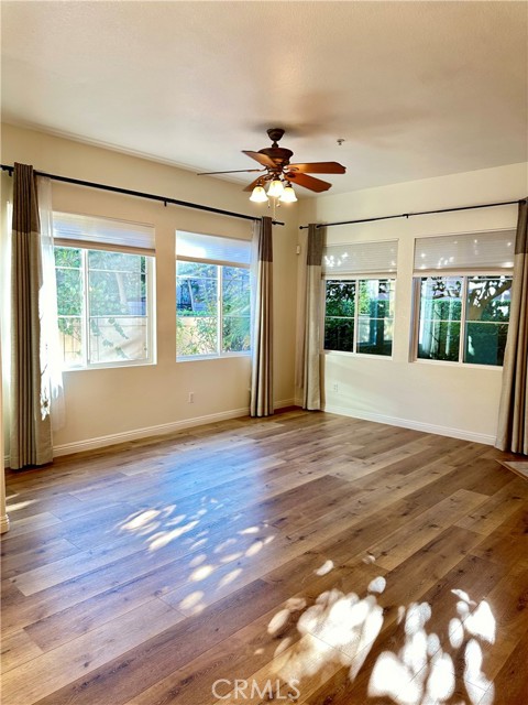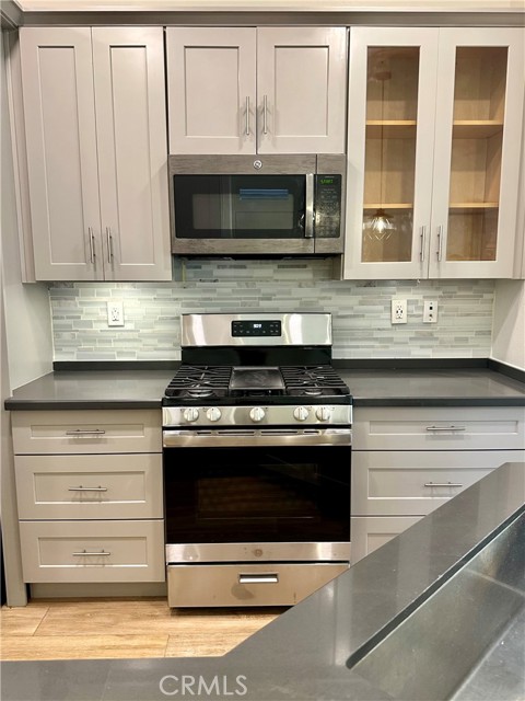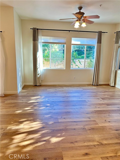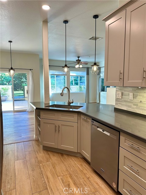 Available for immediate move-in! Gorgeous 3 bedroom + 2 ½ bathroom townhome for rent in ideal Newbury Park location. Beautifully remodeled with brand new designer flooring and paint throughout. This corner unit is spacious and has lots of natural light. Kitchen has quartz counters, soft close cabinets, upscale lighting, a full pantry with pull out drawers, stainless steel appliances including a refrigerator and brand new GE 5 burner stove. Cheerful living room with fireplace and dining room with sliders leading to the patio. Upstairs are 3 bedrooms and the laundry room with washing machine and dryer included. The primary suite has an attached bathroom with dual sinks, both shower and soaking tub, and walk-in closet. The two secondary bedrooms have plenty of natural light and share the hall bathroom. Large stamped concrete patio is perfect for entertaining and is surrounded by fruit trees and grapevines, with views of lush greenbelts. Attached 2 car garage with direct access to the kitchen. Dual paned windows and central A/C. Community pool/spa and open green areas.