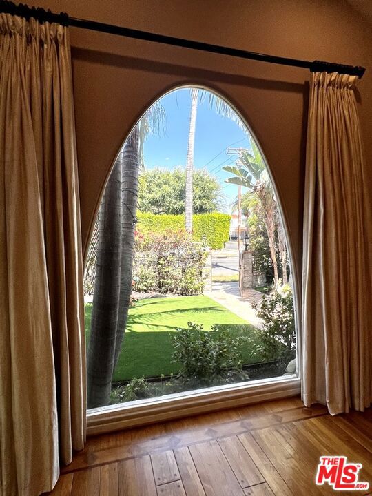 This classic Spanish home is situated on one of the most desirable streets in Beverly Grove, just steps away from the area's top-rated restaurants, shops, and the Beverly Center. With 4 spacious bedrooms( 2on Suite) and 3.5 bathrooms, this Spanish gem features a gorgeous 20-foot coved ceiling and hardwood floors throughout. The living room is equipped with a surround sound system and a cozy fireplace, creating the perfect space for relaxation and entertainment. The large renovated cook's kitchen is a chef's dream, featuring brushed granite countertops, an island, stainless steel appliances, ample cabinet space, and a breakfast area. The dining room opens up to a beautiful outdoor entertaining space with a built-in fire-pit and speakers, perfect for hosting gatherings. The enormous primary suite boasts a vaulted ceiling, double vanity, soaking tub, and double walk-in closets with built-ins. The bathroom is wired for a flat panel TV and features speakers in the shower. French doors lead to a private outdoor space, allowing for a tranquil and peaceful retreat. The property is fully gated with bougainvillea and hedges, providing ample privacy. The lush and professionally landscaped yard features artificial grass and charming fruit trees. Additionally, the property includes a detached 2-car garage with direct street access and plenty of street parking. Overall, this unique and beautiful property offers the perfect combination of luxury, comfort, and convenience.