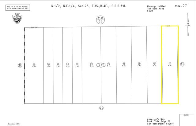 8-acre property with mountain views. Land is 15 minutes from Joshua Tree and 27 minutes from Palm Springs. Build your dream home and enjoy the cooler temperatures Morongo Valley has to offer. Property contains a 400 ft deep well.There is a utility pole on the property.APN:0584271110000Parcel Status:A | ACTIVEParcel Type:0 | REAL PROPERTYProperty ID:-Use Code:0002 | WATER WELL SITE 04Resp Group:D | REAL PROPERTYDistrict:16 | JOSHUA TREETax Status:1 | ASSESSED BY COUNTYResp Unit:RES | RES ZONE(MAX 14 UTS)&USE EX HPC/MHM(1-14 UTS,CHURCH)Land Type:05 | SINGLE FAMILY RESIDENTIALLand Access:2 | PUBLIC UNPAVEDLand Size:07 | 7.001 TO 14.000 ACRES