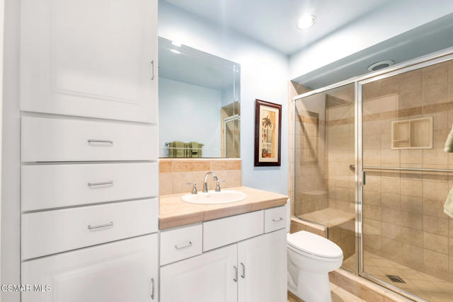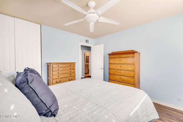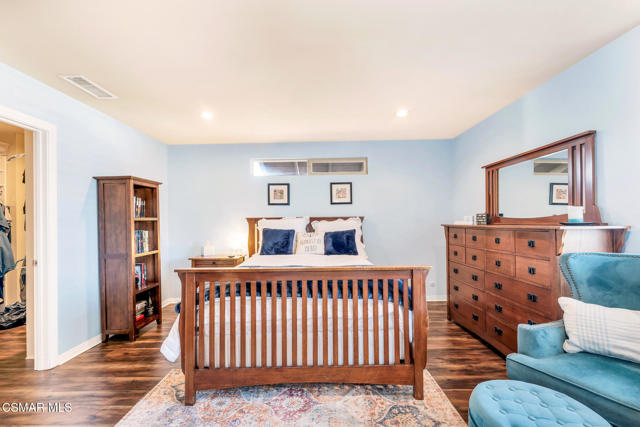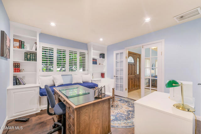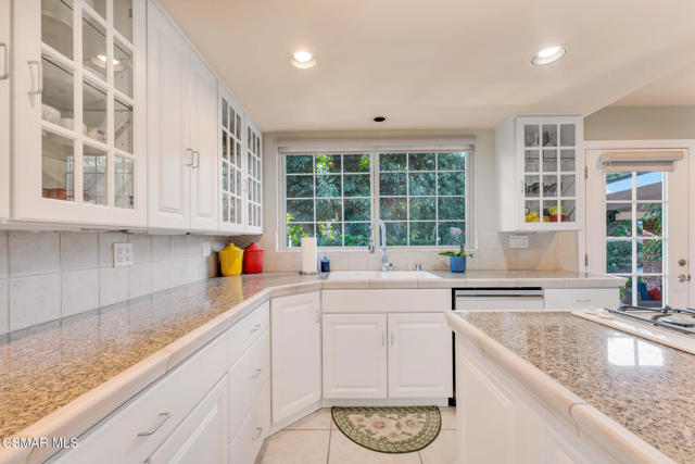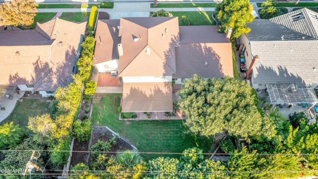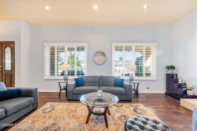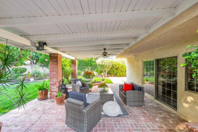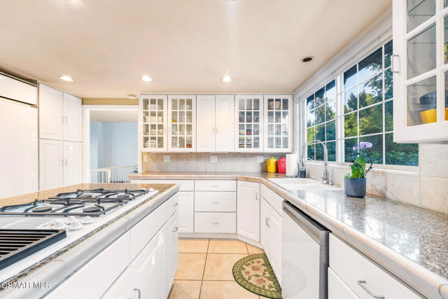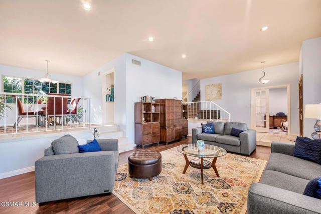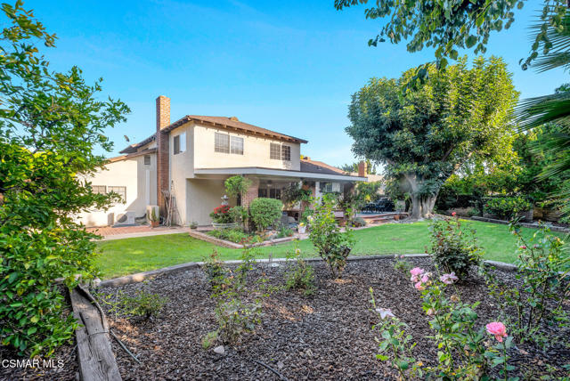 Beautifully maintained and rich with character, this 5-bedroom, 3-bath Fountainwood home offers approximately 2,535 sq. ft. of living space on an 8,712 sq. ft. lot with a 3-car garage. Blending comfort, style, and functionality, it's ideally situated in one of North Central Simi Valley's most established neighborhoods. Curb appeal shines with a brick-lined driveway and walkway, lush green landscaping, and a full covered front porch with a sitting area--perfect for morning coffee or evening relaxation. Inside, you'll find bright, inviting interiors with neutral-toned walls, plantation shutters, and recessed lighting in many rooms. The tri-level floor plan flows seamlessly from a sunken living room with a stacked-stone fireplace to an elegant dining room highlighted by a chandelier and natural light. The home offers two downstairs bedrooms, including one that is currently set up as a home office with glass French doors, built-ins, and dual entry points--providing flexibility for guests, extended family, or work-from-home needs. The thoughtfully designed and updated kitchen showcases white cabinetry, granite-tiled counters, and a generous island with a gas cooktop and grill, convenient storage niches, and sitting space at one end. Display-glass cabinets, double ovens, a built-in refrigerator, recessed lighting, tile flooring, and a built-in wine rack with adjoining breakfast area make this kitchen a centerpiece for gatherings. A few steps down from the kitchen, the spacious family room offers a second fireplace, built-ins, a wet bar, and a large sliding door leading to the backyard. This lower level also features a bathroom with a shower and a laundry room with garage access for added convenience. Upstairs, two secondary bedrooms share an updated hall bath with built-ins and decorative tile finishes, while the private primary suite features a walk-in closet and a luxurious en suite bath with a corner soaking tub, decorative tile surround, and a curved glass-enclosed shower with a Kohler body-spa system. The home is equipped with a dual air-conditioning system--one unit for the lower level and another for upstairs--with separate zones for the primary suite and the two secondary bedrooms, providing efficient and customizable comfort throughout. The private, lush backyard feels like an outdoor sanctuary--complete with mature shade trees, two brick patio areas (one beneath a shade tree and another fully covered with a ceiling fan and brick columns), a flower-filled fountain, raised brick planters, roses, and fruit trees. With its open layout and relaxing ambiance, this space is ideal for entertaining or peaceful outdoor enjoyment. Ideally located in the highly regarded Fountainwood neighborhood, this home is conveniently near local elementary and middle schools, community parks, recreation, shopping, and dining--capturing the best of North Central Simi Valley living with a welcoming sense of home and community.