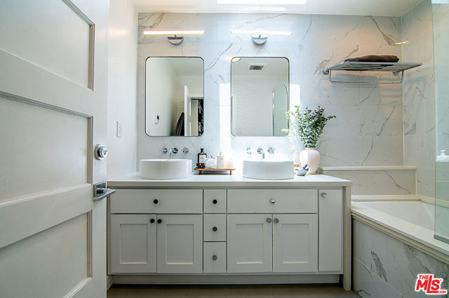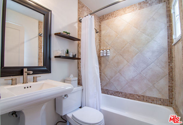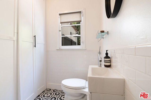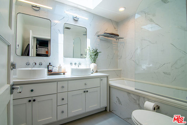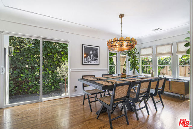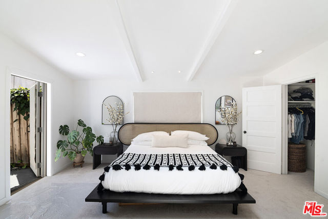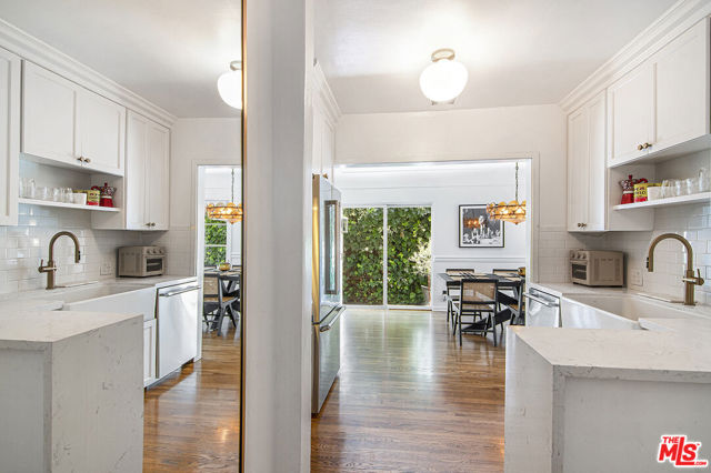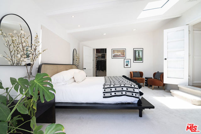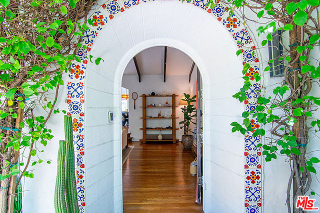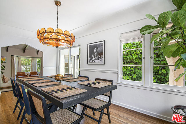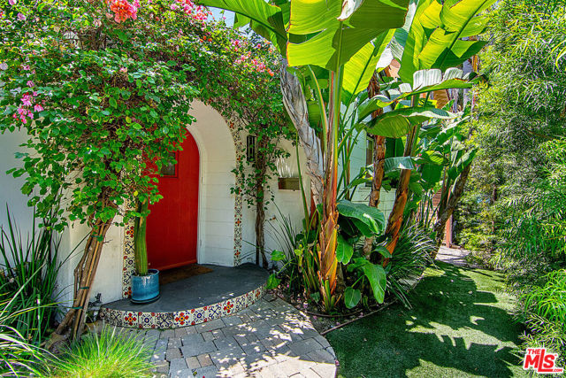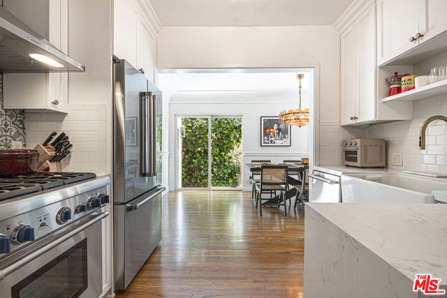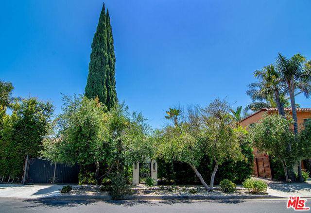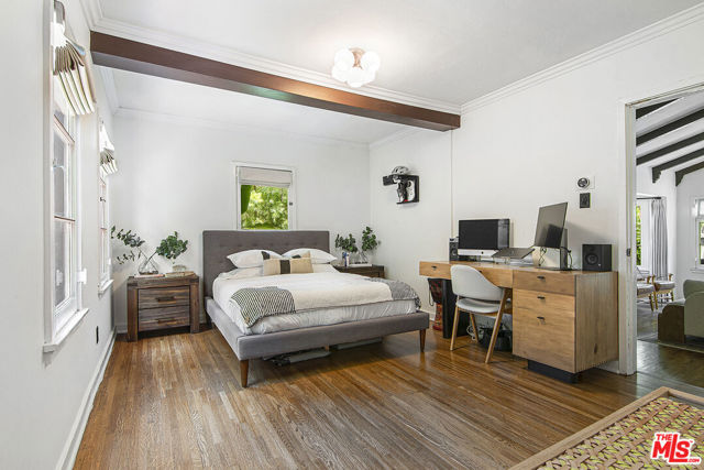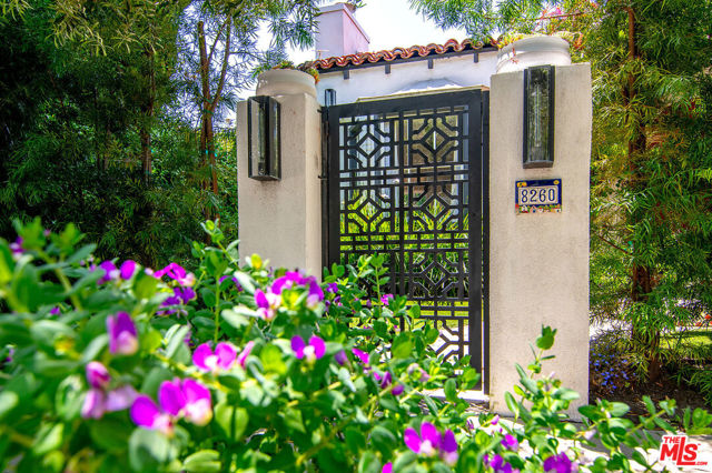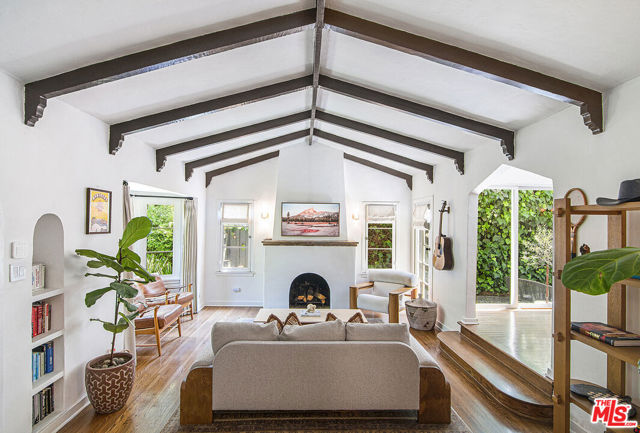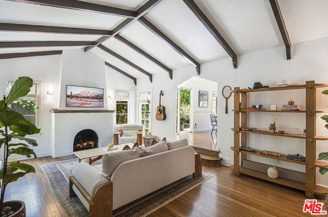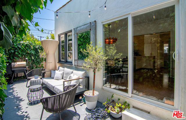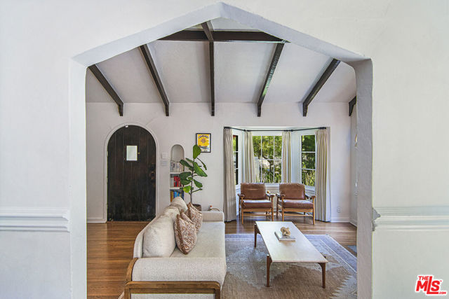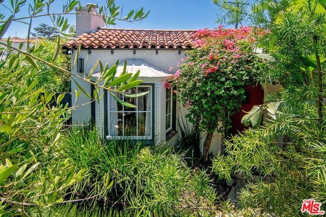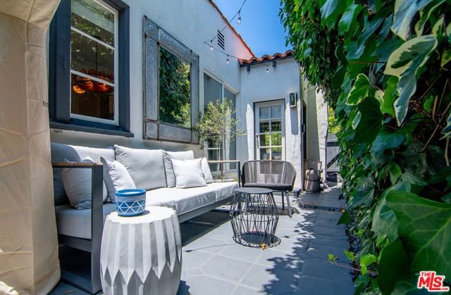 STYLISH SPANISH BUNGALOW IN BEVERLY GROVE. Enter this fabulous pied-a-terre in the heart of Beverly Grove through a gated and hedged front garden into a grand step-down living room with vaulted, beamed ceiling, bay window and fireplace. The formal dining room with sliding glass doors opening to a private patio and outdoor lounging area adjoins a beautifully remodeled chef's kitchen with quartz counters, pantry, Thermador stove with vented hood, Bosch stainless steel appliances, and a Blanco cast iron farm sink. A luxurious primary suite provides direct access to the outdoor patio and boasts a vaulted ceiling, walk-in closet, fully remodeled bath with a large marble shower and soaking tub, and dual vanity. Additional features include a generous ensuite guest bedroom, additional powder room, central AC, Nest thermostat, multiple skylights, hardwood floors, crown moldings, custom window-coverings, private driveway with EV charger, ideal location steps from dining and shopping on Third Street, the Grove, the Beverly Center and Melrose. LAR2 Zoning may allow for additional living space.