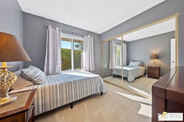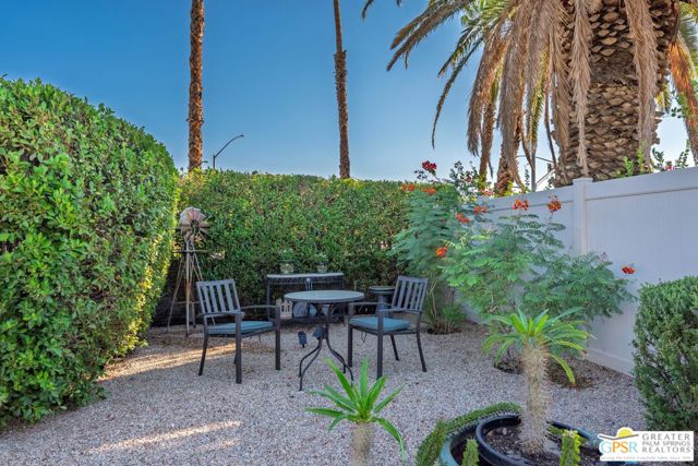 A charming single-level, 3 BR, 1 BA condo, tucked into a quiet culde sac within the gated Sunrise Palms community. The generously sized yard is perfect for outdoor entertaining, gardening or simply unwinding in complete privacy and tranquility. Dual paned Milgard sliders and windows, HVAC replacement in 2022, 3 ceiling fans and a kitchen Solatube skylight all contribute to cost saving energy efficiency. Beautifully renovated bathroom with Terazzo floor, an updated kitchen, garage and private laundry makes this condo both comfortable and convenient. Resort-style amenities include basketball, tennis and pickleball courts, 8 refreshing pools and relaxing spas to unwind and rejuvenate. It's well maintained and this is your opportunity to own an affordable year-round home or part time desert getaway!
