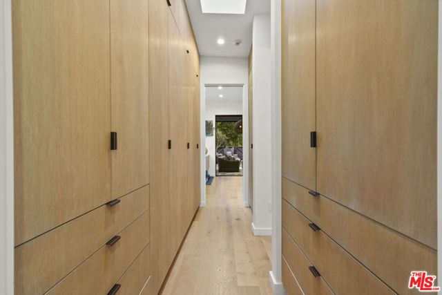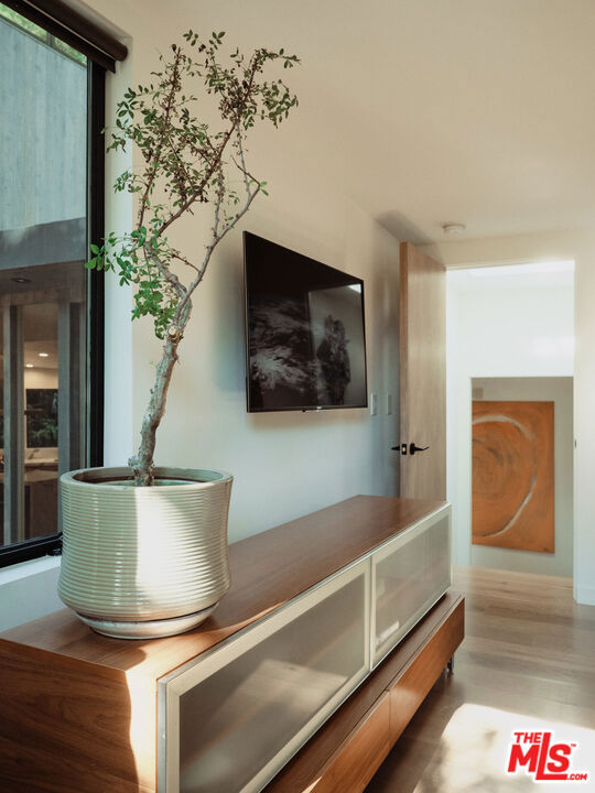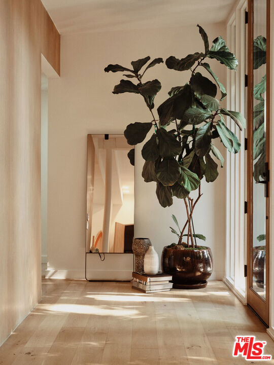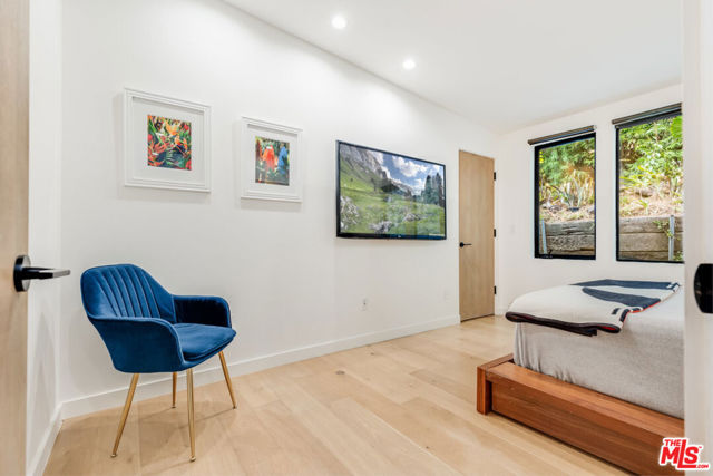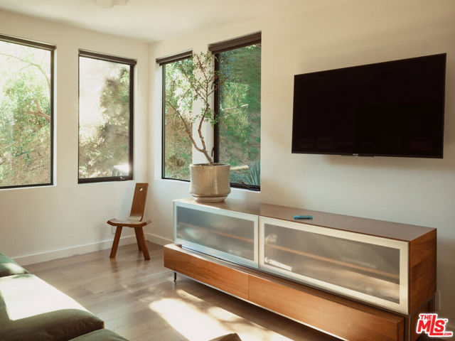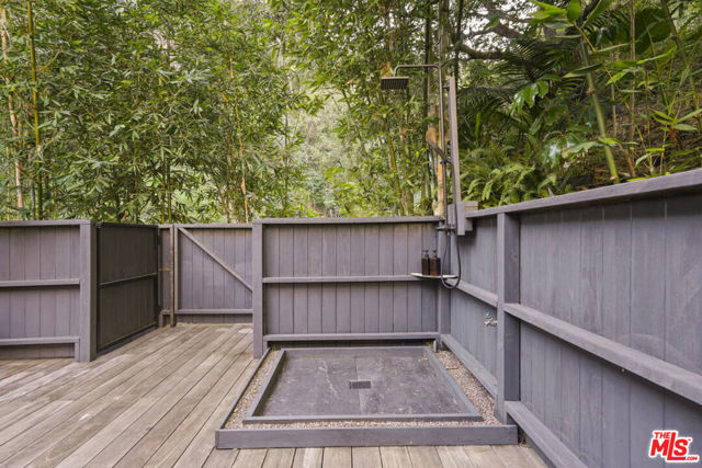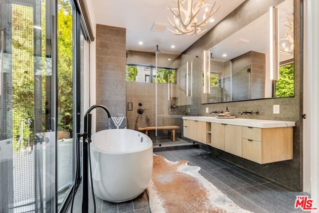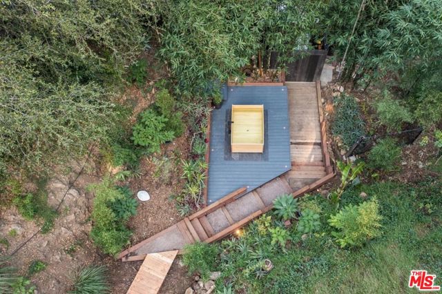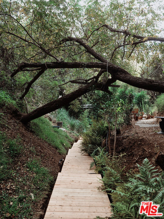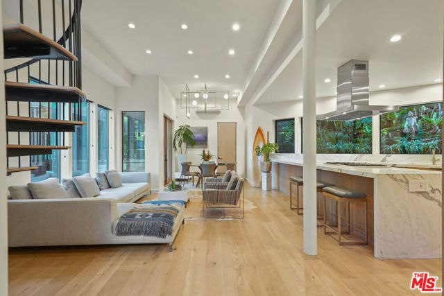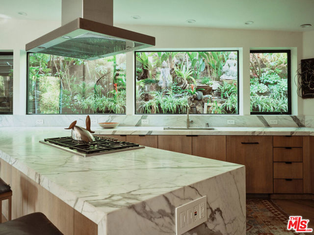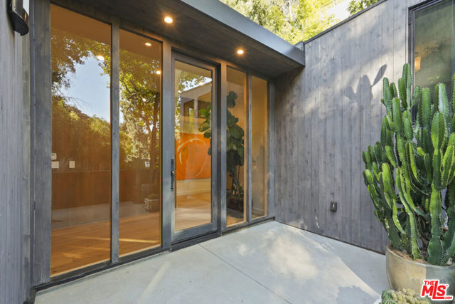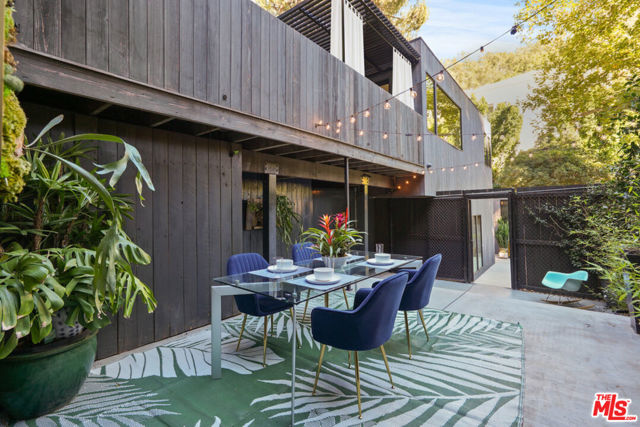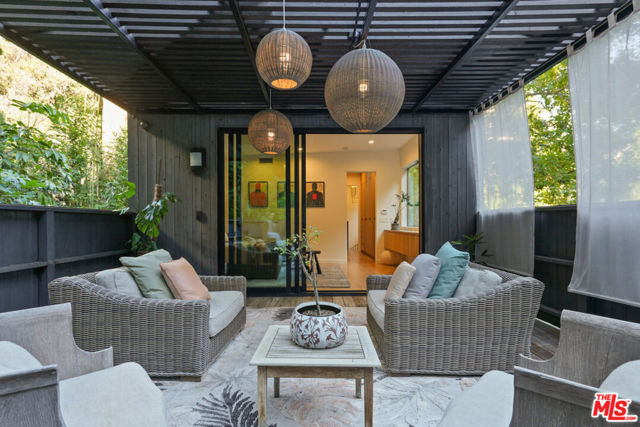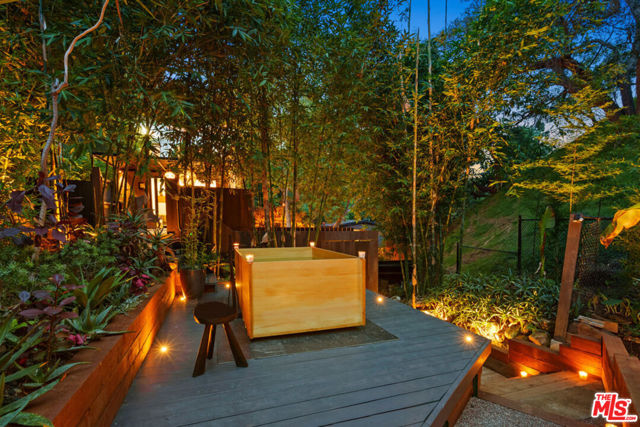 Journey into tranquility and serenity at this hidden gem nestled in the canyons of Beverly Hills, sited at the foothills of the Santa Monica mountains. Meticulously renovated in 2017 by globally acclaimed architect Alex Pettas, AIA formerly of Marmol Radziner, this Wabi-Sabi inspired residence seamlessly blends nature with refined living. Experience the harmonious connection with the outdoors through abundant indoor-outdoor living spaces. Admire the solid white oak floors that grace the interior. Feast on the gourmet kitchen, adorned with its waterfall edge Carrera marble. Bask in wall-to-wall windows while enjoying views of a rare and tropical plant collection. The focal point of the dining room, a sculptural chandelier from the prestigious Italian design house Venice M, creates an exquisite atmosphere. Adjacent is a wine room, leading to a spacious patio perfect for enchanting alfresco dining amidst the alluring scent of trailing jasmine. Beyond the living room, the first floor offers two bedrooms and a bathroom showcasing Ann Saks tile and FRANKE fixtures, setting the tone for luxurious living. Ascend the steel spiral staircase to discover the primary suite, featuring two walls of custom oak closets that artfully disappear, embodying a simple yet elegant aesthetic. Unwind in the sophisticated soaker tub, complete with Airbath system jets and finished with fixtures by esteemed designer Jason Wu. The bedroom, with panoramic garden views, beckons relaxation and draws the eye out through accordion-style sliding glass doors. Once fully opened, immerse yourself in the expansive deck crafted from Ipe wood, complete with a private outdoor shower. Explore the permaculture-designed garden, where mature fruit trees, including citrus, apricot, plum, taro, and assorted berries, thrive. The western portion of the lush tropical landscape, bordered by giant timber bamboo, provides privacy and hosts an Alaskan white oak Japanese Ofuro tub designed by renowned artisan Andrew Brant. This natural sanctuary is the pinnacle of refined living that's seamlessly integrated with nature. Fully-furnished. Small pets okay.