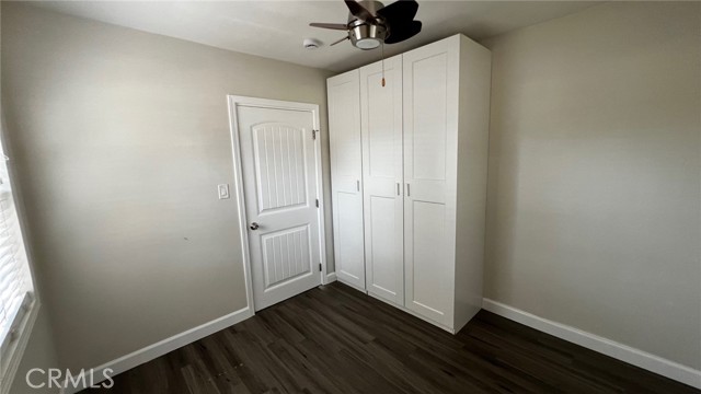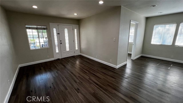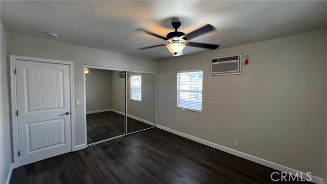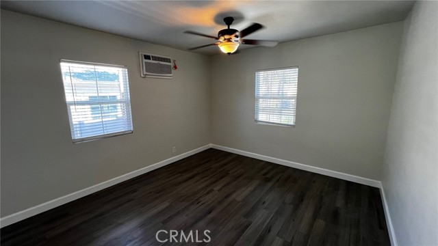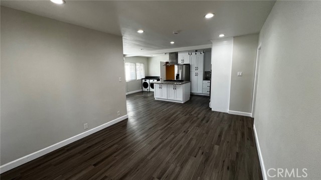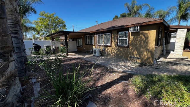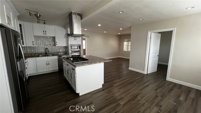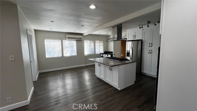 This is a warm real estate rental listing with a 4-bedroom, 2-bathroom home that highlights its key features: in-home laundry, a recently remodeled bathroom, abundant natural light, and a spacious kitchen island with a burner perfect for hosting family gatherings. It also has a white picked fence with large palm trees surrounding the home.