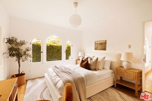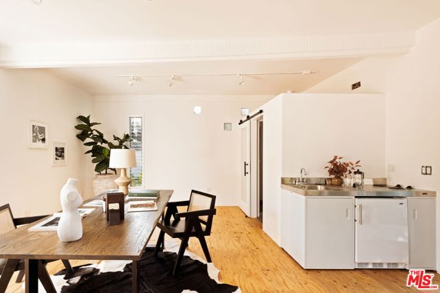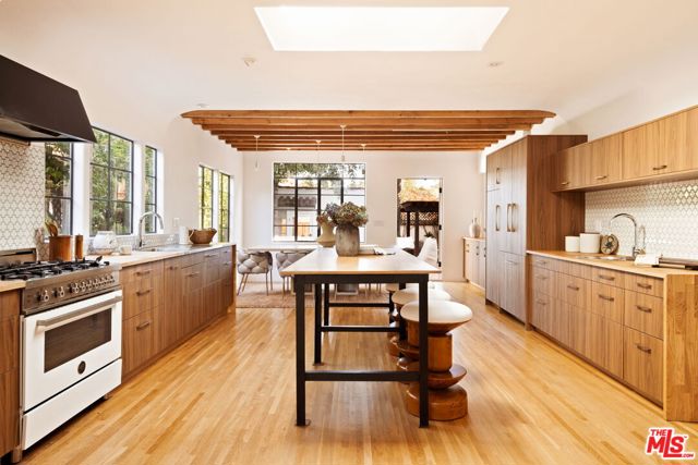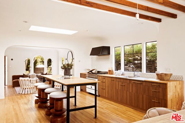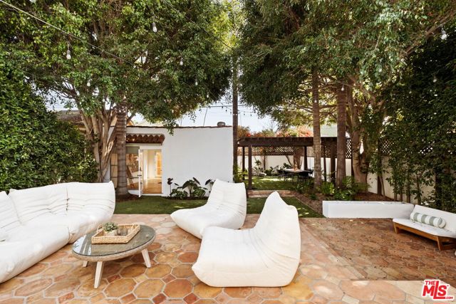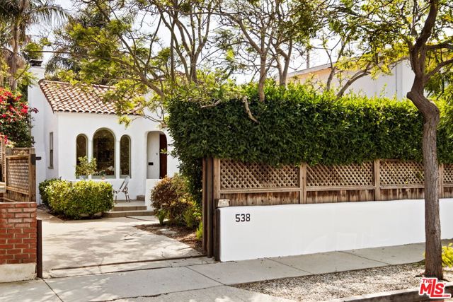 There's a quiet kind of beauty here - sunlight filtering through arched windows, soft shadows on plastered walls, and a feeling that you've arrived somewhere that instantly feels like home. This gated single-level Spanish home blends timeless charm with a modern, soulful warmth. Hardwood floors and a classic fireplace anchor the living room, softened by natural light that drifts through skylights above. The newly remodeled kitchen feels both refined and relaxed, with sleek cabinetry, beamed ceilings in the dining area, and steel-framed windows framing views of the garden. The dining area opens wide to the backyard - an outdoor sanctuary layered with terra cotta tile, mature trees, and a pergola for dining beneath string lights. French doors from the primary suite open to the same lush retreat, creating a seamless indoor-outdoor rhythm. A detached studio with kitchenette and bath offers an inspiring space for guests or creative work. Just two blocks from the shopping and dining on Abbot Kinney Blvd, 538 Westminster captures the ease and artistry of Venice living.