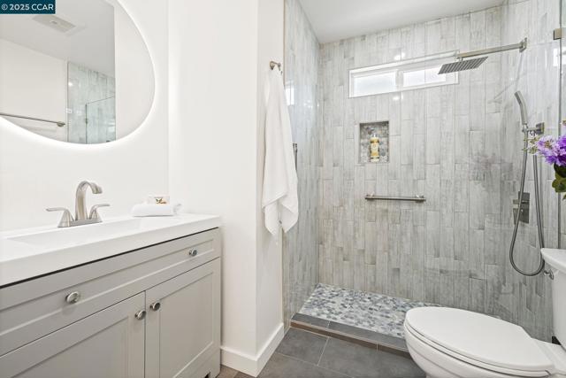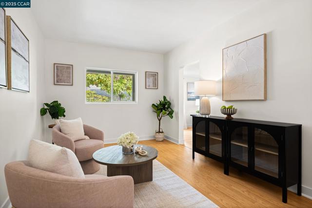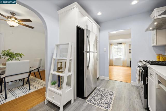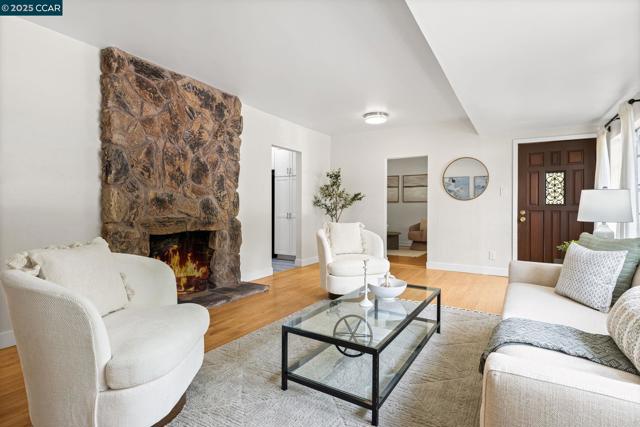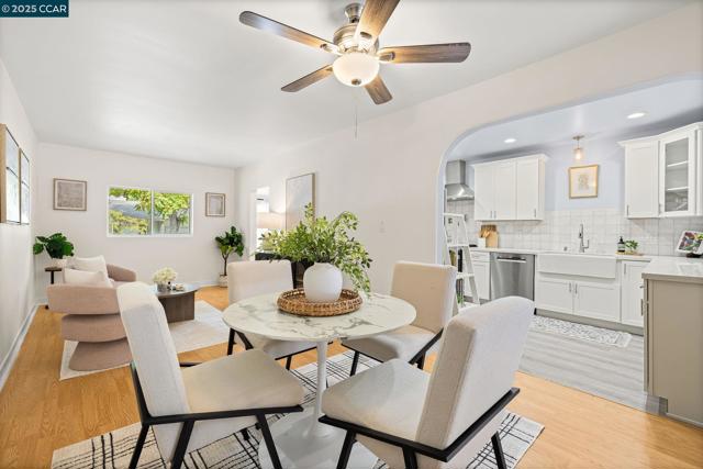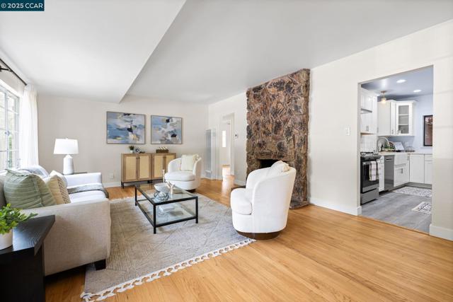 Step inside this refreshed single-story home where modern comfort meets everyday ease. The bright living room welcomes you with a wide picture window and a striking stone fireplace that anchors the space in warmth and character. Hardwood floors flow throughout, connecting the open dining area and the beautifully remodeled kitchen, where white shaker cabinets, quartz countertops, and a tile backsplash create a clean, timeless aesthetic. A gas range, stainless steel appliances, farmhouse sink, and pot filler make cooking effortless, while glass-front cabinets and open shelving add both charm and functionality. The updated bath showcases designer tilework, a glass-enclosed shower, and contemporary fixtures. Beyond the main living areas, flexible bonus rooms offer creative potential for a home office, gym, or studio. Out back, an expansive yard with a large patio and detached shed provides the perfect canvas for entertaining, gardening, or future expansion. Conveniently located near Oak Grove Plaza, De La Salle and Carondelet High Schools, multiple neighborhood parks, and freeway access to 680. Commuters will also appreciate proximity to BART and local transit, connecting throughout the Bay Area.