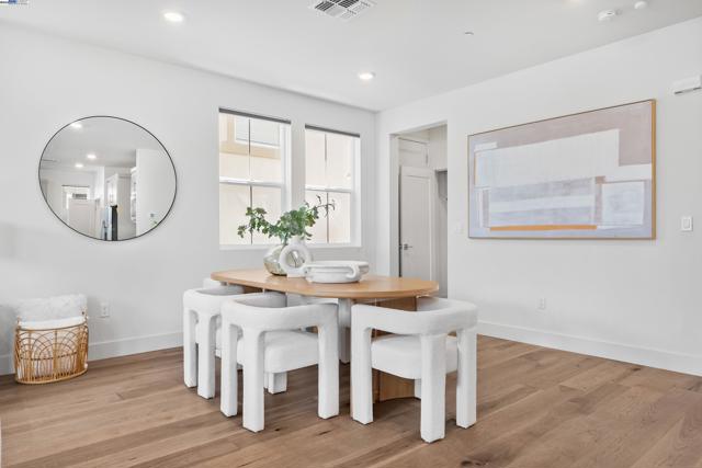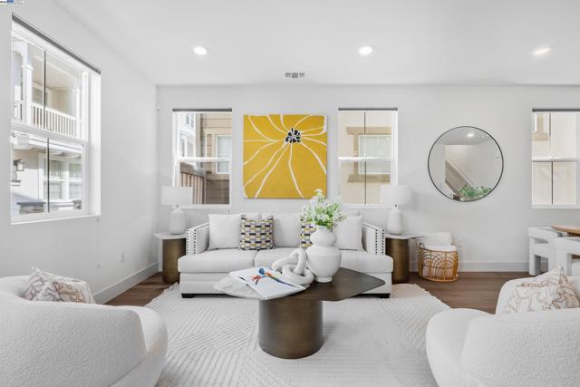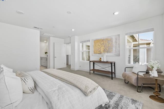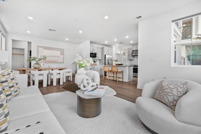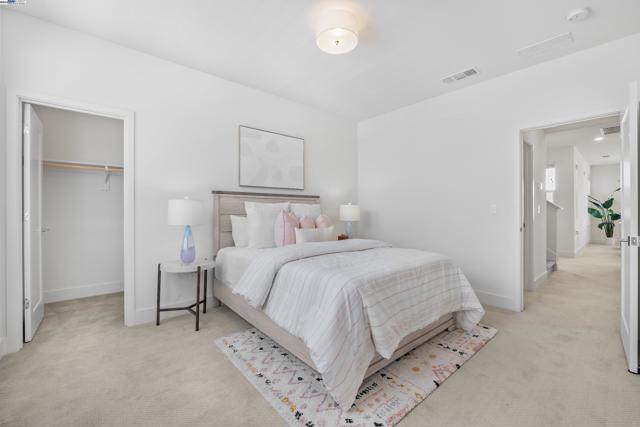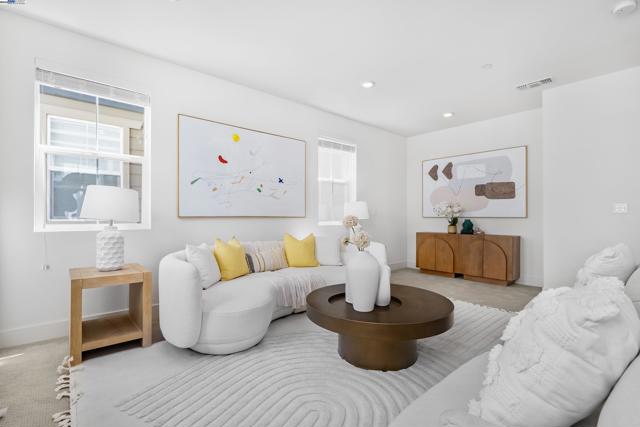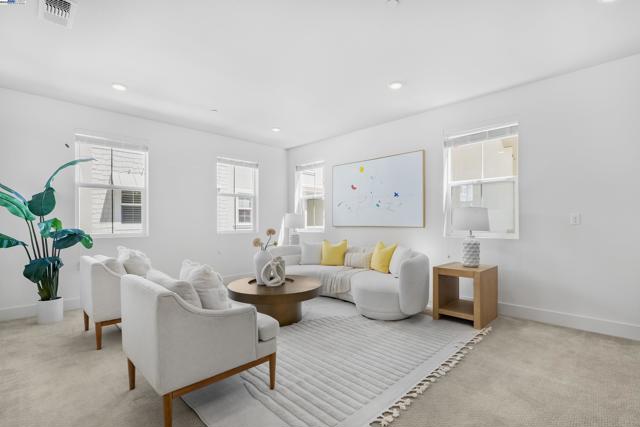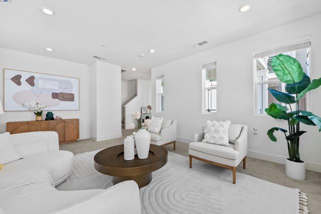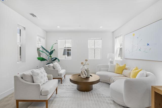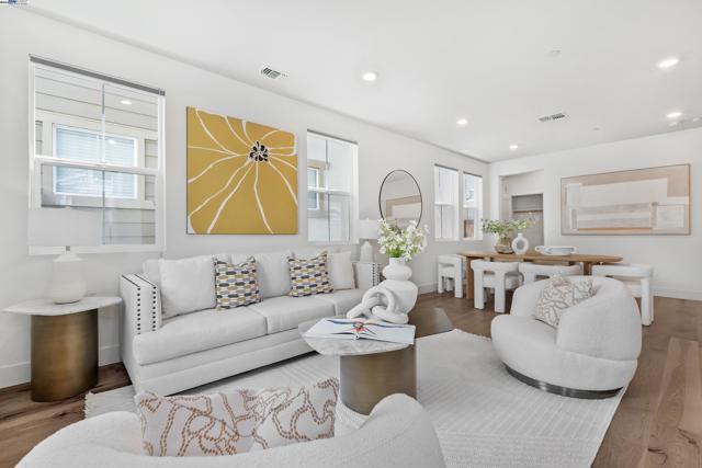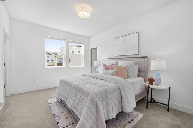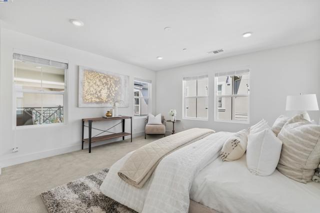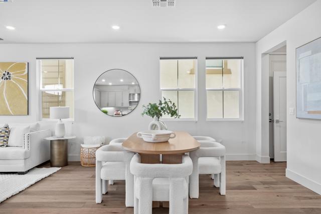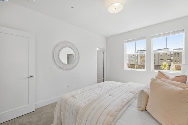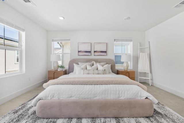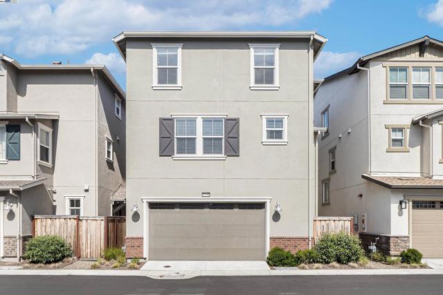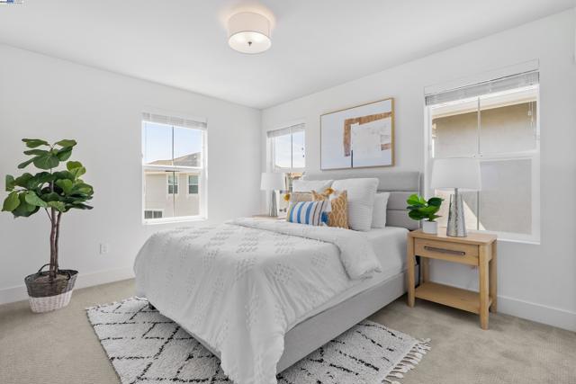 Where modern sophistication meets smart design, this impressive Newark residence boasts a spacious 2,886 SQFT of living space, perfectly accommodating its 5 bedrooms and 4.5 bathrooms. Engineered hardwood floors extend throughout the first floor. The open-concept kitchen is a chef's delight, featuring a full backsplash, quartz countertops, and top-of-the-line stainless steel appliances. Upstairs, the upgraded carpet adds a plush feel to the bedrooms, enhancing the sense of luxury. Each of the two suites offers a private retreat with its own bathroom, providing comfort and privacy. The second floor unveils a large loft, an ideal space for entertainment or relaxation. Complementing this are two generously sized patios, inviting you to enjoy the outdoors in tranquility. The home is equipped with owned solar panels that enhance energy efficiency. The Rinnai tankless water heater, Moen Flo smart water monitor, and Honeywell upgraded thermostats ensure comfort and efficiency. Bridgeway residents enjoy a host of amenities like a clubhouse, a swimming pool, dog park, and playground. Nearby National Wildlife Refuge offers open space with trails and nature to explore. Close to Meta and Tesla, among other major employers. Easy access to Dumbarton bridge and I-880.
