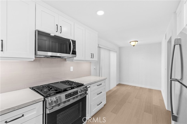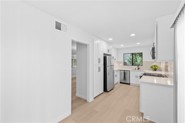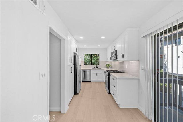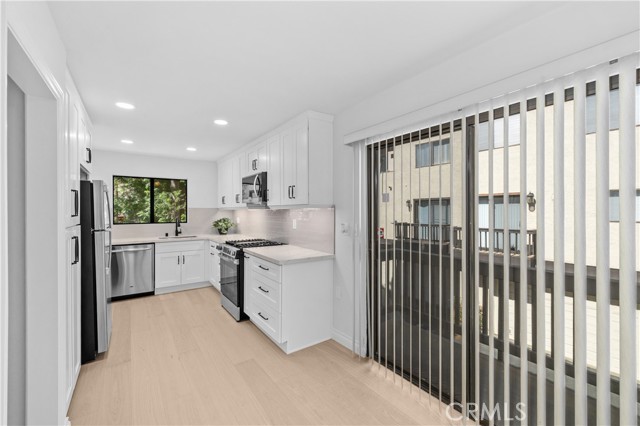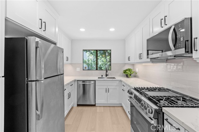 Be the first to enjoy this exquisitely renovated end-unit townhome.This luxury townhouse is ideally situated in a serene interior location in the highly sought-after Warner Village community. Step into a spacious living room featuring a striking floor-to-ceiling brick fireplace and plantation shutters that open to a wood deck overlooking lushly landscaped grounds with tranquil running streams, picturesque bridges, and mature trees, a true garden oasis. The formal dining area boasts elegant wainscoting, a quartz-topped dry bar, and direct access to a charming atrium-style balcony, perfect for indoor-outdoor entertaining. The stunning kitchen has been remodeled with soft-close cabinetry, quartz countertops, a subway tile backsplash, recessed lighting, and newer appliances, including a gas oven with integrated grill cooktop and a built-in microwave. The spacious primary suite features vaulted ceilings, dual closets, a balcony with treetop views, and a beautifully updated en-suite bathroom with quartz counters and sleek modern cabinetry. The secondary bedrooms are light and bright and share a large updated full bathroom. Thoughtful upgrades are found throughout the home, including wide plank white oak engineered wood flooring, plush carpet, luxury vinyl floors, fresh paint, designer fixtures, updated lighting, and more. Enjoy direct access from the attached two-car garage into a versatile bonus room — ideal as a home office, gym, or potential fourth bedroom. The indoor laundry area comes fully equipped with a washer and dryer for added convenience. Warner Village offers peaceful, resort-style living with amenities that include three pools, spas, tennis courts, and lush grounds that feel like a private retreat. Located just across the street from Warner Center Park, where one can enjoy the ever popular “Concerts in the Park” summer series. This unbeatable Woodland Hills location is moments from Costco, The Village, 24 Hour Fitness, fine dining, and top retail. With the new LA Rams Training Facility nearby and the transformative Warner Center 2035 development on the horizon, this is your opportunity to live in a beautifully upgraded home in the heart of Woodland Hills — where lifestyle, convenience, and long-term value converge.