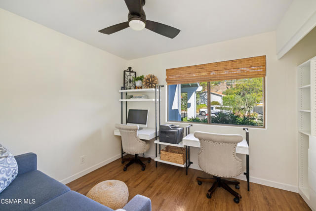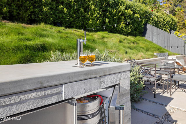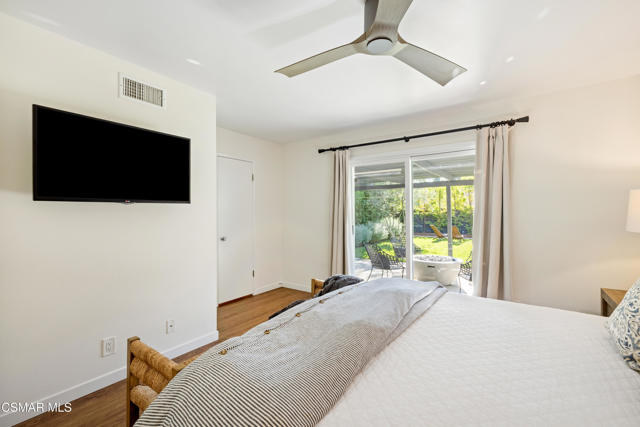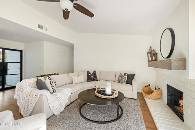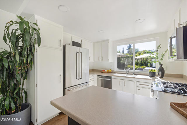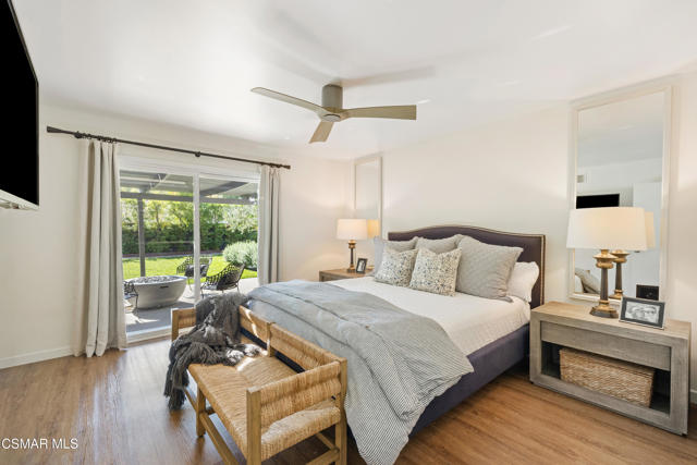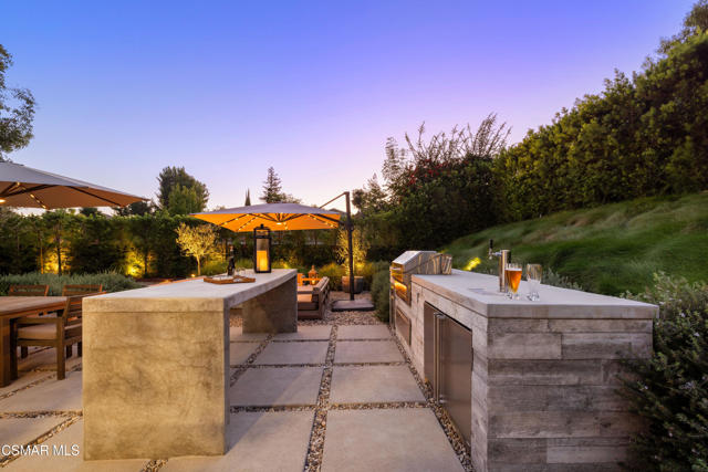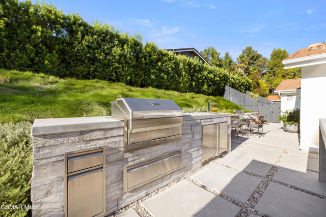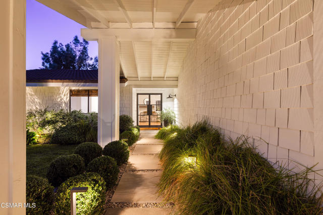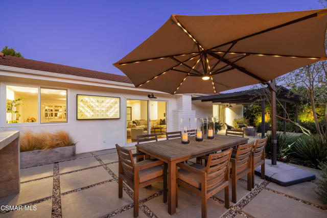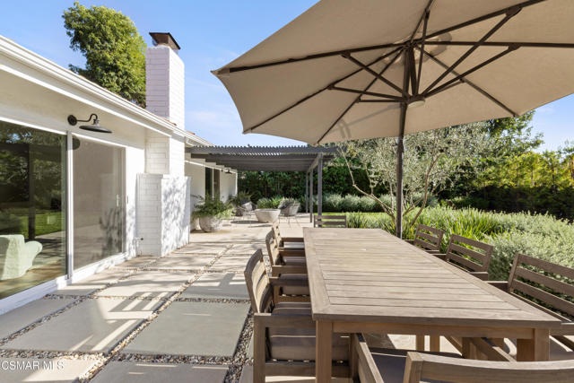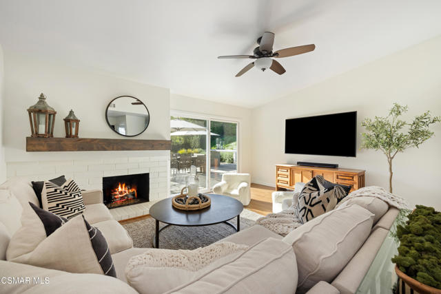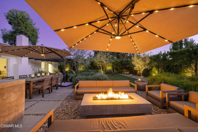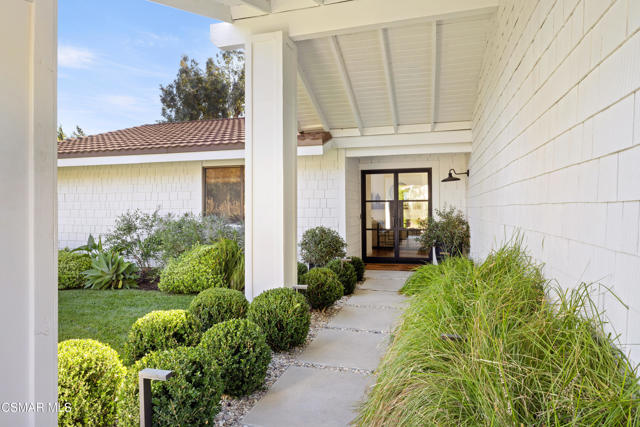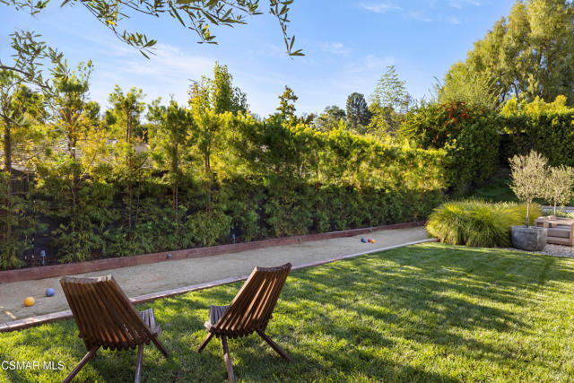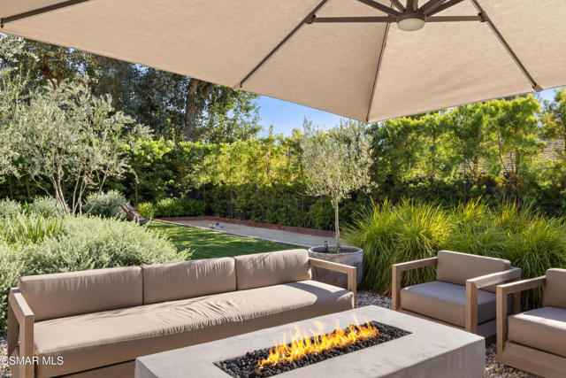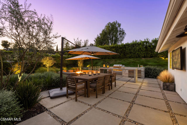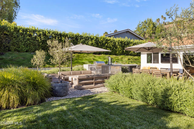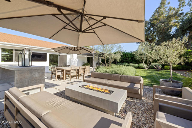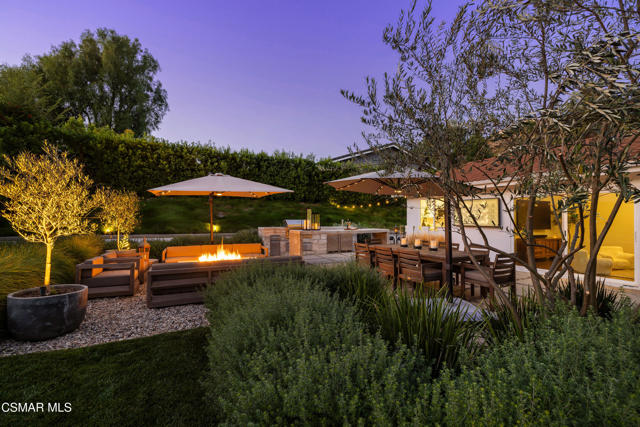 Welcome to this exceptional single-story, 3-bedroom, 2-bath home in the highly sought-after Foxmoor Estates neighborhood of Westlake Village. Surrounded by meticulously designed landscaping, this residence blends indoor and outdoor living with timeless California style.Enter through striking custom-made, glass grid French doors into a formal living room featuring a cozy fireplace and sliding doors that open to the private backyard. The updated kitchen with newer appliances and a breakfast bar flows effortlessly into the open family room, where sliding doors lead to a generous side yard complete with a beautiful wall fountain and lush sculpted mounds of grass.The primary suite offers a walk-in closet, private bath, and direct access to the backyard through sliding doors. The professionally landscaped outdoor space is an entertainer's dream, surrounded by a privacy hedge and featuring multiple seating areas, a custom built-in firepit, BBQ island with refrigerator and beer tap, and a Bocce ball court. Enhanced by olive trees, mature agave, ornamental grasses, and landscape lighting, this private retreat provides beauty and relaxation both day and night.Located in one of Westlake Village's most desirable communities, residents enjoy nearby greenbelts, parks, and convenient freeway access.