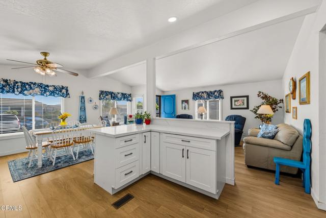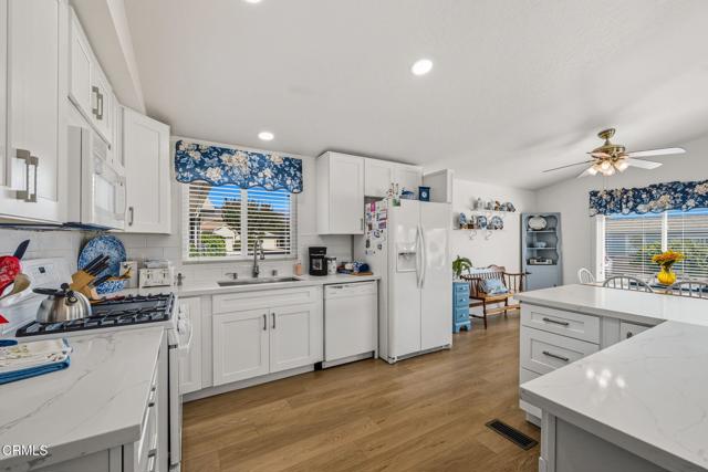 Hillview Estates Community is a great place to live for those 55 and over where you own your own land. Great location for this 2 bedroom, 2 bath home of 1152 square feet. Wonderful back yard with covered patio and small perfect lawn with direct access from the master bedroom and block walls for privacy. Located directly across from guest parking and mailboxes, this location is one of the best for convenience for guests and mail. When you enter the home you notice the open space with living room, dining room and kitchen all open to the other. Beautifully updated and upgraded this home is move in condition with LVP flooring in the living areas with lovely carpet in the bedrooms, quartz counters in the kitchen, plus newer cabinetry and quality through and through. A utility room is perfectly located between the garage and hallway and the washer and dryer are included in the sale. The master bedroom has sliders to the backyard and a remodeled master bathroom and a wonderful walk in closet! A spacious two car garage is attached with lovely cabinetry and workbench. Just wonderful through and through. The home is vacant now and ready for occupancy. Home was photographed furnished to show you how lovely it can be. Must see to appreciate the quality.