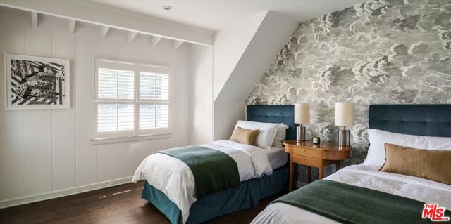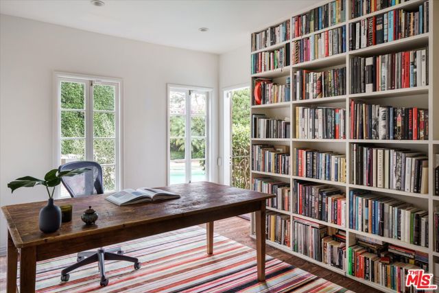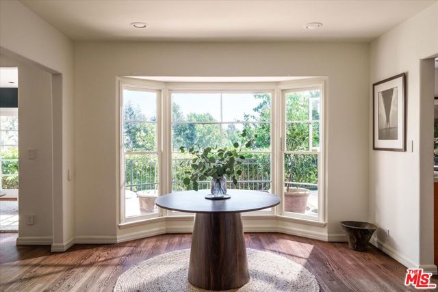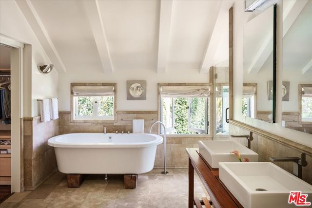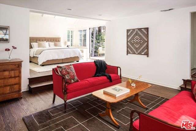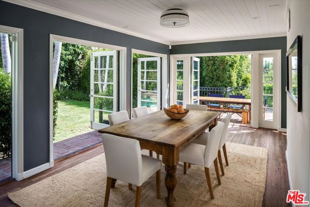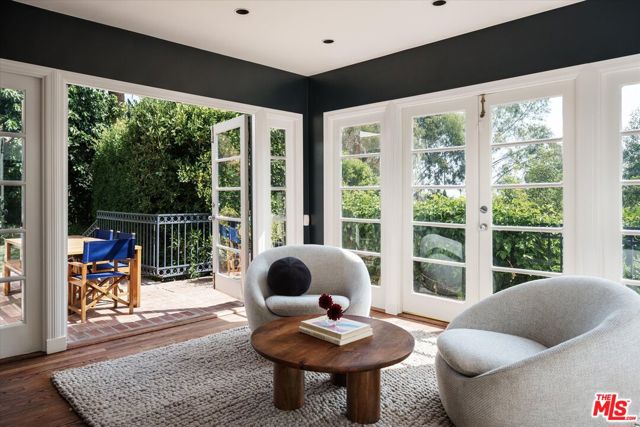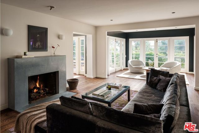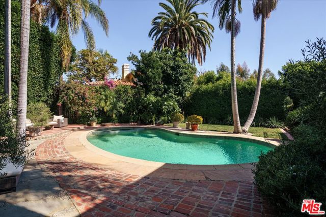 Set behind mature hedging and a private gate, this east coast traditional unfolds into the relaxed elegance of an expansive Californian residence, across a rare extra large, flat parcel in the Outpost Estates--where timeless architecture meets the tranquility of a resort-like retreat. Enveloped in lush landscaping and designed for effortless indoor-outdoor living, the home feels like a private sanctuary in the heart of the Hollywood Hills. Bathed in natural light and grounded in warmth, the residence maintains an easy dialogue with its surroundings. Nearly every window captures a vignette of greenery, while multiple French doors extend the interiors to the saltwater pool, dining terraces, and tropical gardens beyond. The expansive family room, anchored by a gas-burning fireplace, flows naturally into a sitting area, formal dining room, and the outdoors--creating a perfect setting for gathering and entertaining. A media room with soaring ceilings opens directly to the backyard and adjoins a downstairs office, offering additional flexible space for work, creativity, or quiet retreat. The large chef's kitchen serves as the home's true heart, featuring a central peninsula, an intimate sitting area with a second fireplace, and direct outdoor access. A generous walk-in pantry and a fully equipped outdoor kitchen complete the space, suitable for both daily living and larger occasions. Upstairs, the primary suite offers a peaceful escape with skylights, a separate living room and a generous walk-in closet, with abundant storage, custom cabinetry and tailored lighting, seamlessly transitioning into a bathroom defined by European craftsmanship. Finally, a private balcony overlooking the pool and featuring both canyon and city views. Two additional bedrooms, including one with a private balcony, share a newly renovated Jack-and-Jill bath. A fourth bedroom on the lower level, complete with an en-suite bath, provides comfort and privacy for guests. Additional features include a two-car garage, gated motor court, and integrated smart-home updates throughout. 7064 La Presa Drive is a home both rich in character and harmonious with its surroundings, offering guests a deep sense of privacy and truly embodying indoor / outdoor living.