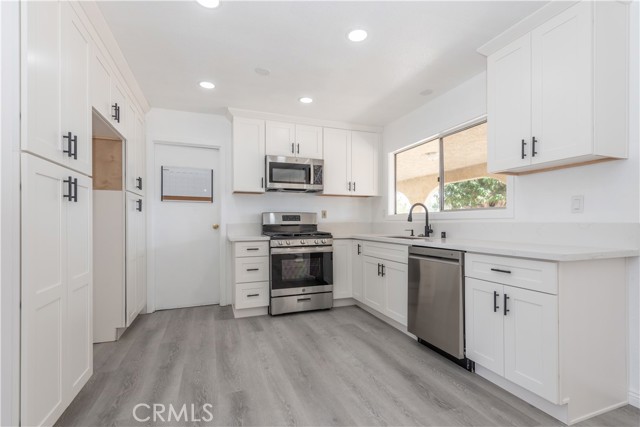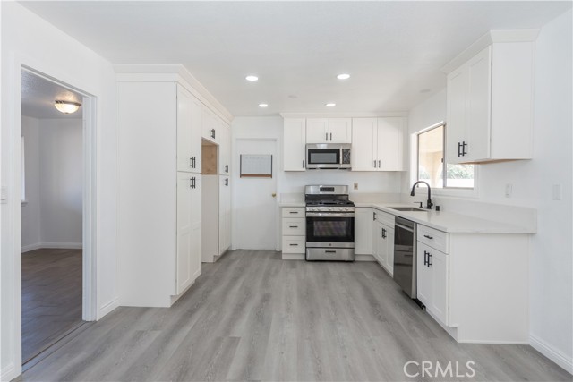 Welcome to this beautifully updated 3-bedroom, 2-bathroom home, perfectly situated on an expansive lot with endless possibilities. A brick wall divides the backyard into two distinct areas, offering versatility for future use. The property is already connected to the public sewer system, and a double iron gate provides access to the backyard—spacious enough for RV parking. Inside, you'll find a completely remodeled kitchen featuring brand-new cabinetry, elegant quartz countertops, and stainless steel appliances—including a gas stove, sink, dishwasher, and microwave. Both bathrooms have been tastefully renovated to match the kitchen's modern finishes, creating a cohesive, stylish feel throughout. Enjoy comfort year-round with central air and ceiling fans in every room and a cozy gas fireplace in the generous family room—ideal for cool winter evenings. Durable tile flooring has been installed in high-traffic areas, while new vinyl plank flooring adds a sleek touch throughout the rest of the home. The attached 2-car garage offers direct access into the home, making grocery unloading a breeze. Out back, a long covered patio sets the scene for outdoor entertaining, ideal for relaxing or hosting friends—true California living at its best. With RV access and room to add an ADU, build a pool, install a jacuzzi, or create additional parking, the potential here is endless. Conveniently located near shopping centers, gas stations, and major roads with quick access to the 15 Freeway. This move-in-ready home is waiting for its next owner to enjoy all it has to offer—don't miss this opportunity!