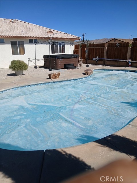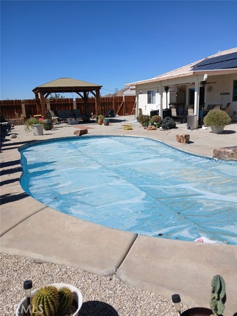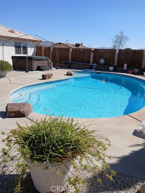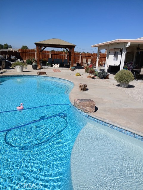 Beautiful POOL Apple Valley Home on One Acre! 2 MASTER BEDROOMS! PAID OFF SOLAR! SO MUCH MORE! This stunning 4-bedroom, 3-bath home features two master suites, a remodeled kitchen, and new laminate flooring throughout. Enjoy a re-plastered and retiled swimming pool with warranty, new AC and heating system with warranty, and a paid-off solar system for energy savings. Freshly painted inside and out, the property sits on a fully fenced acre with two front gates and boasts breathtaking High Desert mountain views.