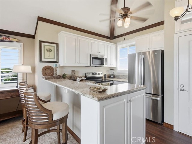 Coastal-Chic Penthouse Studio with 270° Panoramic Views in Huntington Beach | Guard-Gated Seabridge Villas Embrace refined beach-lifestyle living in this fully remodeled studio penthouse in the coveted Seabridge Villas community, Huntington Beach. Vaulted ceilings, abundant natural light and 270° panoramic views from ocean to mountains set the scene. Inside, the design seamlessly blends plush living-room carpet with rich, wood-grain laminate in kitchen and bath. The loft level accommodates either a queen-bed retreat or home office, with new staircase, bonus closet, sliding doors and decorative railing. A finished attic closet features mahogany shelving + LED lighting for elevated storage. The chef’s kitchen is upgraded to the max: marble countertops, luxury-grade flooring, refinished cabinetry and brand-new stainless appliance suite. Utility upgrades include copper plumbing, insulated ductwork, automatic air-bleed valves and dedicated service receptacle — fully modernized systems. The spa-style bath mirrors that finish level: marble counters, walk-in shower with sliding door, LED lighting and upgraded ventilation. Additional features: stacked washer/dryer unit with mahogany-shelved closet, brand-new luxury entry door, crown molding & exposed mahogany rafters, plantation shutters with oversized slats, new skylight with repainted tunnel, and smart three-way light-switch layout + extra outlets for convenience. Step outside onto the expansive balcony and soak in sweeping vistas — from beach waves and mountain ridgelines to nightly Disneyland fireworks. Located within Seabridge Villas — a guard-gated resort-style community offering: two pools & spas, rentable clubhouse, indoor gym + dry sauna, four lighted tennis courts, subterranean parking, bike storage, elevator service and lush pathways through lagoons & greenbelts. Pet-friendly. Walking/biking distance to downtown Huntington Beach, Pacific City dining, nightlife and the sand — luxury + security + coastal lifestyle all in one. Ready to live the beachside dream? Reach out today for a private showing.