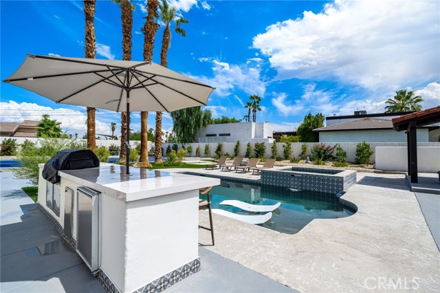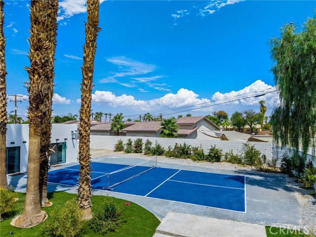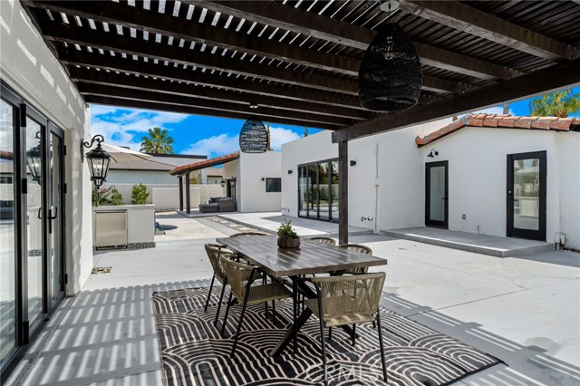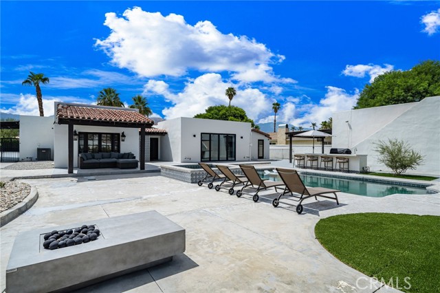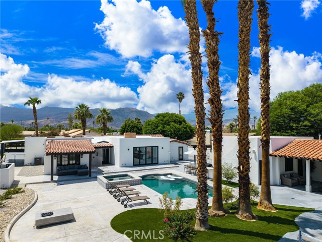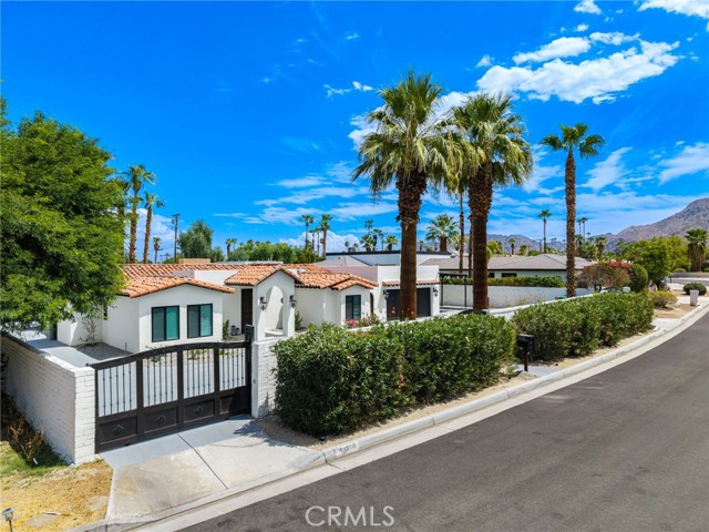 Welcome to Your Private Palm Desert Hacienda compound! Discover this one-of-a-kind, gated resort-style estate nestled just blocks from the world-renowned El Paseo shopping district. Originally built in 1949 for famed actress Mrs. Mabley—also known as Ma Kettle—this historic property blends timeless charm with modern luxury across a sprawling 19,000+ sq ft lot. Main Residence Highlights include: Over 3,400 sq ft of living space, 4 spacious bedrooms & 3.5 bathrooms, grand living room with dramatic wood-beamed ceilings and a floor-to-ceiling fireplace, gourmet kitchen featuring brand-new custom cabinetry, granite countertops, oversized island, and top-of-the-line Viking appliances, elegant family room with hardwood floors and expansive multi-slide glass doors opening to the entertainer’s backyard. The Primary Suite offers vaulted ceilings, a spa-inspired bathroom with dual shower heads with luxurious finishes and a private gym for your wellness needs. The 2 detached Casitas are ideal for guests or multi-generational living, each with its own covered patio perfect for al fresco dining. The outdoor oasis has a sparkling pebble tec pool and spa, pickleball court for active fun, outdoor bathroom and shower, built-in BBQ station for hosting unforgettable gatherings, and breathtaking mountain views that offer peace and privacy. Whether you're seeking a serene sanctuary or a vibrant venue for entertaining, this estate offers endless possibilities to personalize and elevate your lifestyle. Properties of this caliber and character rarely come to market—don’t miss your chance to own a piece of Palm Desert history.