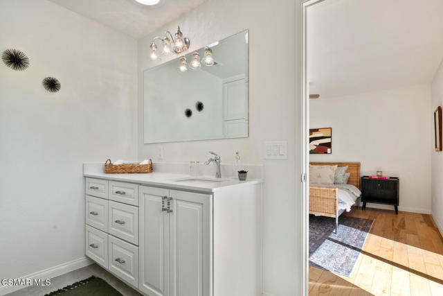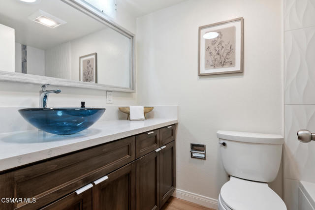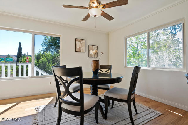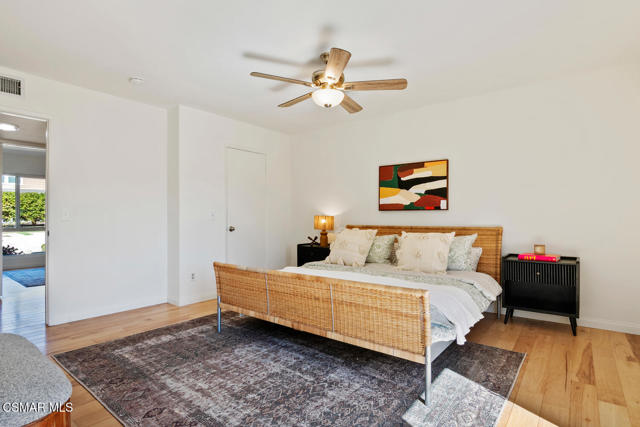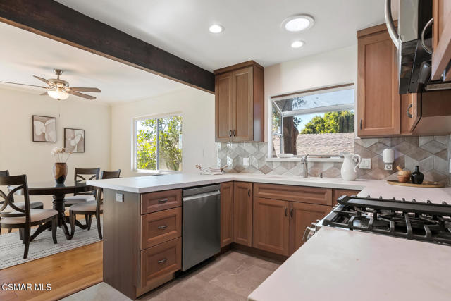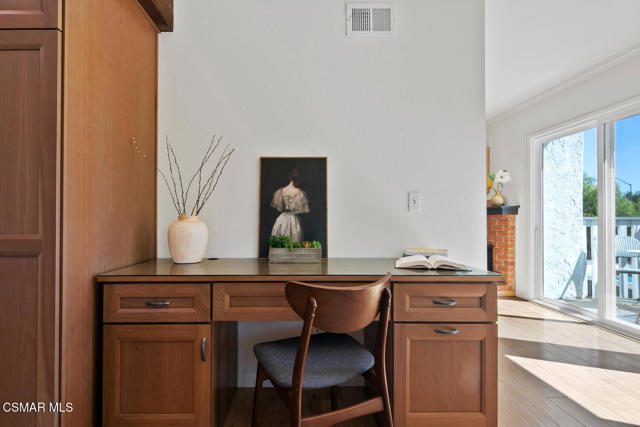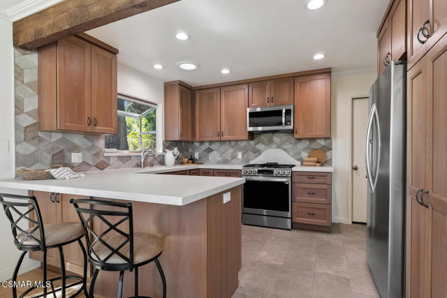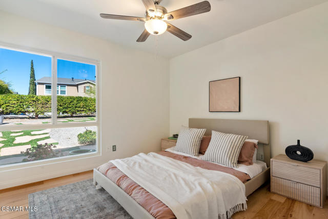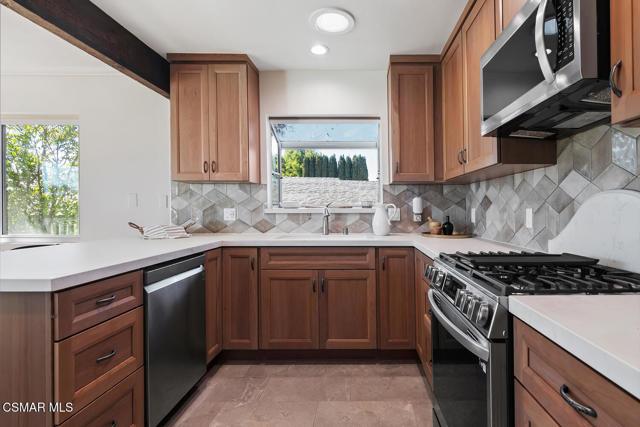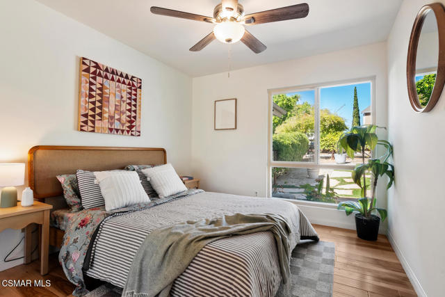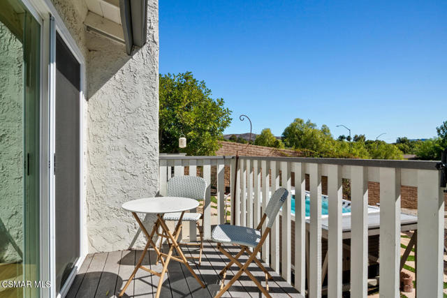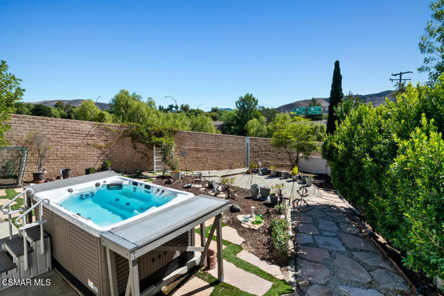 Tucked at the end of a cul-de-sac in Thousand Oaks, this beautifully remodeled 3-bedroom, 2-bath home blends modern comfort with timeless style. Set on a large, low-maintenance lot, it features owned solar with a Tesla battery for energy efficiency and peace of mind. The inviting kitchen showcases custom cabinetry, sleek stone countertops, stainless steel appliances, and a convenient breakfast bar that opens to the living area--perfect for entertaining. Warm hardwood flooring flows throughout, complemented by brand new ceiling fans, wall sconces, and light fixtures. The spacious living room offers a cozy fireplace and access to a balcony that extends the living space outdoors. The primary suite includes its own balcony retreat, a walk-in closet, and a stunning remodeled bath. Both bathrooms feature elegant tile showers, with the hall bath offering a tub/shower combo. Outside, the expansive yard is designed for relaxation and fun, complete with an above-ground swim spa and ample room to play, garden, or gather with friends. A rare find that combines style, efficiency, and privacy in a prime Thousand Oaks location.