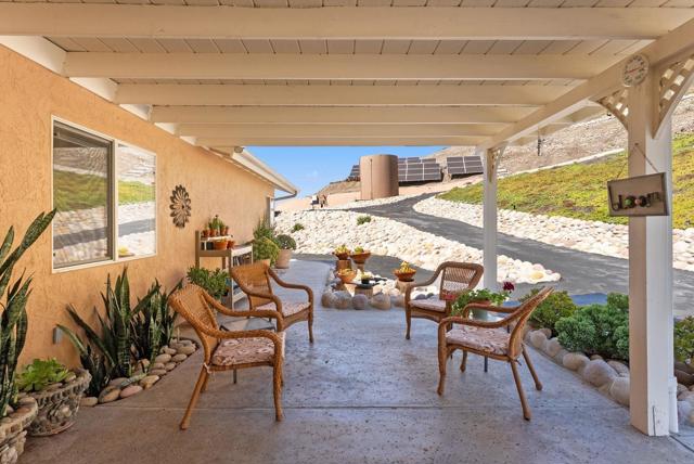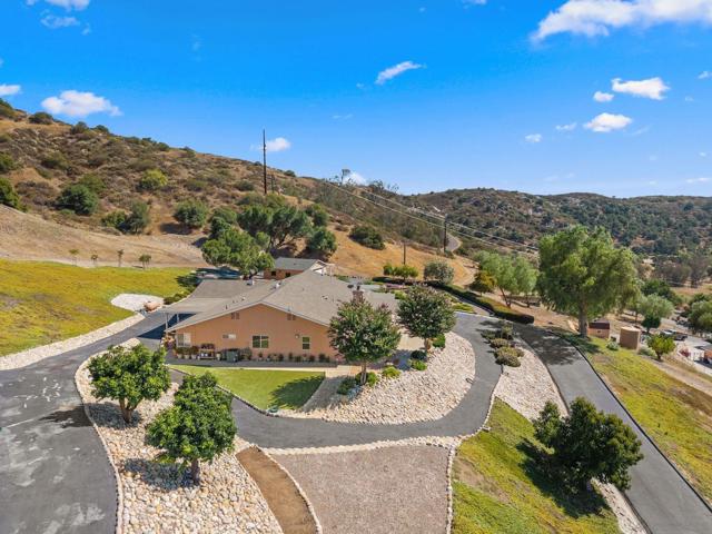 Tucked at the end of a private road and backing up to the Simon County Preserve, this 12.5-acre Ramona retreat offers panoramic views, complete privacy, and off-grid-ready infrastructure. With no visible neighbors and just eight minutes to town, it’s the perfect blend of self-sufficiency, tranquility, and convenience. Designed with sustainability in mind, the property features owned solar with battery backup, a private well with 10,000-gallon storage tank, quick-connect dual fuel generator, EV charging station, oversized irrigation system, indoor fire sprinkler system, and whole-house fan. This single-story 4-bedroom, 3-bath home spans 2,745 sq ft and features vaulted ceilings, a spacious living area with river rock fireplace, and a generous kitchen with dual-pane windows and solid wood cabinetry. The primary suite offers a soaking tub, dual vanities, and walk-in closet. Three additional oversized bedrooms and two full baths provide space for family, guests, or creative use. An oversized 3-car garage is complemented with built-in workbenches and storage. The detached 2-car garage has water and electricity for possible ADU conversion. The grounds include walking paths, a xeriscape garden, mature landscaping, and full irrigation. No HOA. Turnkey and ready for your next chapter.