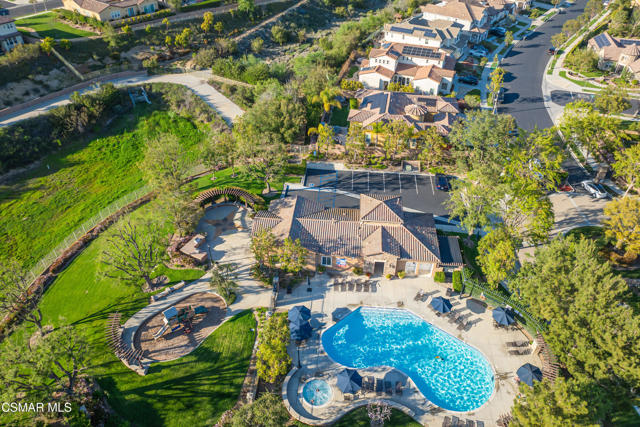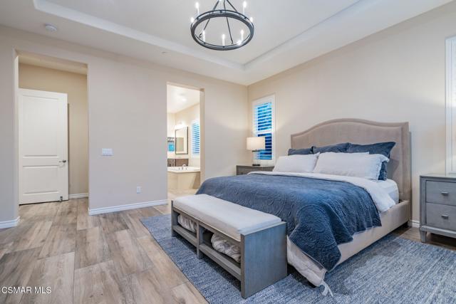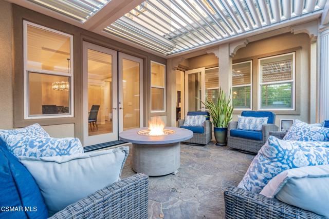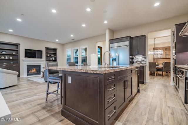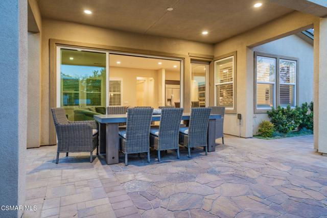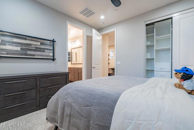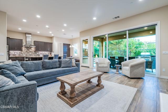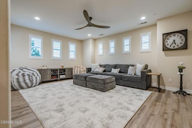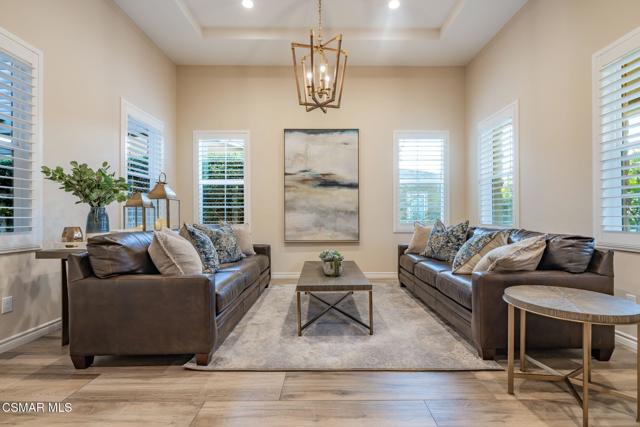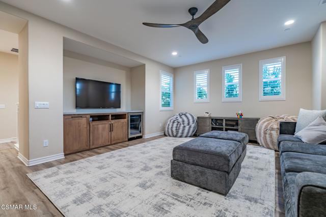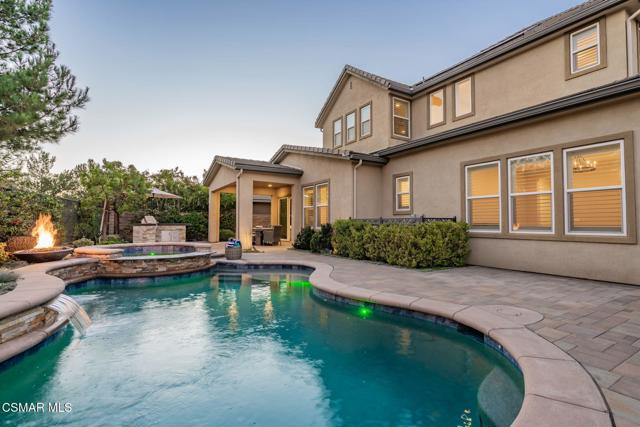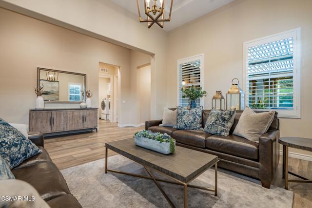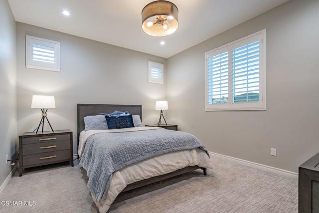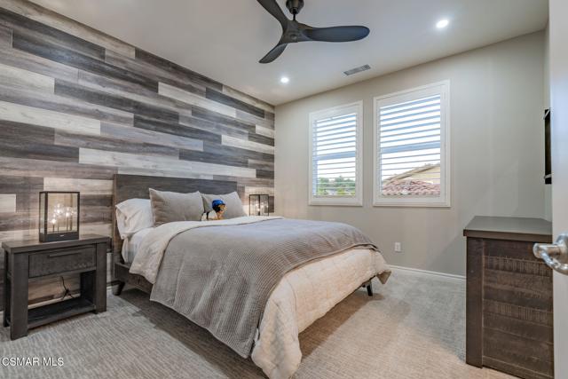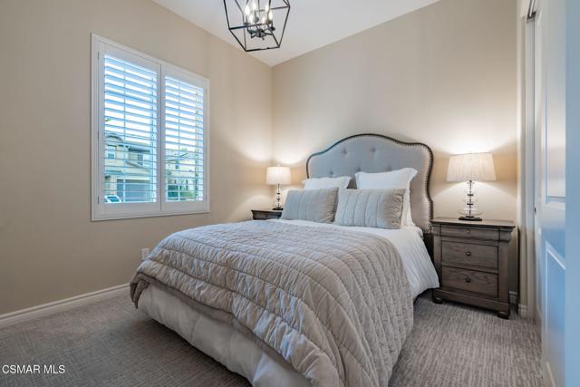 Lives like a single story with Primary Bedroom Downstairs. Nestled adjacent to the prestigious Moorpark Country Club, this exquisite home in the gated community of Meridian Hills offers timeless French Craftsman charm with modern luxury and thoughtful design. One of the most desirable floor plans in the neighborhood, this residence lives like a single story, with the Primary Suite and a guest bedroom--both with full baths--conveniently located downstairs.The Primary Suite is a serene retreat featuring plantation shutters, a spa-like bath with soaking tub, oversized shower, dual vanities, and a spacious walk-in closet. The open-concept living area showcases a gourmet kitchen with upgraded built-in appliances, a large island perfect for gatherings, soft-close cabinetry, and one of the largest pantries in the community. The family room's multi-slide glass doors open to a California Room, creating seamless indoor-outdoor living and the perfect setting to enjoy Moorpark's breathtaking sunsets.The backyard is an entertainer's dream, complete with a private pool and spa enhanced by fire bowls, waterfalls, and a built-in BBQ bar surrounded by beautiful pavers. A private side courtyard with a motorized louvered patio cover offers the perfect shaded escape for morning coffee or reading with your favorite pup.Upstairs, you'll find three additional bedrooms, a loft with built-in desks, and a spacious bonus room with custom cabinetry, mini fridge, and ample wall space for a large TV--ideal for a media room, game room, or private retreat.Additional highlights include fully paid solar with power wall, epoxy-coated 3-car garage with dual access doors, upgraded lighting and ceiling fans, tray ceilings, 8-foot doors, and custom shutters throughout.Experience refined living, elegant details, and energy-efficient comfort in one of Moorpark's most desirable communities. Come see how perfectly this home fits your lifestyle.