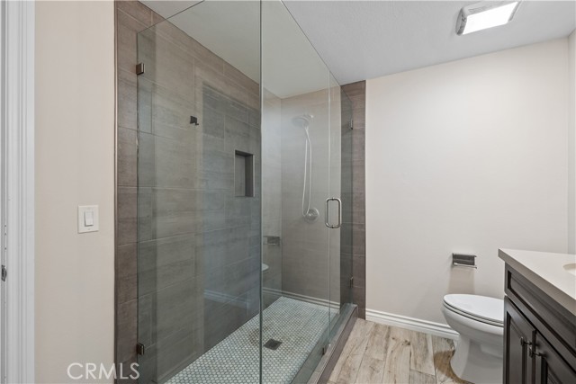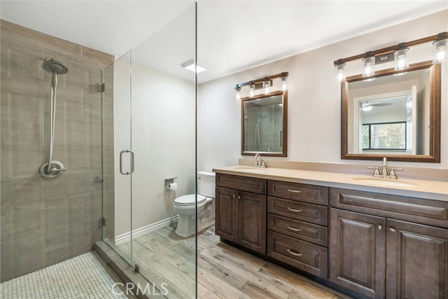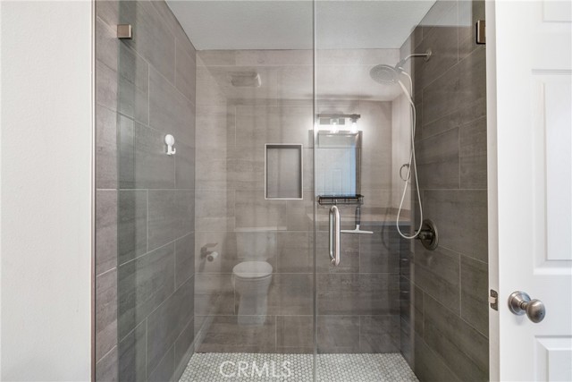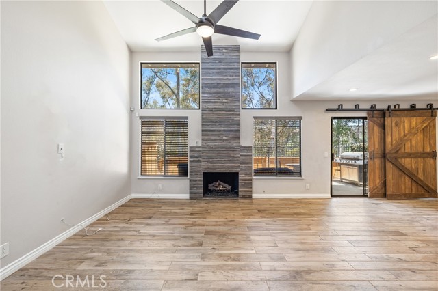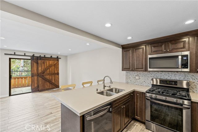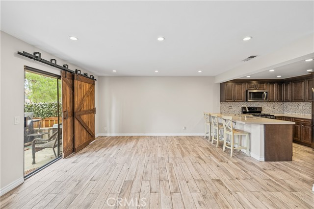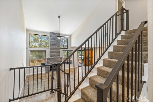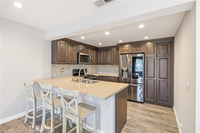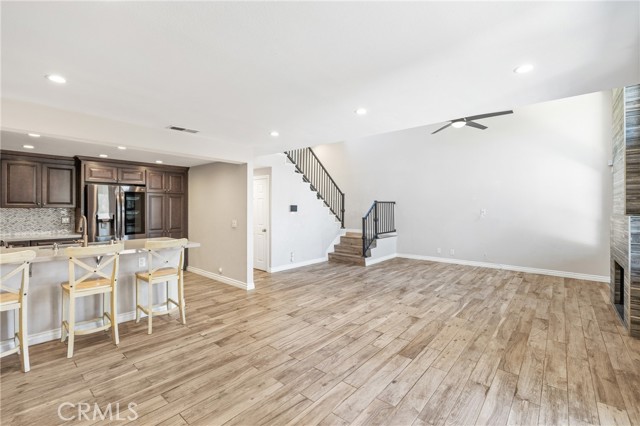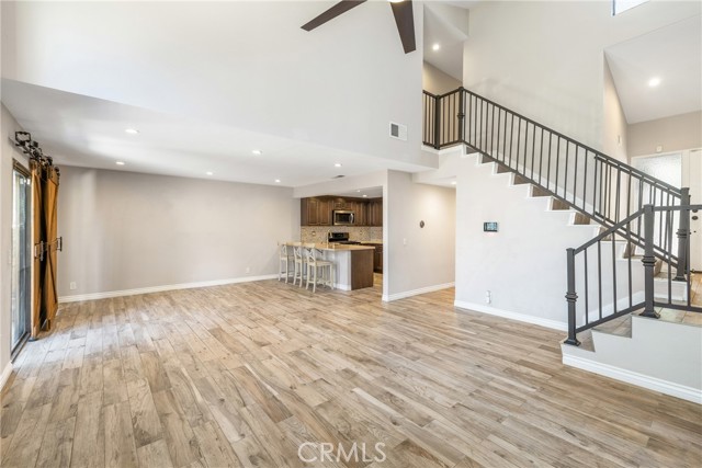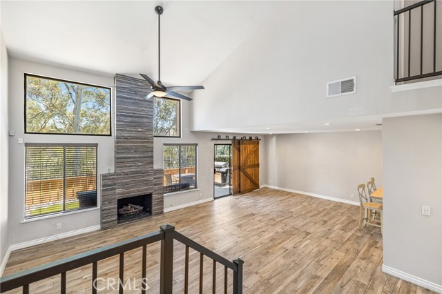 Indulge in breathtaking views of the prestigious Anaheim Hills Golf Course from this elegantly appointed townhome, nestled in the exclusive Parkview community, an enclave renowned for its tranquil setting, rolling greenbelts, and upscale ambiance, where higher-end homes set the stage for this beautifully updated residence. Step inside and be captivated by soaring 20-foot vaulted ceilings, an abundance of natural light pouring through expansive windows, adorned with exquisite tile flooring that flows seamlessly throughout creating an ambiance of timeless sophistication and open-air grandeur. An open concept living space invites you anchored by a dramatic floor-to-ceiling custom fireplace that serves as a striking focal point and flows effortlessly into the expansive dining area. Enjoy an upgraded kitchen equipped with quartz countertops, soft closing drawers, stainless steel appliances, mosaic tile backsplash, and recessed lighting that highlights the peninsula breakfast bar. An eye-catching custom barn door leads you to the outdoor patio with scenic views of mature eucalyptus trees, lush greenery, and golf course views that create the perfect backdrop for alfresco living. A thoughtfully designed powder room offers a sophisticated touch perfect for guests and everyday convenience featuring a modern vanity with rich cabinetry, a smooth solid-surface countertop, and brushed nickel fixtures. Upstairs awaits a spacious primary bedroom with a walk-in closet and a spa-inspired ensuite, beautifully updated with dual vanities in rich espresso cabinetry, quartz countertops, framed mirrors, and a walk-in glass-enclosed shower featuring contemporary tilework and a sleek rain-style showerhead. Wood-look flooring adds warmth and texture, enhancing the space with thoughtful design and upscale finishes. In addition to the luxurious primary suite, the home offers two generously sized bedrooms and another full bathroom that mirrors the spa-inspired elegance of the primary ensuite. Perfectly positioned near the prestigious Anaheim Hills Golf Course and the serene Oak Canyon Nature Center, this residence enjoys a coveted backdrop along the Oak Canyon Trail, offering instant access to nature’s beauty and miles of scenic walking paths. Residents relish the convenience of a community pool and BBQ area, all while being mere minutes from Anaheim Hills Plaza, El Rancho Plaza, the 91-freeway, and top-rated schools striking the perfect balance of elegance, comfort, and location.
