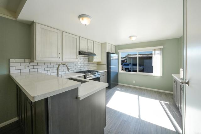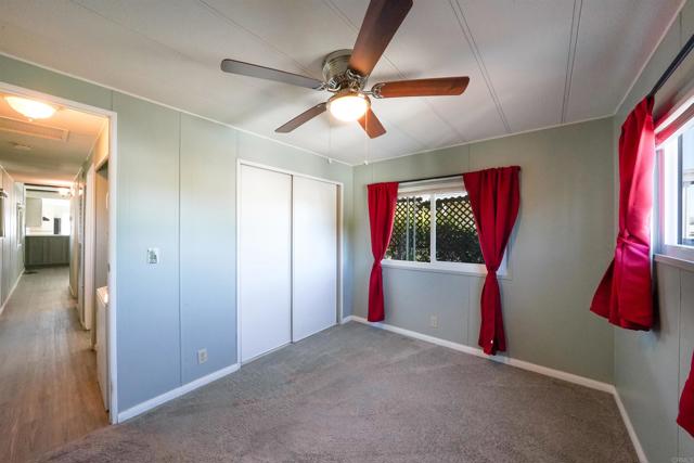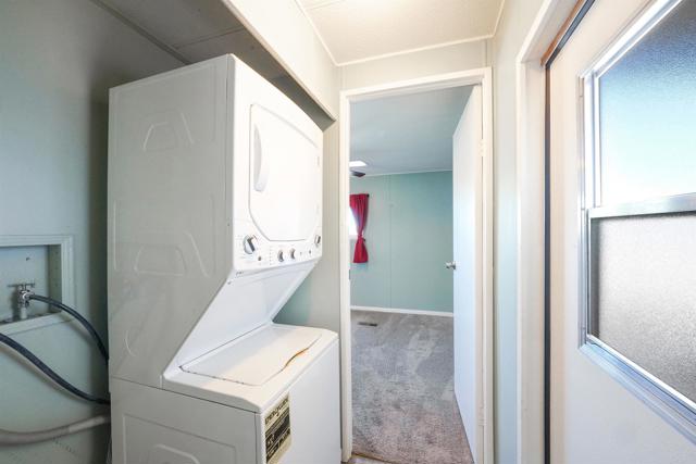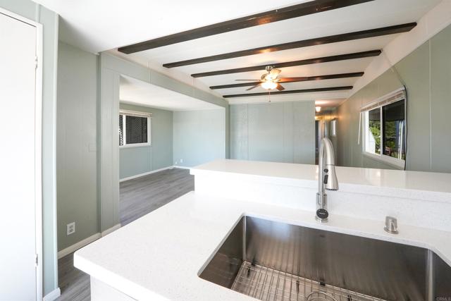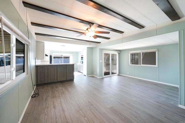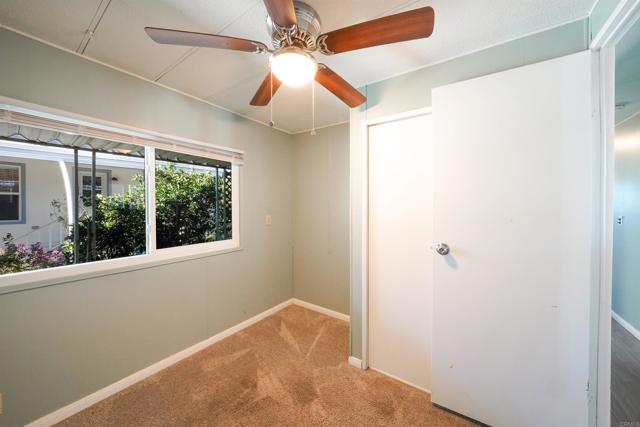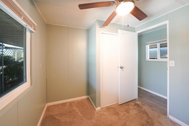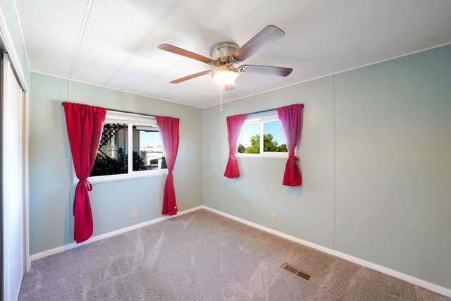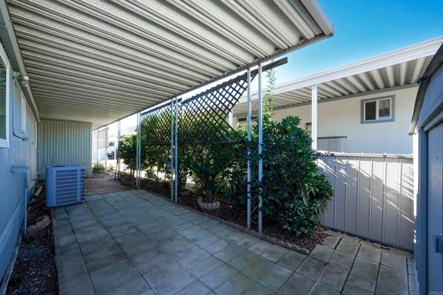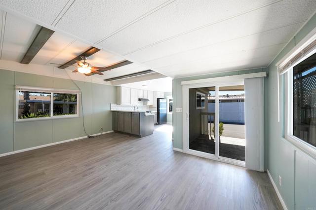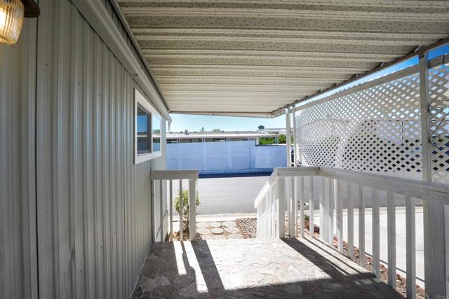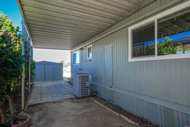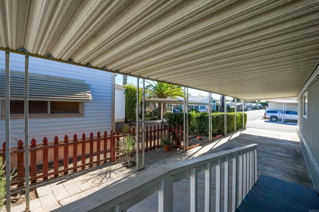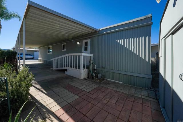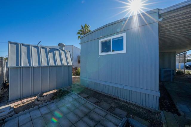 CUTE AS A BUTTON! This charming mobile home is located in the highly sought-after 55+ community of Ramona Terrace Estates — a beautifully maintained land-lease park. Lovingly cared for, this home radiates warmth, comfort, and pride of ownership from the moment you step inside. Enjoy an open and bright layout with a cozy, inviting feel. The seller has thoughtfully made numerous upgrades, including vinyl plank flooring with carpet in the bedroom, newer HVAC with a new HVAC compressor (2024), an upgraded exterior electrical panel, and a new water heater (April 2025). The kitchen was fully remodeled down to the studs in May 2023 and features a new stove. Additional improvements include a stacking washer and dryer (March 2021), dual-pane vinyl windows throughout, and beautiful tile work on the front porch (November 2023). The front porch and side ramp have been rebuilt, and the exterior has was freshly painted. Outside, you’ll appreciate the covered carport, spacious storage shed, and mature fruit trees — including ruby red grapefruit, Valencia, and navel oranges. Come see all this delightful home has to offer before it’s gone!