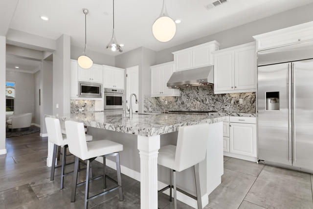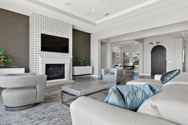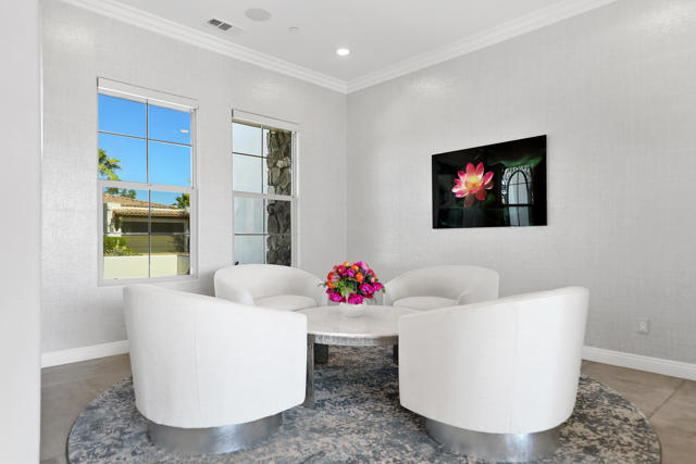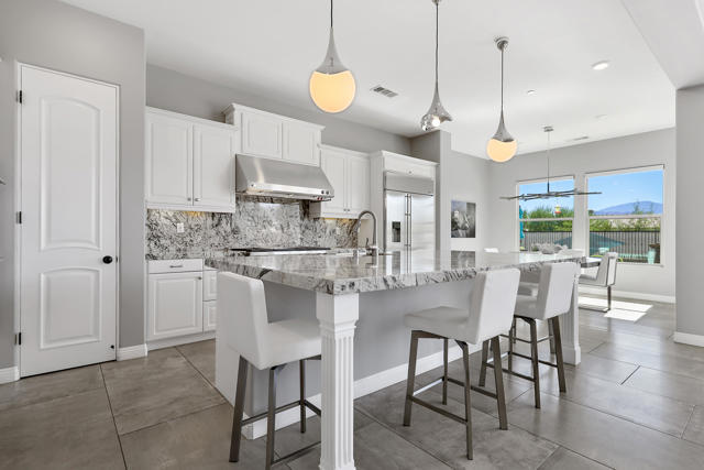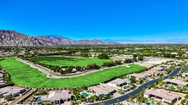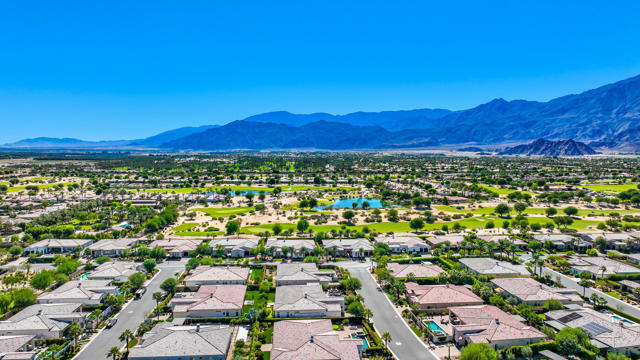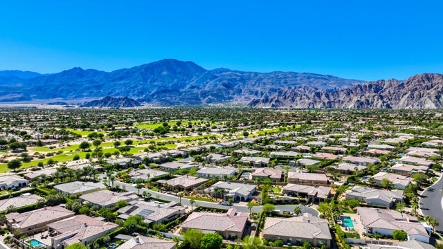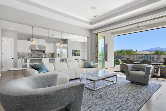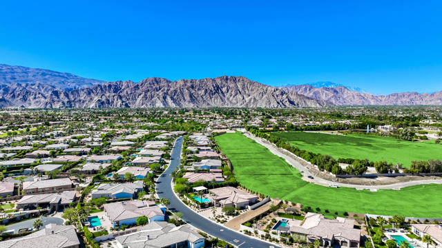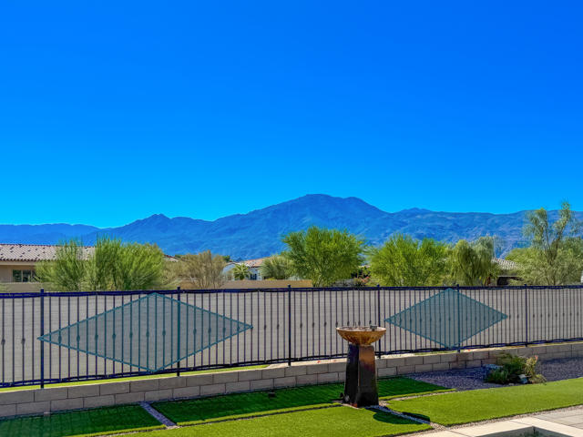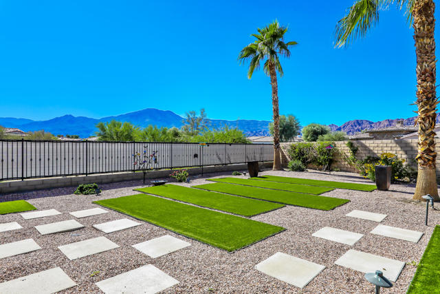 This beautiful Griffin Ranch home has a breath-taking South facing Mountain View, is situated on an oversized corner lot and is one of the few homes in the community that backs up to the privacy of the greenbelt & walking park. The setting is what so many are looking for with the square footage that is cozy and not overwhelming. At just over 3100 sf with 3 bedrooms, 3 1/2 baths the Plan 2 Lennar built home really has it all. The backyard including pool, spa, bocce court & chipping pads were thoughtfully designed with entertainment in mind. When it's time to relax, the Veranda offers the perfect space, whether roller shades are up or down, or the misting system is on or off, the outdoor space is comfortable for the whole gang but hold on, the best is yet to come. When heading indoors you'll enjoy the large 10'' bi-fold door entry providing a view of the great room, kitchen, sitting area and office. It's so nice to live in a space that you don't get lost in, and wait until you see the quality designer furnishings, and yes, almost the entire package of furniture is included with this amazing home. The Griffin Ranch Community is recognized for low HOA fees, terrific amenities at the Clubhouse including eight pickleball courts, Jr Olympic size pool, oversized hot tub, Cabanas, Tennis, Bocce, nine hole putting green and more. Griffin Ranch is right across the street from PGA West (Western Home of Golf), with 6 championship golf courses, private & public restaurants, professional instructors overseeing the fitness center, pickleball & tennis. Jump in your golf cart, head under the tunnel and join in another layer of fun in the sun.
