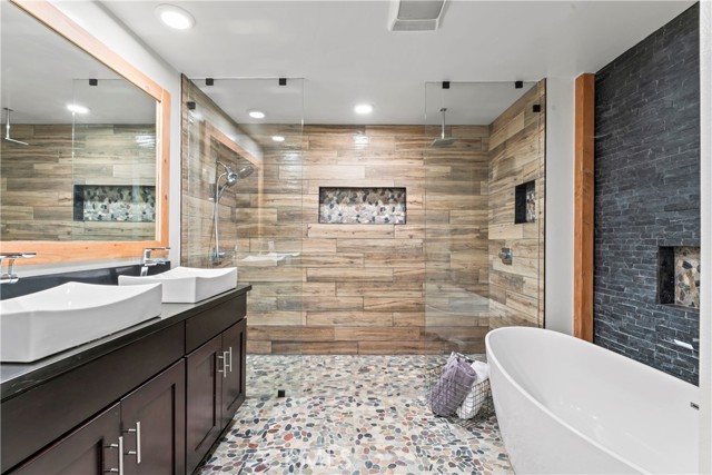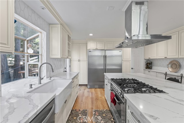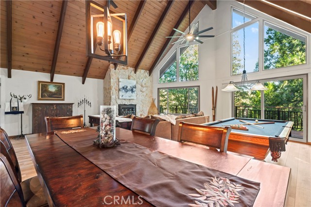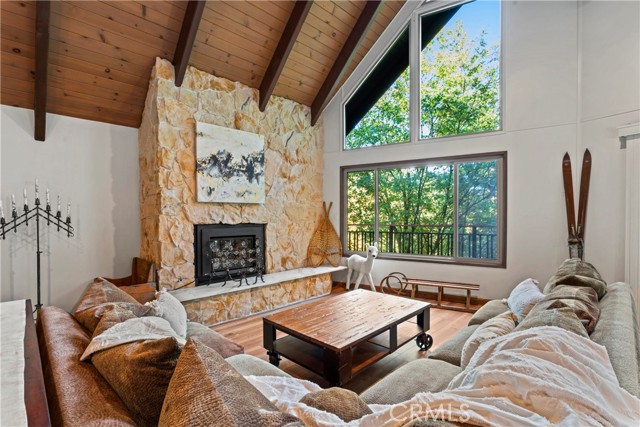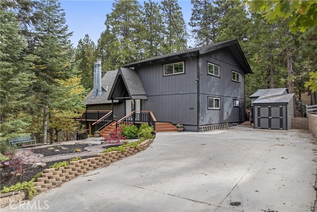 Phenomenal Prow Style home located directly across from the forest and trails, with easy access to the golf course just down the street. This property also includes Lake Rights, allowing full use of beautiful Lake Arrowhead. Over $300,000 in upgrades, including a recently remodeled kitchen with high-end professional-style appliances, slab quartz countertops, and a garden bay window overlooking mature evergreens and oaks on your own land. The home features 4 bedrooms, 3 bathrooms, an office, and a den/family room with a second fireplace—ideal for gatherings or quiet relaxation. The main-level “Great Room” highlights natural wood open-beamed ceilings and a classic “retro rock” fireplace that adds warmth and character. Additional updates include remodeled bathrooms, new interior and exterior paint, newer lower patio/deck, fenced yard, upgraded flooring, newer forced air system, "Leaf Guard Style" rain gutters and system improvements. Both the new Flagship whole house water filtration system and an additional Revrse Osmosis system at the sink ensure the best of the best for your water supply. Both guys and gals can relax in the "She-Shed" while the guys have their own storage shed, too. Located in a peaceful, forested setting with nearby recreation and golf access, this home offers both comfort and convenience in one of Lake Arrowhead’s most desirable areas.