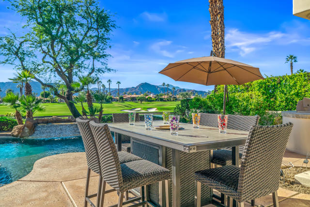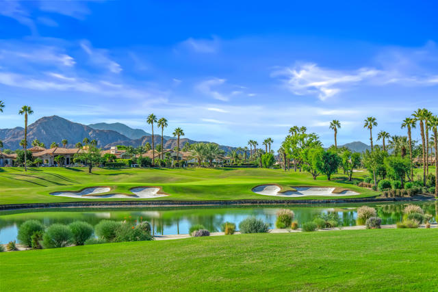 Situated on a premier lot near two fairways, also with lake and mountain vistas, this Encanto One residence captures the scenery and relaxed sophistication of Rancho La Quinta Country Club. High ceilings, abundant natural light, and quality construction define the open layout connecting the living room and fireplace to a generous kitchen finished with granite surfaces, island seating, and stainless-steel appliances. Designed for effortless entertaining, the backyard offers a pool with two waterfalls, raised spa, built-in barbecue station, and multiple seating areas covered and uncovered, surrounded by new desert landscaping and turf. Three bedrooms plus a den provide needed privacy; each bedroom is ensuite, including a spacious primary suite with a large walk-in closet and well-appointed bath. Additional features include a two-car garage with separate golf-cart bay and refined architectural detailing throughout. Homeownership includes guard-gated security and Athletic and Social memberships granting access to the Racquet Club's tennis, pickleball, bocce, fitness, and dining facilities, along with two eighteen-hole golf courses designed by Robert Trent Jones and Jerry Pate, respectively. The home sits off the 4th hole of the Pate course, and the 7th hole is across the lake. Furnishings are negotiable.