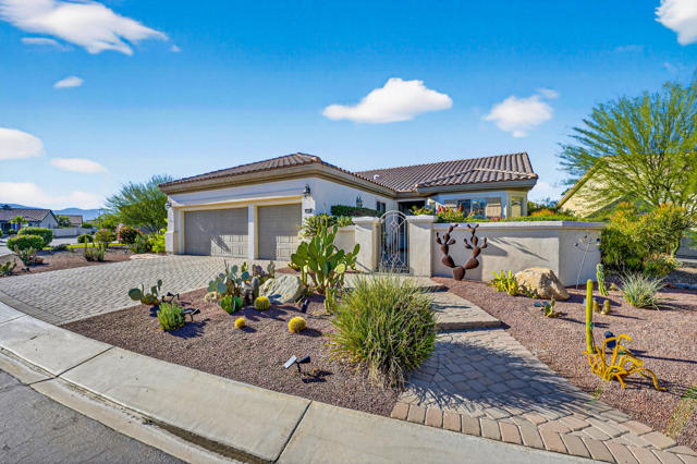 Located in the desirable 55+ community of Sun City Shadow Hills, this beautifully maintained San Benito floor plan offers 2,147 sq. ft. of stylish and comfortable living. The home features a charming front courtyard with a stone fountain and pavers across the entire front. Inside, the open living and dining area showcases tile flooring, abundant natural light, and a sliding glass door leading to the backyard. The kitchen includes granite slab countertops, extensive cabinetry, bay windows, and a cozy breakfast nook with plantation shutters. A versatile den/office with a skylight and a bonus room with tile flooring provide additional space for work or hobbies. The primary suite features laminate flooring, backyard access, an updated en suite bath, and two walk-in closets. The guest bedroom offers cozy carpet and sits next to the guest bath. Both bathrooms include grab bars for added comfort. Additional highlights include a convenient golf cart garage for easy access to the community's amenities. Step outside to enjoy a spacious 9,000+ sq. ft. lot with extended concrete patios, a covered area with ceiling fans, and low-maintenance landscaping, perfect for relaxing or entertaining. Located within Sun City Shadow Hills, residents enjoy access to two golf courses, clubhouses, fitness centers, pools, pickleball and tennis courts, and a variety of social clubs and activities--offering a vibrant and active desert lifestyle.
