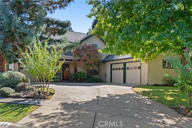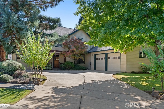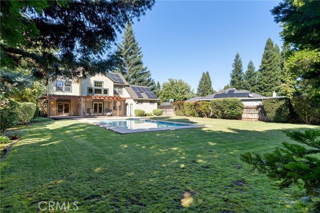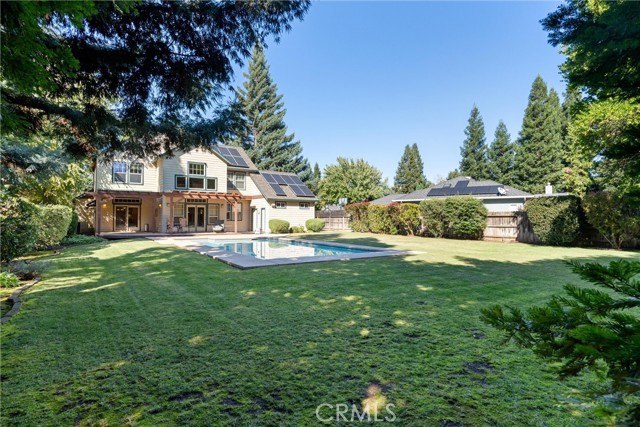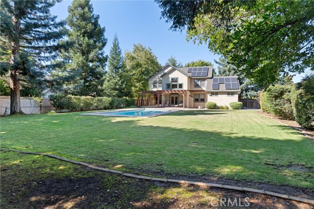 This charming 3-bedroom, 3.5 bath home perfectly blends comfort, convenience, and sustainability. Nestled on a quiet cul-de-sac just steps from Bidwell Park, a local coffee shop, and shopping, this home offers the ideal balance of tranquility and accessibility. Tall redwood trees in the spacious backyard offer plenty of privacy to relax by the pool. This home features a few separate living spaces for all your needs, including a living/family room, a cozy den, and an office. A half bathroom off of the exterior of the home provides convenience for guests while using the pool. Home has beautiful hardwood floors, a spacious kitchen island, soaring living room ceilings, stone fireplace, and owned solar. Don't miss the rare opportunity to own a beautifully maintained home in this sought after neighborhood!