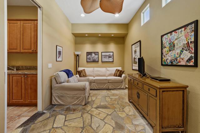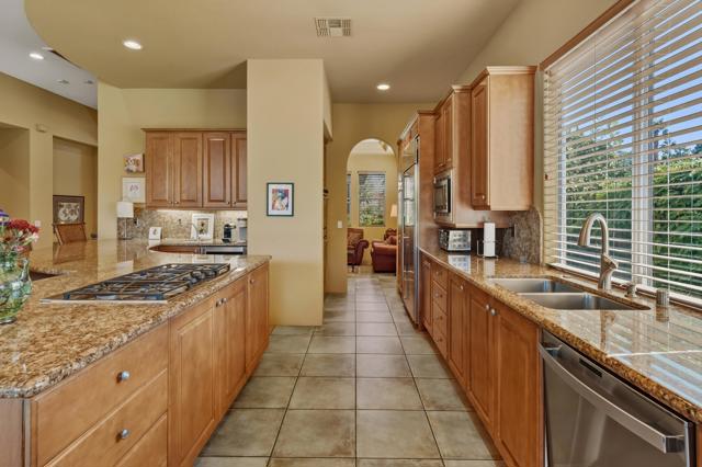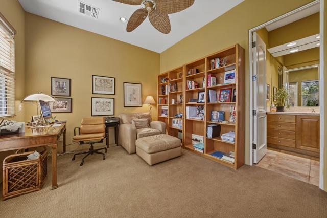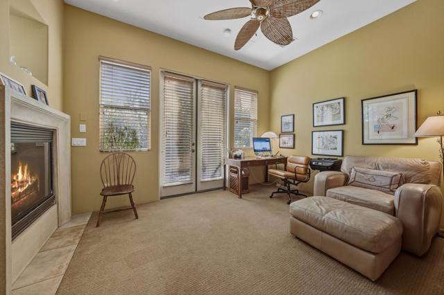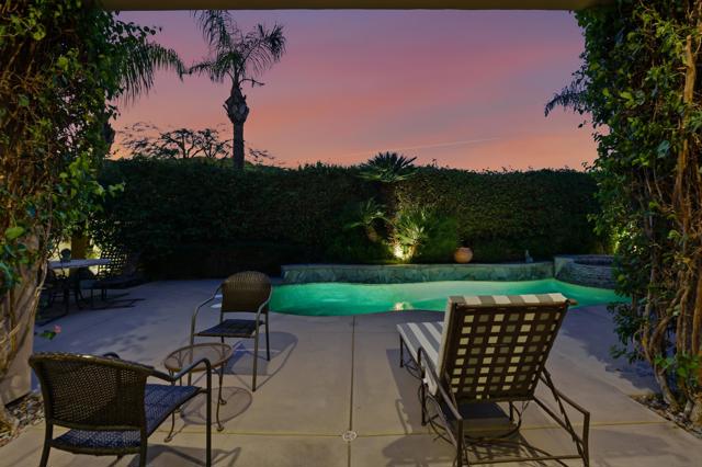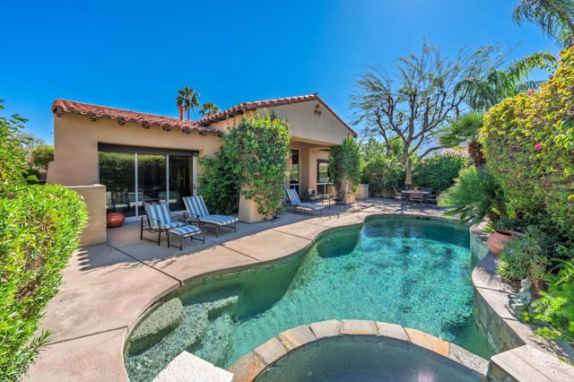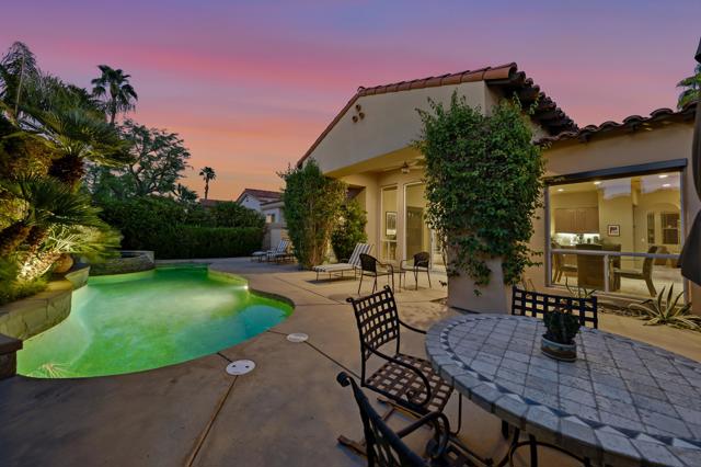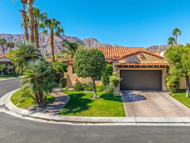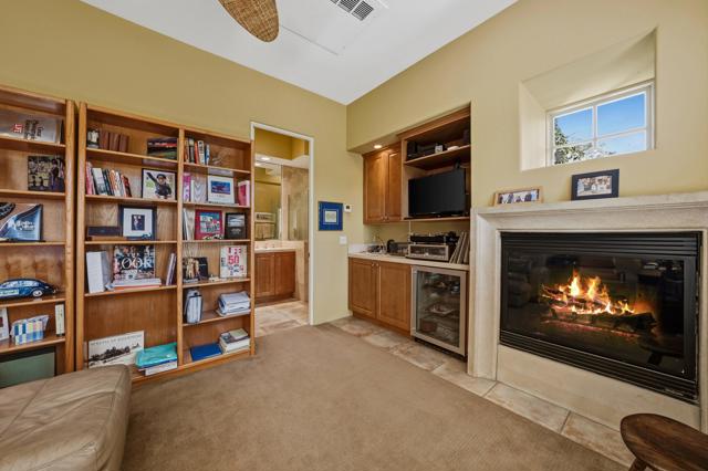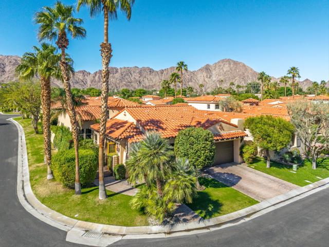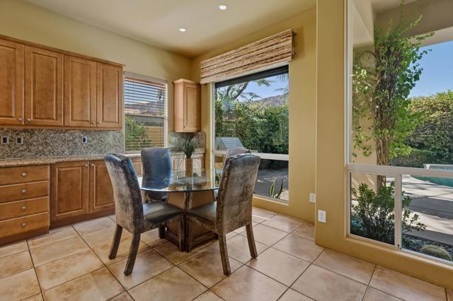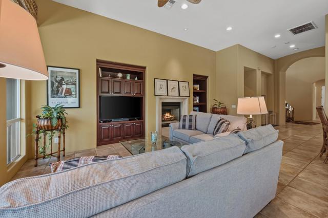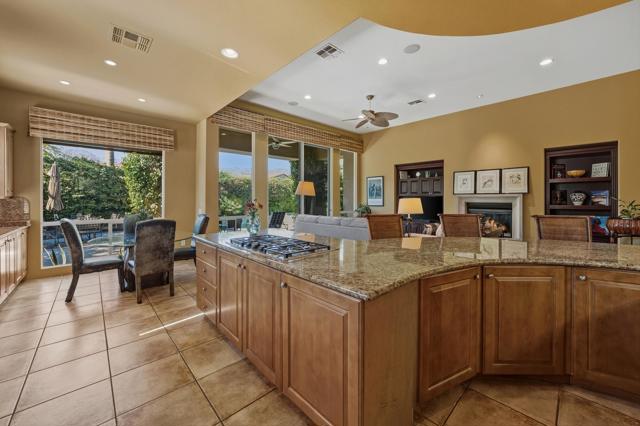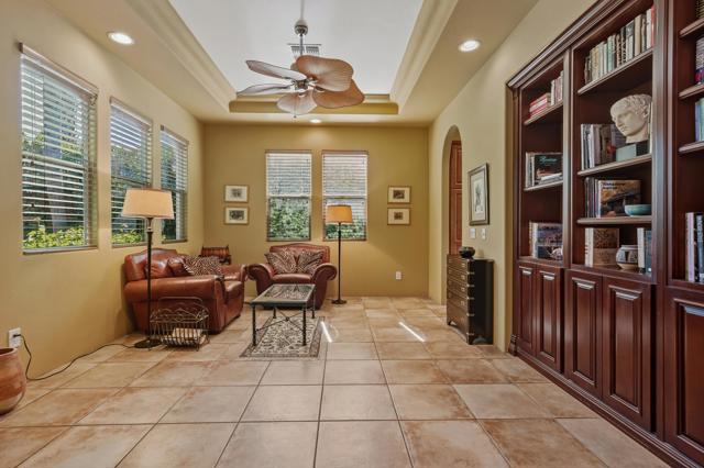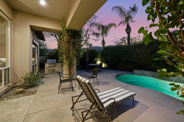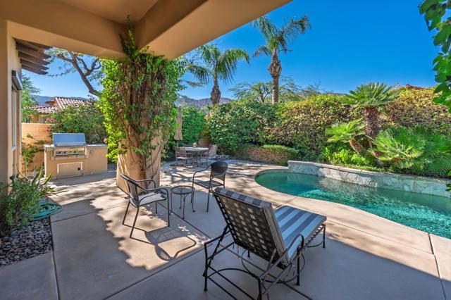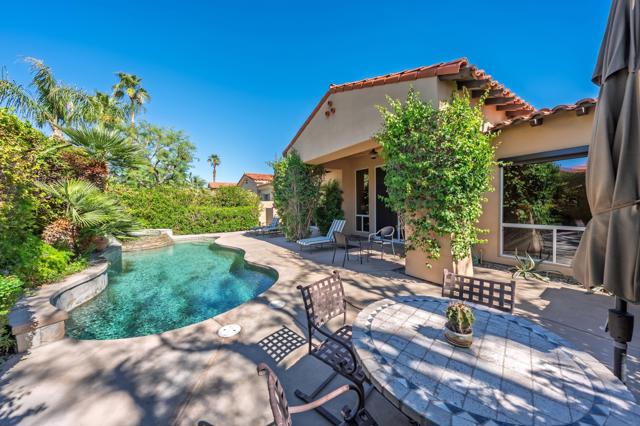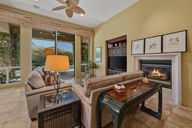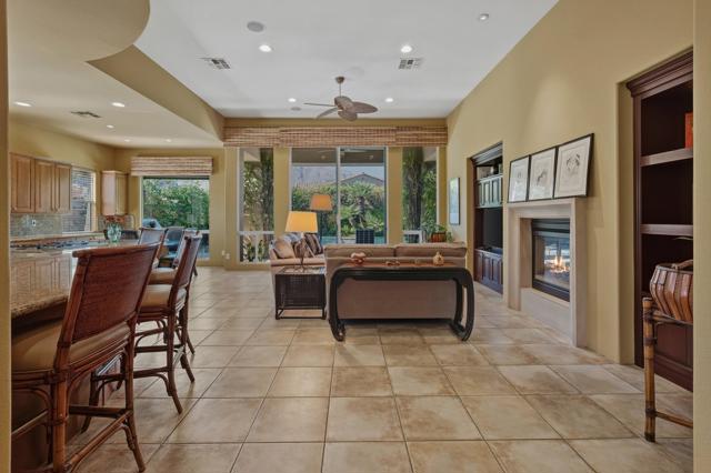 Discover Haciendas at La Quinta, an exclusive enclave of meticulously crafted homes by Sedona Homes, steps from the vibrant restaurants, shops, and live music of the iconic La Quinta Resort. Nestled near scenic hiking and biking trails, this corner-lot gem offers a serene, private backyard oasis with a pool, raised spa, built-in BBQ, and expansive covered patio perfect for dining and lounging. Inside, the spacious kitchen boasts abundant storage, stainless steel appliances, including a double oven and beverage center, a dining area, and an island breakfast bar. The adjacent great room, featuring a fireplace, built-in cabinetry, automatic shades, and a wall of glass, seamlessly connects to the outdoor entertaining space. A versatile dining room with built-in buffet and bookcases currently serves as a cozy den. The primary bedroom, with backyard access and a built-in desk, includes a luxurious bath with dual vanities, a dressing area, separate tub and shower, and a walk-in closet with extensive storage. The second bedroom offers a bath with a walk-in shower, while the casita, currently an office, features a fireplace, wet bar, beverage center, and another bath with a walk-in shower. A flexible bonus room off the spacious laundry room doubles as an office, den, or additional bedroom. Completing the layout is a two-car attached garage. The low $360 monthly HOA fee covers gated entry and common areas.