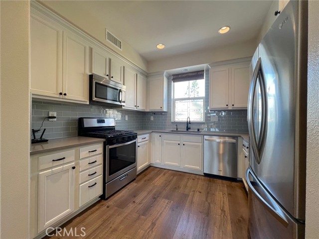 Spacious 1 Bedroom 1 1/2 Bathroom Townhome with many upgrades. The home features high ceilings, LVP flooring, recessed lighting, upgraded kitchen with stone countertops, includes stainless steel appliances, stackable washer/dryer included, living room with access to the balcony, spacious bedroom suite with en-suite bathroom and walk in closet, central ac & heating, 1-car attached garage with direct access.
