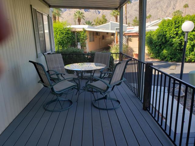 Location, Location, Welcome to Ramon Mobile Home an active 55+community, close to Ralph's Shopping Center, and within one mile of downtown Palm Springs and 3 miles to Palm Springs International Airport. This 2 Bedroom, 2 Bath mobile is perfect for those seeking a vacation getaway or a year-round residence. Incredible mountain views from the large covered Trex deck for entertaining or having your morning coffee or evening wine. It is being sold furnished so you can enjoy the resort lifestyle of Palm Springs. Residents enjoy many amenities, including a sparkling pool and spa, a clubhouse for social events shuffleboard courts, a library and exercise room. The kitchen has been updated with newer appliances including a dishwasher, built in microwave and a newer washer /dryer with many cabinets. It has a large island counter that opens up into the living room. The electrical system has been totally updated with a warranty. The main bedroom has a slider and a bath with a shower. The second bedroom is currently being used as an office. and the bathroom has a tub/shower. There is an evaporative cooler as well as central air and heat. The parking area is covered and can accommodate two vehicles tandem, with a storage shed. Mobiles can be rented for a minimum of 30 days with park approval. All buyers to qualify to purchase.