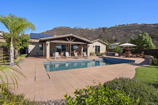 This stunning single-story home in the highly sought-after Sky Ranch community of Santee offers the perfect blend of luxury, comfort, and California outdoor living. Situated on a desirable corner lot, this 4-bedroom, 3-bath home spans over 3,000 sq. ft. of thoughtfully designed space. The resort-style backyard is truly one of a kind—designed to entertain, relax, and take in the incredible sunset views. Enjoy the heated pebble-finish pool, jacuzzi and gas fireplace, all surrounded by stunning landscaping. The extended patio cover feels like an outdoor living room, complete with mounted restaurant-style heaters and motorized patio shades —ideal for year-round enjoyment. Step inside to discover an open and inviting floor plan featuring a spacious primary suite with a walk-in closet you’ll fall in love with and a spa-inspired ensuite bath. The updated gourmet kitchen boasts a large island, walk-in pantry, and modern finishes—perfect for entertaining and everyday living. Additional highlights include bamboo wood flooring, an EV charger, tankless water heater, new HVAC system, and both pool and home solar for energy efficiency. This home has it all—modern upgrades, smart features, and a backyard built for making memories. Don’t miss the chance to own one of Sky Ranch’s most impressive single-story homes!