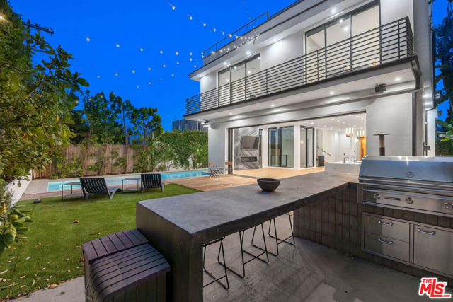 Experience modern luxury in this custom-built Beverly Grove home, designed with open-concept living and seamless indoor-outdoor flow. The main level features soaring ceilings, expansive windows, and a sleek open floor plan connecting the kitchen, dining, and living areas. A full-height sliding pocket door opens to a private backyard oasis complete with a built-in BBQ and a wraparound pool that elegantly frames the home.The lower level is an entertainer's dream, featuring a full bar, movie theater, wine display, and a guest bedroom offering exceptional privacy and natural light.Upstairs, retreat to a grand primary suite with dual walk-in closets and a luxurious spa-style bathroom with soaking tub and double vanity. Secondary bedrooms include en-suite baths and generous closets.Top it all off with a spacious rooftop deck showcasing panoramic views from Downtown Los Angeles to Century City, complete with gas fire pits and built-in lines for entertaining.