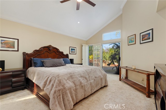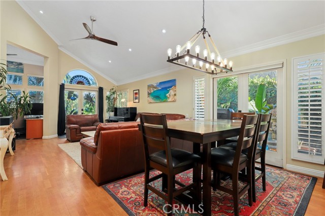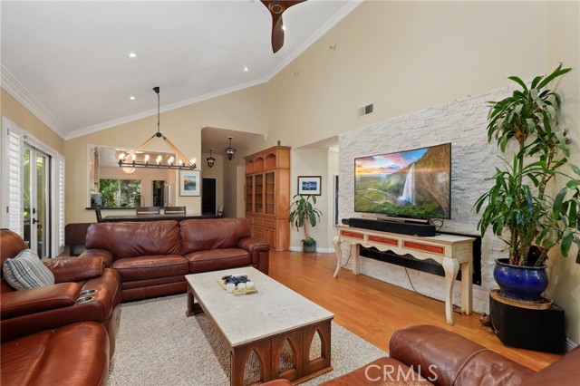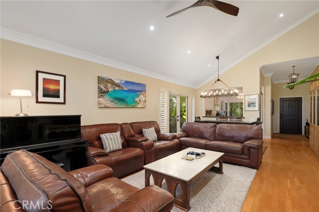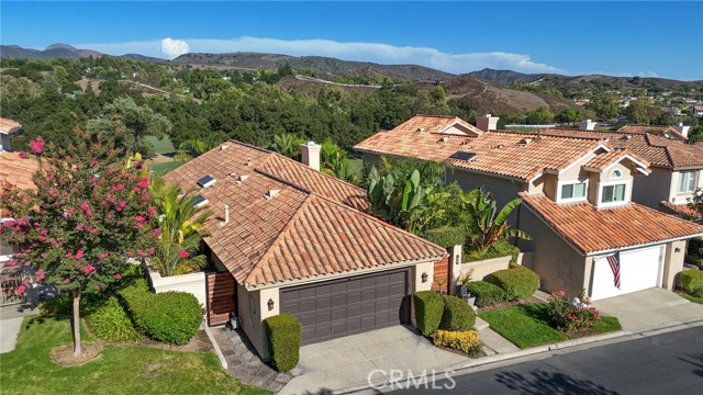 Welcome to 90 Via Candelaria, a truly rare offering in the prestigious gated community of Coto de Caza. One of only 30 single-story ranch-style homes in the entire community, this residence stands out in both exclusivity and design. Ideally located on the northern side of Coto, it is just minutes from the RSM shopping plaza and Coto Sports Park. With no homes in front or behind, the property offers unmatched privacy, serenity, and sweeping 180-degree views of the golf course, lake, Saddleback Mountains, and Caspers Wilderness Park. Evenings are especially magical, with no light pollution and the rare chance to stargaze under open Orange County skies. Inside, the home showcases vaulted ceilings, real hardwood floors, recessed LED lighting, and ceiling fans in every major room. The living area features a custom white tile wall with an electric fireplace, complete with built-in speaker wiring and TV mount. The kitchen is appointed with freshly painted white cabinetry, stainless steel appliances, and new lighting. The primary suite includes sliding doors to the backyard oasis, crown molding, dual sinks, a walk-in shower, and custom lighted bathroom mirrors. Additional enhancements include automated irrigation, custom front gates, upgraded hallway and bathroom lighting, and a pet-friendly backyard fence with a stone path leading directly to the golf course. The highlight of this home is the spectacular backyard, where over $150,000 has been invested in creating a tropical paradise. The landscape features more than 100 palm trees—including 40+ rare species sourced from across California. These palms have been grandfathered in, making this the only property in the Terraces permitted such plantings. Fruit-bearing lemon, orange, lime, and apple trees add to the lush setting. Bamboo fencing, layered palms, and LED flame solar lighting complete the oasis, offering shade by day and ambiance for evening entertaining. Residents of the Terraces enjoy a private pool and spa, while Coto de Caza offers world-class amenities including the Golf & Racquet Club with tennis, pickleball, pools, spas, dining, and fitness center, as well as equestrian facilities, a sports park, and miles of scenic trails. More than a home, 90 Via Candelaria is a rare single-story retreat offering privacy, exclusivity, and natural beauty in the heart of Coto de Caza.
