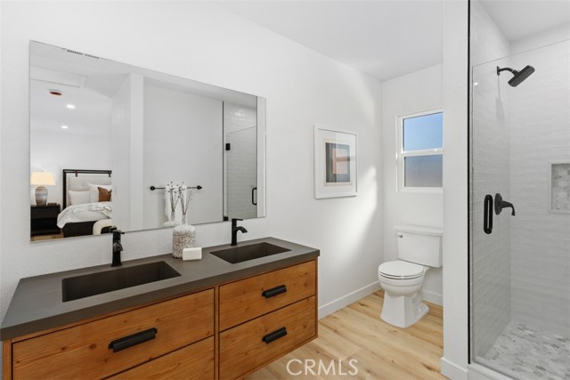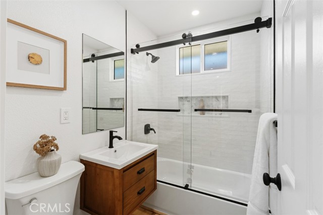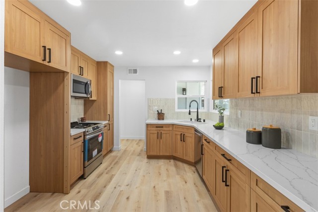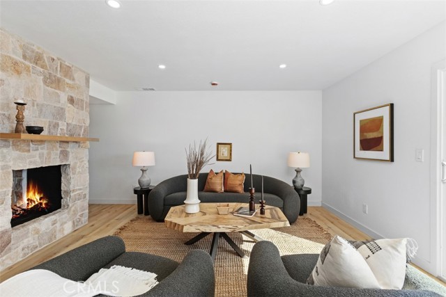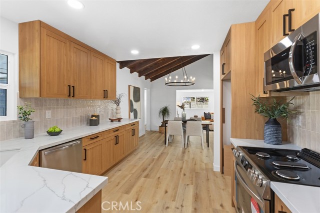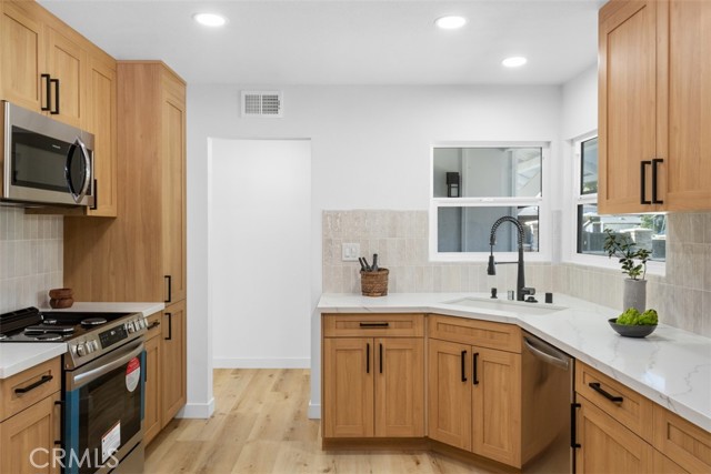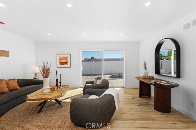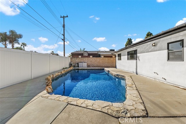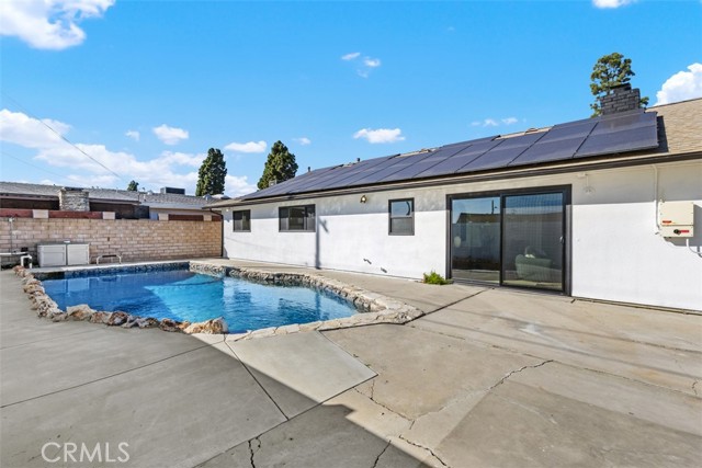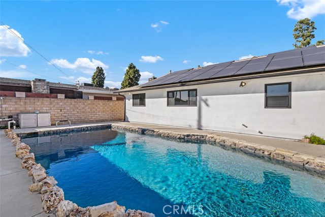 **Orange County with a La Mirada mailing address** Sunny Hills School District! Paid off solar! This turnkey, SINGLE LEVEL 4-bedroom, 2.5-bathroom residence has been thoughtfully updated throughout, blending modern design with everyday functionality. Upon arrival, you are greeted by an extra large driveway and fantastic curb appeal. Step inside to discover a light and bright floorplan with new luxury vinyl plank flooring, fresh interior paint, new windows and sliders with recessed lighting throughout. The fully remodeled kitchen features on-trend, natural wood style cabinetry, quartz countertops, and stone tile backsplash. In the adjacent dining area you find vaulted beamed ceilings and is open to a spacious living room, complete with a cozy fireplace, creating a warm and inviting atmosphere. Off the dining room is a convenient guest powder room and versatile den/lounge, perfect for a home office or play room. All bedrooms are generously sized with the primary suite featuring remodeled walk-in shower and double vanities. Down the hall is the remodeled secondary bathroom with a shower/tub combo. Yard with PebbleTec pool and low maintenance hardscape. Zoned for acclaimed Emery Elementary and Sunny Hills High School, this home is perfect for families, professionals, or anyone seeking a move-in-ready property in a quiet and friendly neighborhood with convenient access to schools, shopping, dining, and freeways.