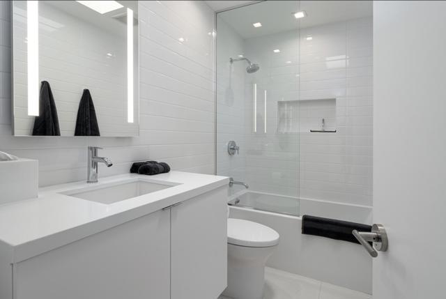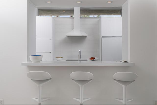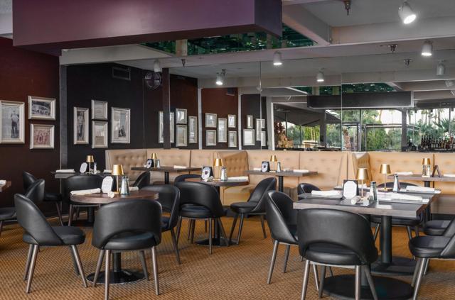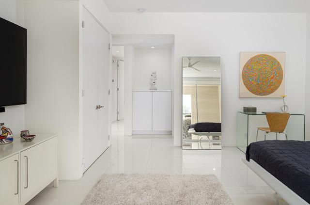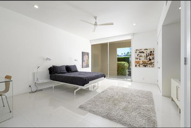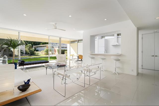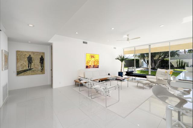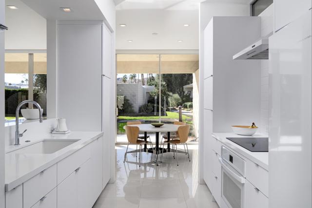 Step out of the warm desert sun and into the cool tones of a modernist getaway. This tranquil 2bed/2bath, in the desirable Seven Lakes Country Club, originally designed by Richard A. Harrison in 1967, has been thoughtfully reimagined as an elevated architectural gem. Inside its shadow-blocked walls, you'll be impressed by the home's minimalist style and spacious floor plan. Custom gallery walls display your personal artwork, while terrazzo tile flooring is highlighted with new lighting and ceiling fans throughout. The expanded new kitchen opens into the living and dining areas, adding a breakfast bar, with handsome Fisher & Paykel appliances blending into custom cabinetry and quartz counters. Walls of glass sliders lead to a green leisure terrace with views of mountains and iconic Southridge. The private courtyard, accessible from the living areas and secondary bedroom, is enclosed for maximum privacy and finished with new tile floors and dramatic landscape lighting. Spacious bedrooms offer sleek custom closets, including a built-in work from home space. Both bathrooms offer quartz counters, custom vanities and minimalist stacked tile walls. The primary has a large walk in shower and dual sinks with lit mirrors, while the guest bath has a Roman soaking tub. A new electric panel powers the Tesla EV charging station inside your covered parking. New roof, water softener and custom window coverings complete this perfect picture. Plus, your pool escape is just steps away. Past the 24-hour guarded gate, 'The Gem of the Desert' offers a unique elevated lifestyle with its Ted Robinson-designed 18-hole executive golf course, 15 pools and spas and lively William Cody designed clubhouse waiting to welcome you to its formal dining room, casual cocktail lounge and a terrace overlooking the famous Seven Lakes fountain. Welcome home!