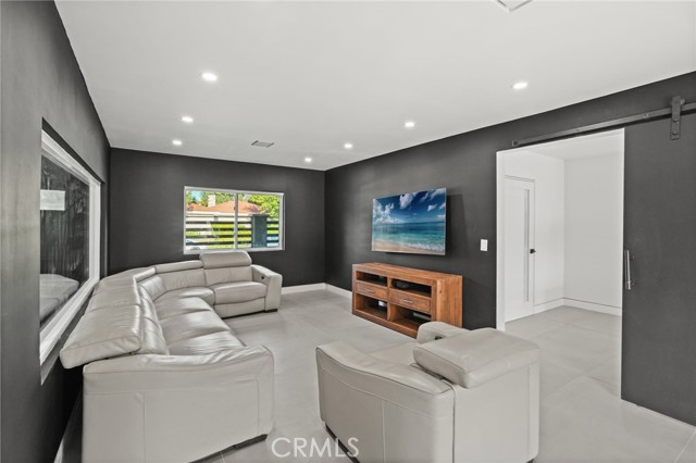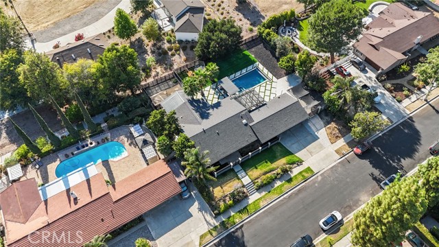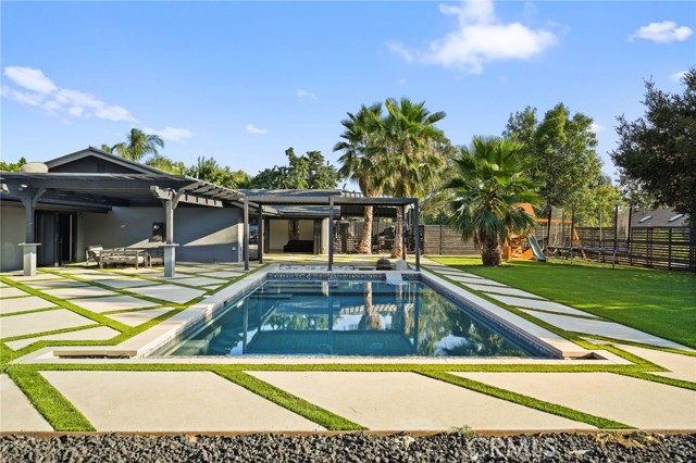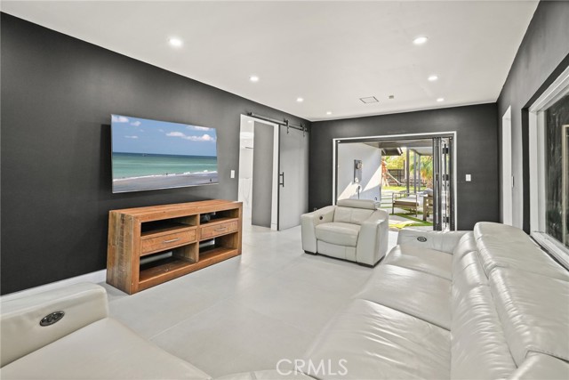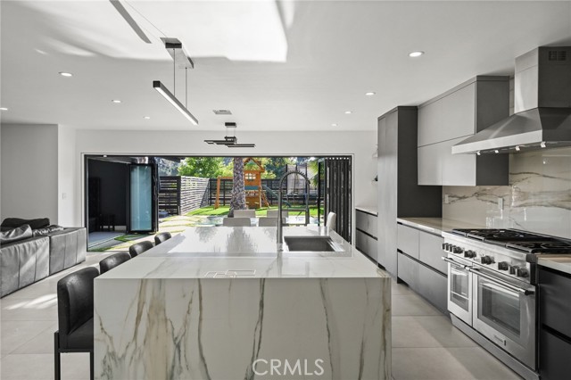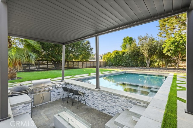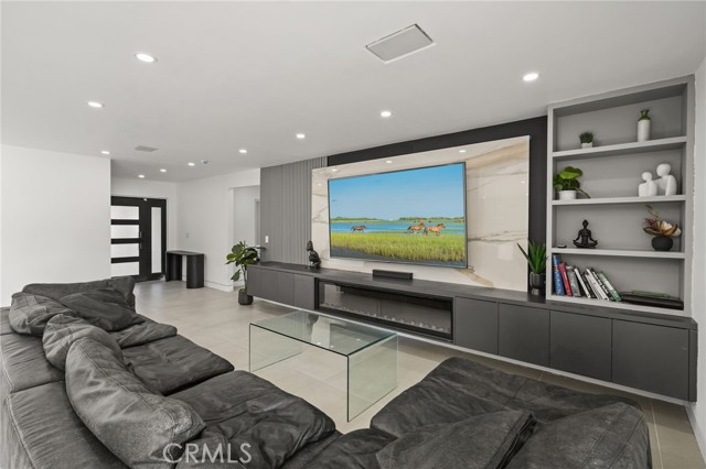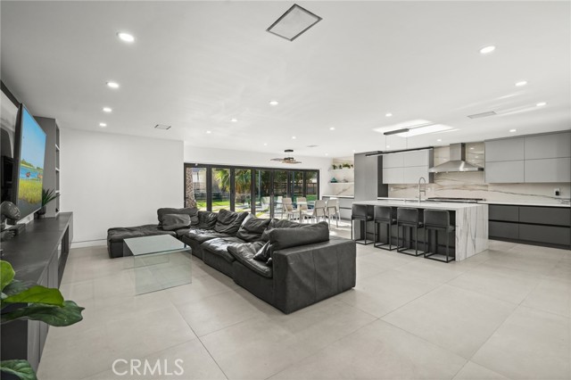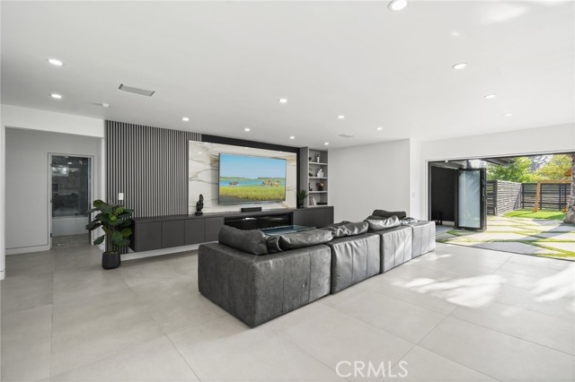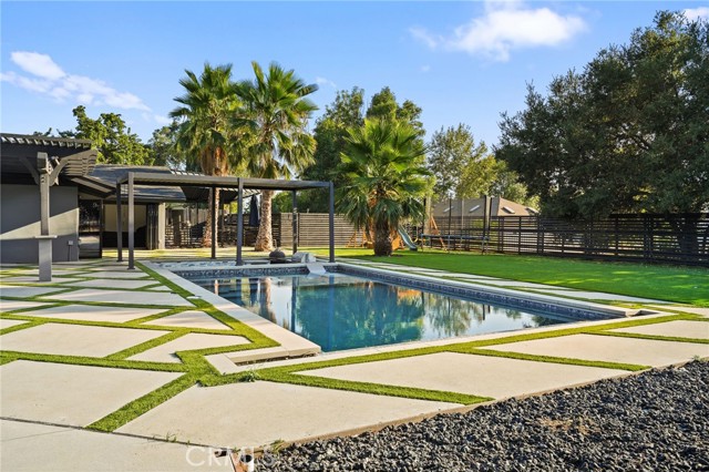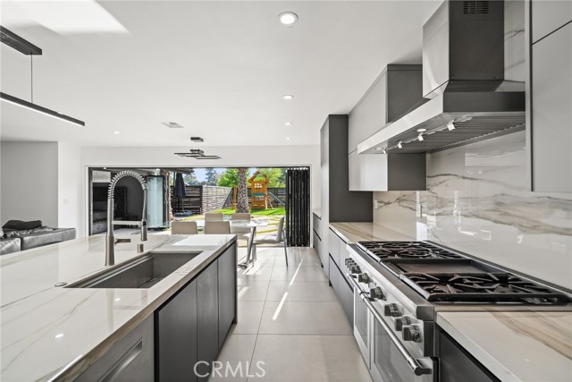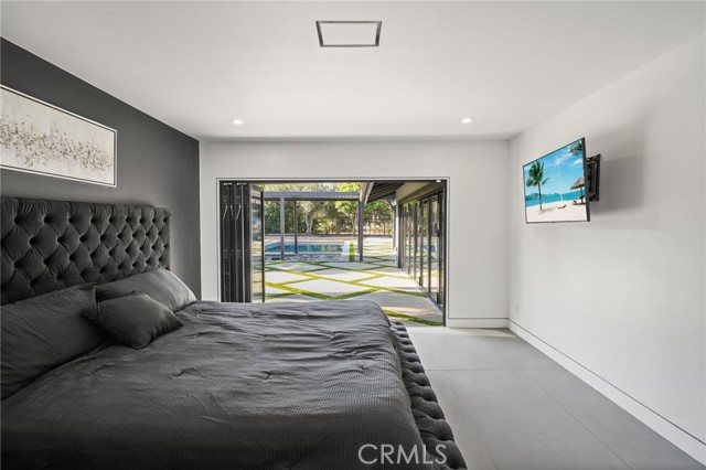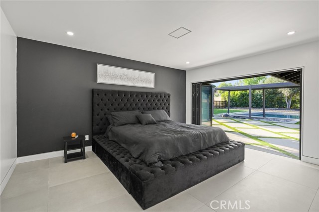 Picture-Perfect Modern Estate in Prime Chatsworth Neighborhood with ADU Potential! Welcome to this sprawling, single-story showpiece located in one of Chatsworth's most sought-after neighborhoods. Designed with a sleek, modern aesthetic, this minimalistic contemporary residence showcases minimalist interior finishes and exceptional craftsmanship throughout. Step into a seamless open floor plan where the living room impresses with a custom TV wall featuring built-in cabinetry, a dramatic slab backdrop, and a sleek electric fireplace. A full wall of windows floods the space with natural light, beautifully complementing the European grey tile floors, and modern finish throughout. The space flows effortlessly into a chef’s dream kitchen outfitted with a massive waterfall island, two-tone matte lacquer cabinetry, quartz countertops, and top-of-the-line Thermador appliances, including a built-in fridge and open shelving. Accordion-style glass pivot doors blur the lines between indoor and outdoor living, opening wide to reveal a resort-style backyard. Set on a massive, usable lot, the outdoor space is your private oasis, complete with modern landscaping, a sparkling pool and spa, sunken fire pit, built-in barbecue center with a Big Green Egg, and HUGE turf and concrete areas. The lot also includes RV access and ample space for an ADU. A dedicated pet-friendly area with privacy fencing ensures your furry friends have their own secure sanctuary. This 4-bedroom, 2.5-bathroom home features a luxurious primary suite reminiscent of a five-star resort. Enjoy serene backyard views through retractable accordion doors, and unwind in the spa-inspired en-suite bathroom adorned with 24”x48” porcelain tiles, black-veined accents, a massive walk-in shower with dual rain showers, and his-and-hers vanities. A spacious walk-in closet completes this dream retreat. Additional highlights include: Designer ocean-blue tiled guest bathroom with floating vanity and tub/shower combo. A private half bath in the fourth bedroom, perfect for guests or office use. Bonus family/media room adjacent to the kitchen, ideal for movie nights. 3-car garage with window views into the home and direct access to the living area. Whether you’re entertaining, relaxing, or envisioning future expansion with an ADU, this home delivers on every level. Don’t miss the opportunity to own this exceptional property in one of the Valley’s most desirable communities!