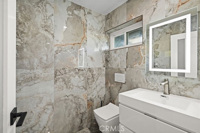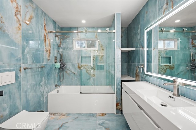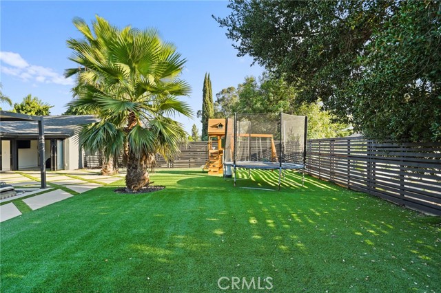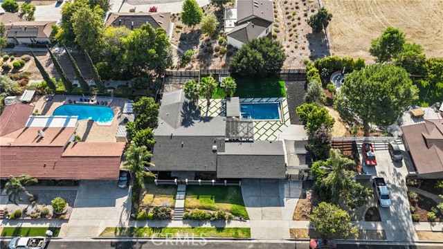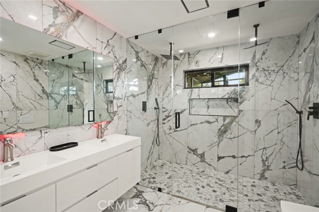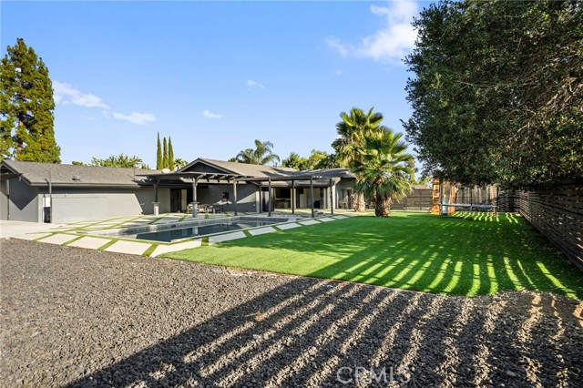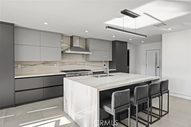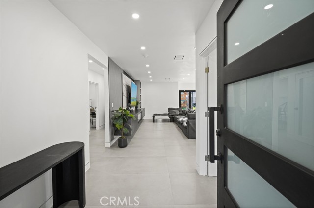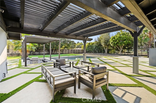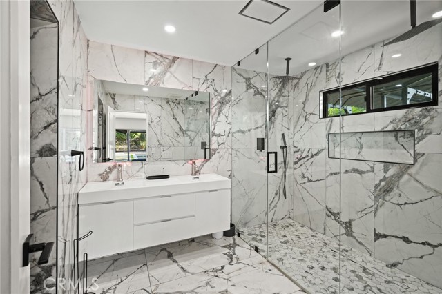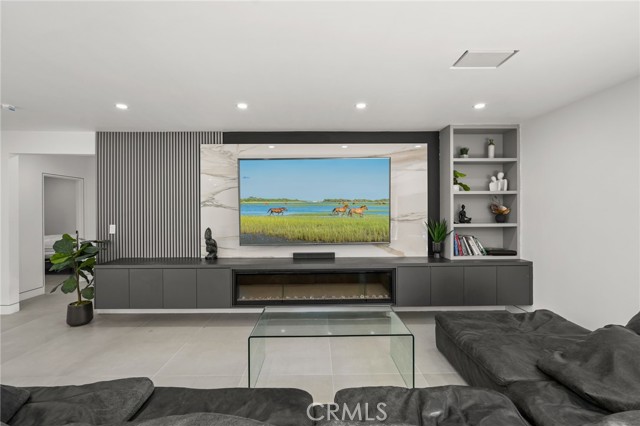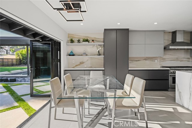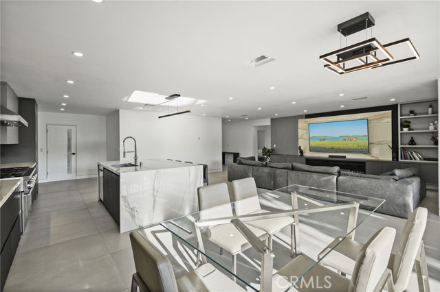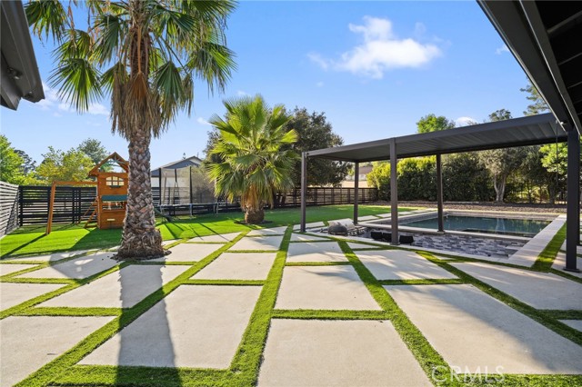 Picture-Perfect Modern Estate in Prime Chatsworth Neighborhood with ADU Potential! Welcome to this sprawling, single-story showpiece located in one of Chatsworth's most sought-after neighborhoods. Designed with a sleek, modern aesthetic, this minimalistic contemporary residence showcases minimalist interior finishes and exceptional craftsmanship throughout. Step into a seamless open floor plan where the living room impresses with a custom TV wall featuring built-in cabinetry, a dramatic slab backdrop, and a sleek electric fireplace. A full wall of windows floods the space with natural light, beautifully complementing the European grey tile floors, and modern finish throughout. The space flows effortlessly into a chef’s dream kitchen outfitted with a massive waterfall island, two-tone matte lacquer cabinetry, quartz countertops, and top-of-the-line Thermador appliances, including a built-in fridge and open shelving. Accordion-style glass pivot doors blur the lines between indoor and outdoor living, opening wide to reveal a resort-style backyard. Set on a massive, usable lot, the outdoor space is your private oasis, complete with modern landscaping, a sparkling pool and spa, sunken fire pit, built-in barbecue center with a Big Green Egg, and HUGE turf and concrete areas. The lot also includes RV access and ample space for an ADU. A dedicated pet-friendly area with privacy fencing ensures your furry friends have their own secure sanctuary. This 4-bedroom, 2.5-bathroom home features a luxurious primary suite reminiscent of a five-star resort. Enjoy serene backyard views through retractable accordion doors, and unwind in the spa-inspired en-suite bathroom adorned with 24”x48” porcelain tiles, black-veined accents, a massive walk-in shower with dual rain showers, and his-and-hers vanities. A spacious walk-in closet completes this dream retreat. Additional highlights include: Designer ocean-blue tiled guest bathroom with floating vanity and tub/shower combo. A private half bath in the fourth bedroom, perfect for guests or office use. Bonus family/media room adjacent to the kitchen, ideal for movie nights. 3-car garage with window views into the home and direct access to the living area. Whether you’re entertaining, relaxing, or envisioning future expansion with an ADU, this home delivers on every level. Don’t miss the opportunity to own this exceptional property in one of the Valley’s most desirable communities!