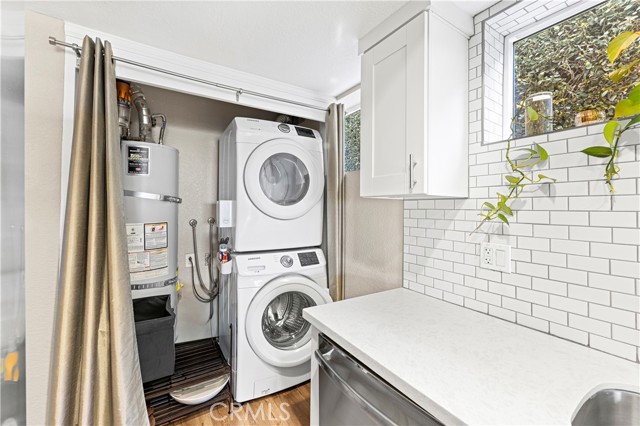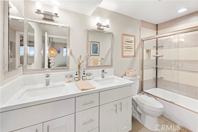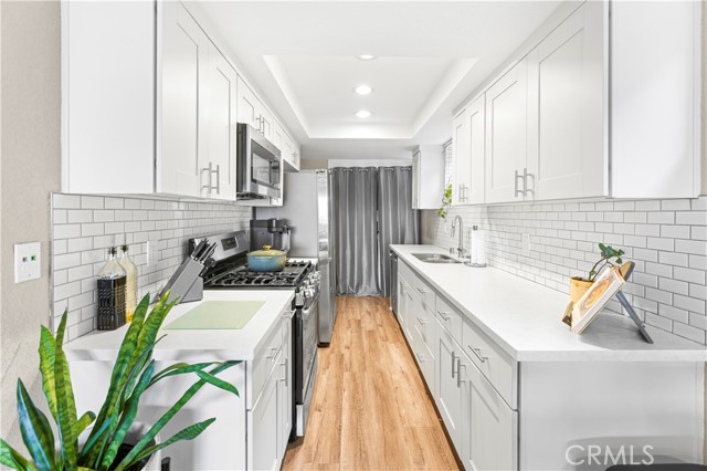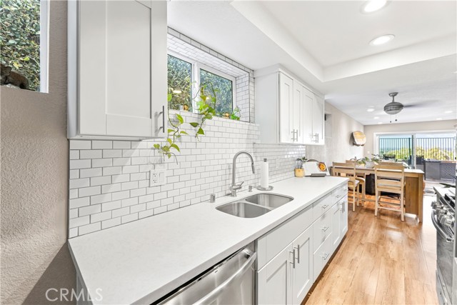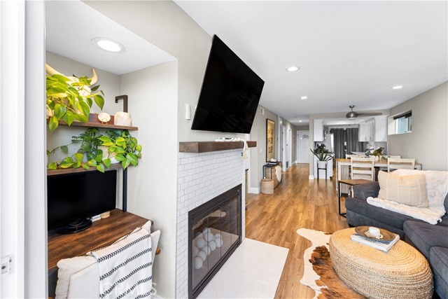 Welcome to this stunning, updated end-unit home designed for modern coastal living! Step through the private, gated entry and into a bright open floor plan featuring new contemporary wood laminate flooring, dual-pane windows, and designer touches throughout. The stylish kitchen boasts crisp white cabinetry, quartz countertops, and stainless steel appliances, opening seamlessly to the dining area and spacious living room—complete with a cozy fireplace accented with custom subway tile. Relax and entertain on your private patio while enjoying ocean breezes and panoramic views. Both bedrooms are generously sized and positioned on opposite sides of the home, ensuring comfort and privacy. The primary suite overlooks serene views and offers a beautifully remodeled ensuite bath with a dual-sink vanity and modern finishes. Additional highlights include in-unit laundry, a private garage, and a prime location close to trails, beaches, top-rated schools, shopping, and restaurants. Just steps from Fairview Park—perfect for outdoor adventures and summer concerts!