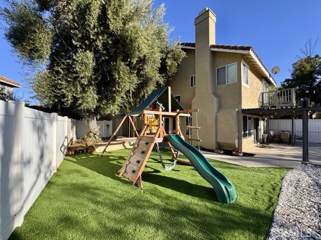 Welcome to this beautiful 4 bedroom, 3 bathroom home located in the desirable Malaguena community of Murrieta. This inviting residence offers an open and airy atmosphere, enhanced by abundant natural light streaming through numerous windows. The home features a blend of wood, tile, and carpet flooring throughout. Upon entry, you’re greeted by a cozy living room that flows seamlessly into the formal dining area, perfect for gatherings. Adjacent is the family room, complete with a fireplace and open access to the kitchen. The kitchen boasts dark cabinetry with ample storage, granite countertops, and a breakfast bar for casual dining. The main level also includes a bedroom, a full bathroom, and a convenient laundry room. Upstairs, you’ll find the remaining bedrooms and bathrooms, thoughtfully positioned for privacy. The spacious primary suite offers a peaceful retreat with its own fireplace, private balcony with scenic views, and an ensuite bathroom featuring dual sinks, a vanity, soaking tub, glass-enclosed shower, and a large walk-in closet. The backyard is ideal for relaxation and entertaining, featuring two separate covered patios, a firepit, artificial turf with rock landscaping, a playground, and beautiful surrounding views. Additional highlights include a three car garage and a prime location near freeway access, shopping, dining, and more, providing both comfort and convenience. Schedule a showing today and make this exceptional home yours!
