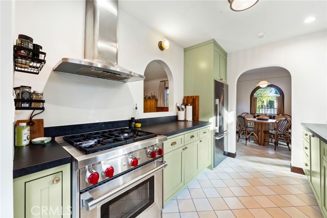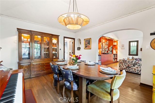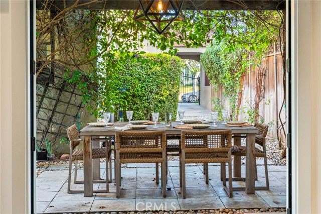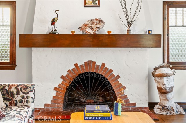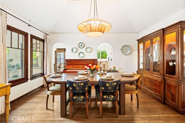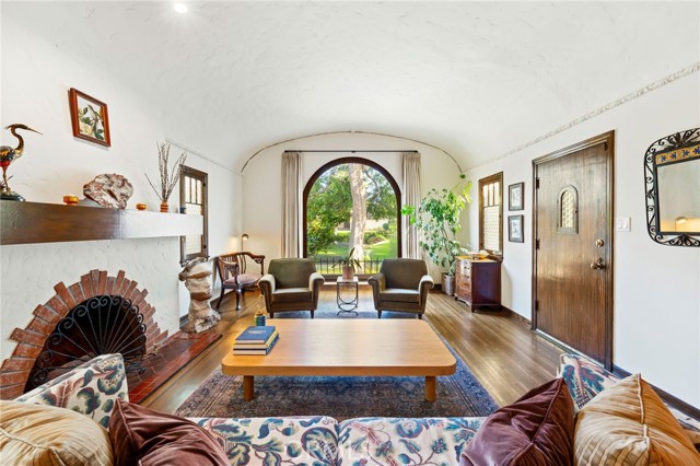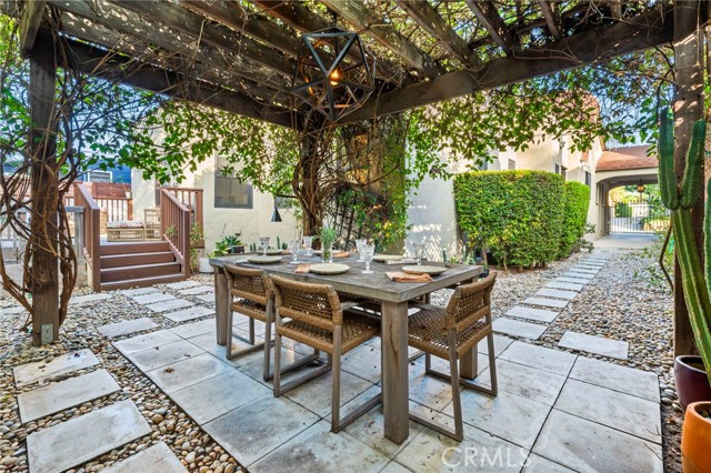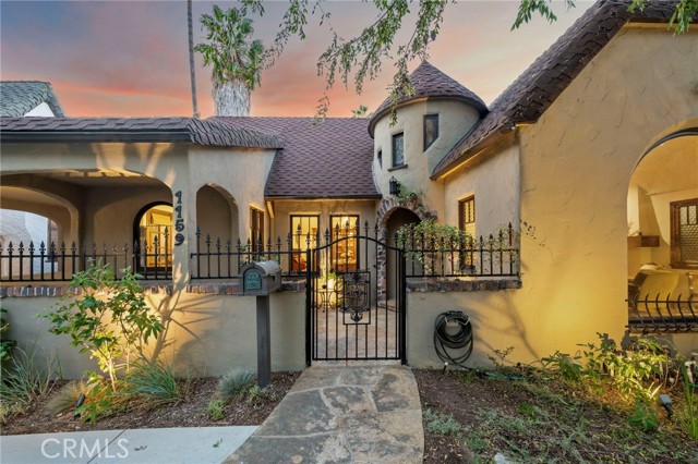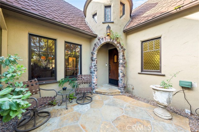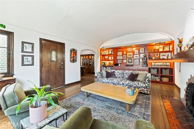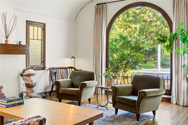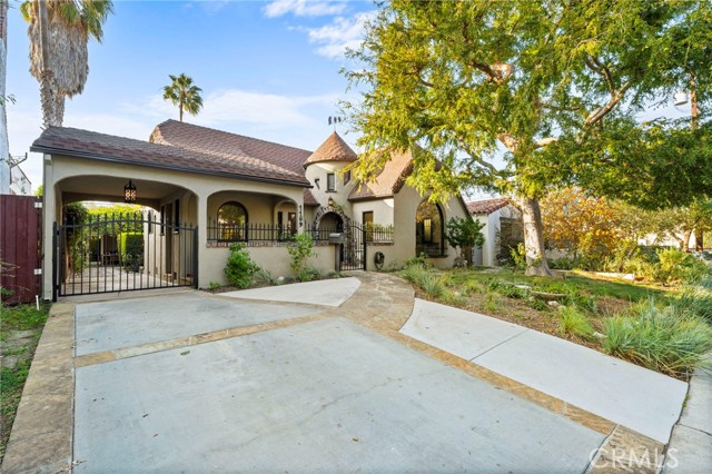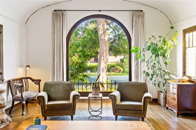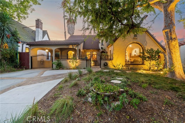 A stunning English Tudor Revival by celebrity designer Christos Prevezanos of Studio Preveza (AD, Vogue, Dwell, Forbes and more), complete with a fully built guest house. Set on tree-lined Sierra Bonita in Wilshire Vista, this home has been meticulously updated while honoring its historic character. Arrive to a steep gabled roofline, turret, and original stained glass window that features the address. Native landscaping by Studio Bakersfield creates a natural garden setting with no-mow grasses, a secret garden, waterlilies, and a vegetated swale. A rare double driveway leads through blooming vines to a private courtyard with iron gates. The original brick arch and wood front door with speakeasy window set the tone for what lies inside. The living room features restored crown moulding around a barreled ceiling, custom built-ins, refinished hardwood floors, and historic crown glass windows. A grand picture window frames the lush front yard and dramatic Chinese elm. The formal dining room offers soaring arched ceilings, custom lighting, and courtyard views. Arched openings carry you gracefully through the home. Newly added windows with custom treatments help frame surrounding greenery. A cozy breakfast nook with original built-ins leads to a chef-driven kitchen with hand-built cabinetry and hardware, Caesarstone counters, sealed Roca checkerboard tile, Fisher & Paykel, Wolf, Bosch appliances. The adjoining laundry room offers custom cabinetry and an LG stacked washer and dryer. The primary suite includes a custom closet and French doors to the recently rebuilt deck. The primary bath features herringbone tile, freestanding soaking tub, and walk-in shower. The guest bath offers penny tile, freestanding sink, and walk-in shower. The private backyard feels like a garden escape, with lemon and lime trees, jasmine, trumpet vines, and another mature Chinese elm creating a green canopy. Dine beneath a vine-covered pergola. The converted garage functions as a guest Casita with custom cabinetry, exposed beams, built-ins, sink, refrigerator, dishwasher, and full bath. Upgrades include full foundation waterproofing, extensive French drains, full security system. Exterior lighting highlights architecture and gardens at night. .2 miles to Sonoratown, MadLab Coffee, Bloom, and more. Near Museum Row, LACMA, The Grove, and 10 freeway. This is timeless Tudor architecture reimagined through a modern design-focused lens in one of the most sought-after pockets.