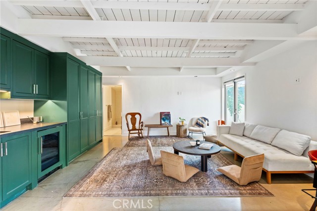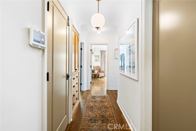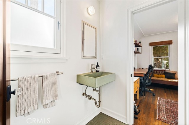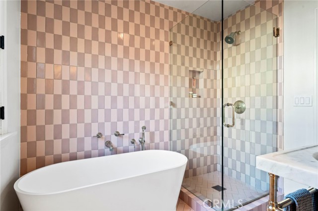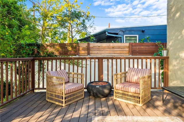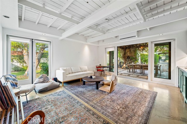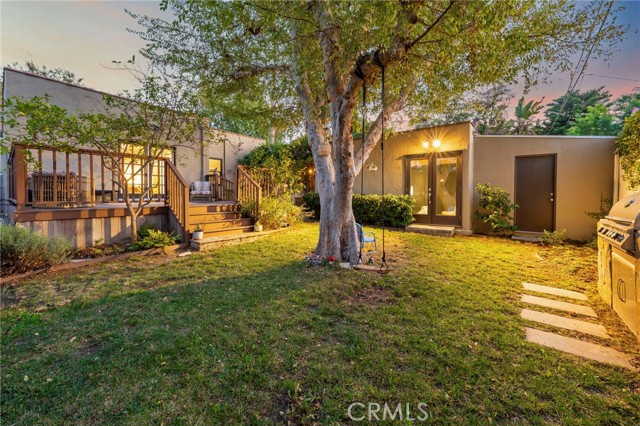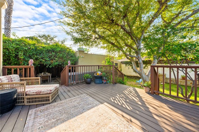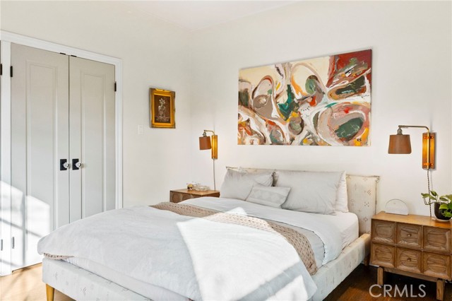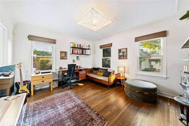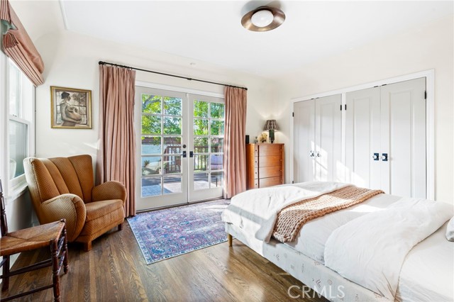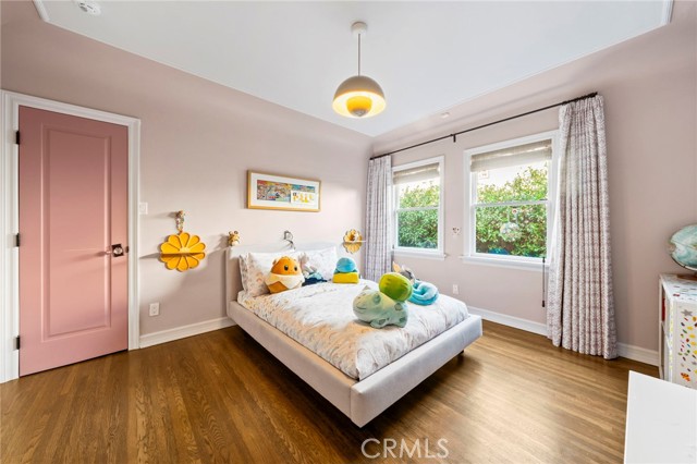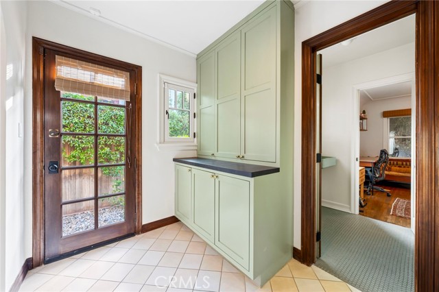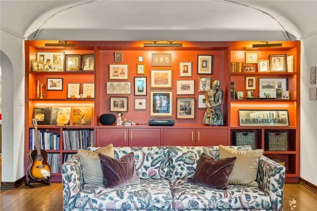 A stunning English Tudor Revival by celebrity designer Christos Prevezanos of Studio Preveza (AD, Vogue, Dwell, Forbes and more), complete with a fully built guest house. Set on tree-lined Sierra Bonita in Wilshire Vista, this home has been meticulously updated while honoring its historic character. Arrive to a steep gabled roofline, turret, and original stained glass window that features the address. Native landscaping by Studio Bakersfield creates a natural garden setting with no-mow grasses, a secret garden, waterlilies, and a vegetated swale. A rare double driveway leads through blooming vines to a private courtyard with iron gates. The original brick arch and wood front door with speakeasy window set the tone for what lies inside. The living room features restored crown moulding around a barreled ceiling, custom built-ins, refinished hardwood floors, and historic crown glass windows. A grand picture window frames the lush front yard and dramatic Chinese elm. The formal dining room offers soaring arched ceilings, custom lighting, and courtyard views. Arched openings carry you gracefully through the home. Newly added windows with custom treatments help frame surrounding greenery. A cozy breakfast nook with original built-ins leads to a chef-driven kitchen with hand-built cabinetry and hardware, Caesarstone counters, sealed Roca checkerboard tile, Fisher & Paykel, Wolf, Bosch appliances. The adjoining laundry room offers custom cabinetry and an LG stacked washer and dryer. The primary suite includes a custom closet and French doors to the recently rebuilt deck. The primary bath features herringbone tile, freestanding soaking tub, and walk-in shower. The guest bath offers penny tile, freestanding sink, and walk-in shower. The private backyard feels like a garden escape, with lemon and lime trees, jasmine, trumpet vines, and another mature Chinese elm creating a green canopy. Dine beneath a vine-covered pergola. The converted garage functions as a guest Casita with custom cabinetry, exposed beams, built-ins, sink, refrigerator, dishwasher, and full bath. Upgrades include full foundation waterproofing, extensive French drains, full security system. Exterior lighting highlights architecture and gardens at night. .2 miles to Sonoratown, MadLab Coffee, Bloom, and more. Near Museum Row, LACMA, The Grove, and 10 freeway. This is timeless Tudor architecture reimagined through a modern design-focused lens in one of the most sought-after pockets.